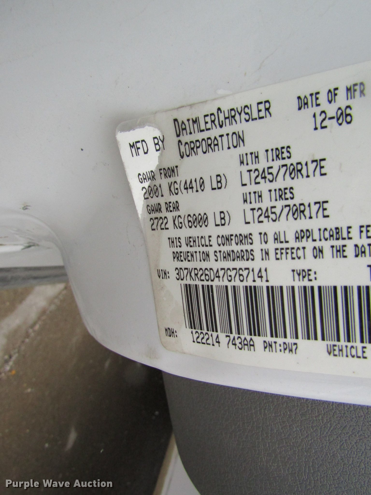 Purple Wave is selling a used 3/4 or 1 Ton Pickup or Van in Missouri. This item is a 2007 Dodge Ram 2500 pickup truck with the following: 181,183 miles on odometer, 5.7L V8 OHV 16V gas engine, Automatic transmission, AC and heat, Tilt, Cruise, AM/FM/CD, Manual windows and locks, Vinyl interior, Receiver hitch, Trailer wiring, 245/70R17 tires, Unit# 7994