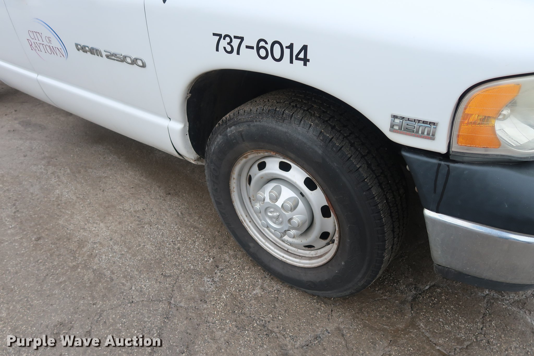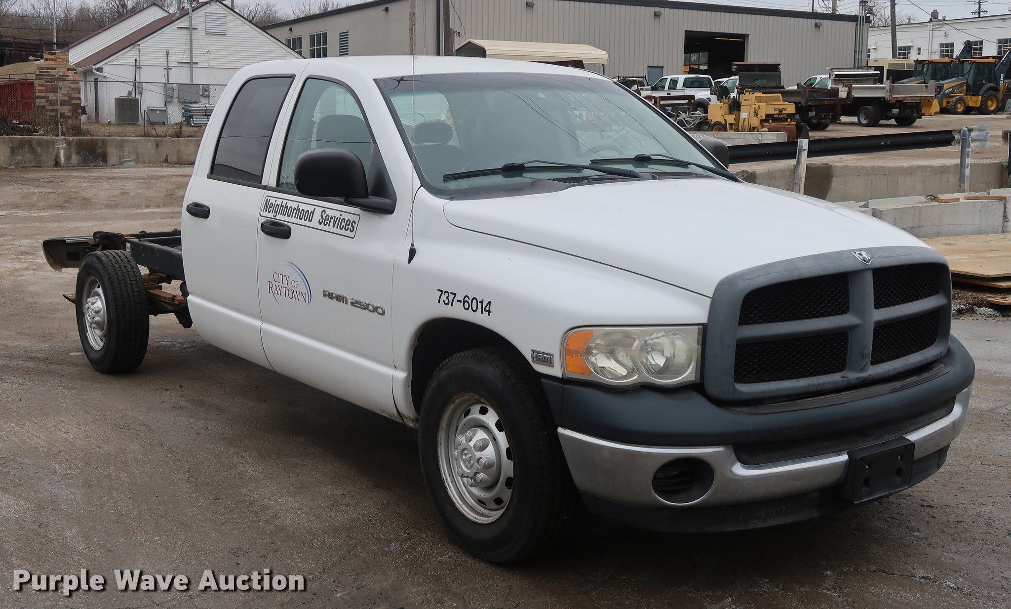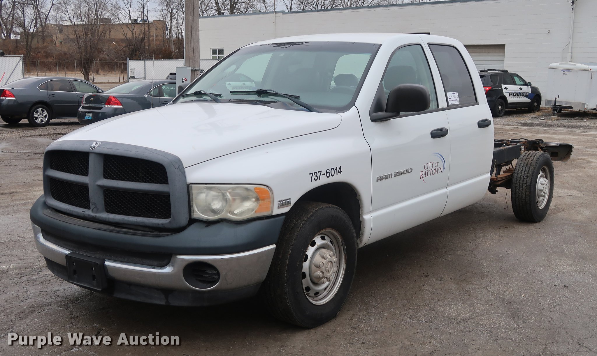 2004 Dodge Ram 2500 Quad Cab pickup truck cab and chassis. 102,426 miles on odometer, 5.7L V8 OHV 16V gas engine, Automatic transmission, AC and heat, Tilt, AM/FM, Vinyl interior, 245/70R17 tires, Cracked dash. Missouri title. 3D7KA28D64G206603. City of Raytown. 10014 E 65th St. Raytown, MO 64133