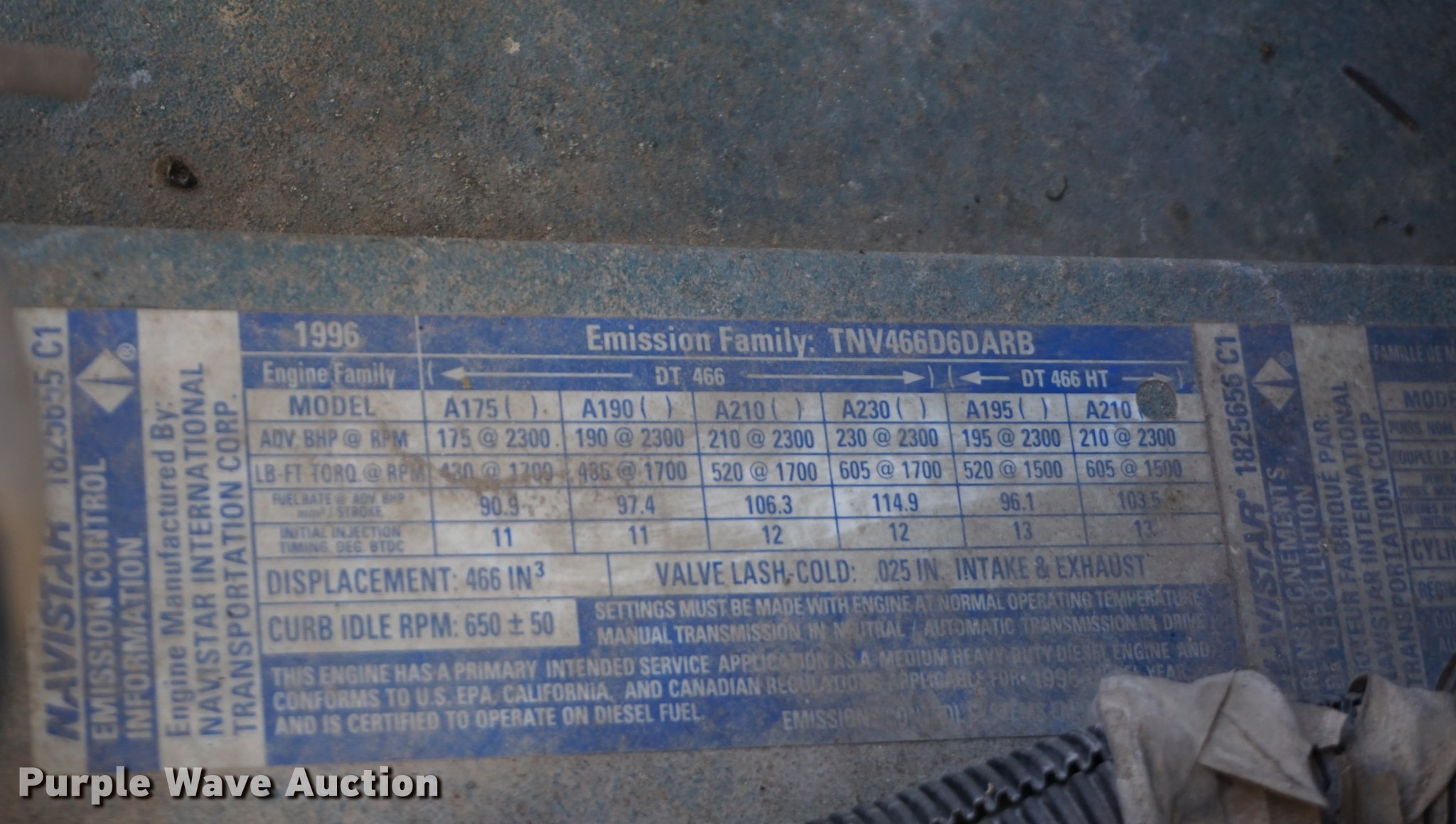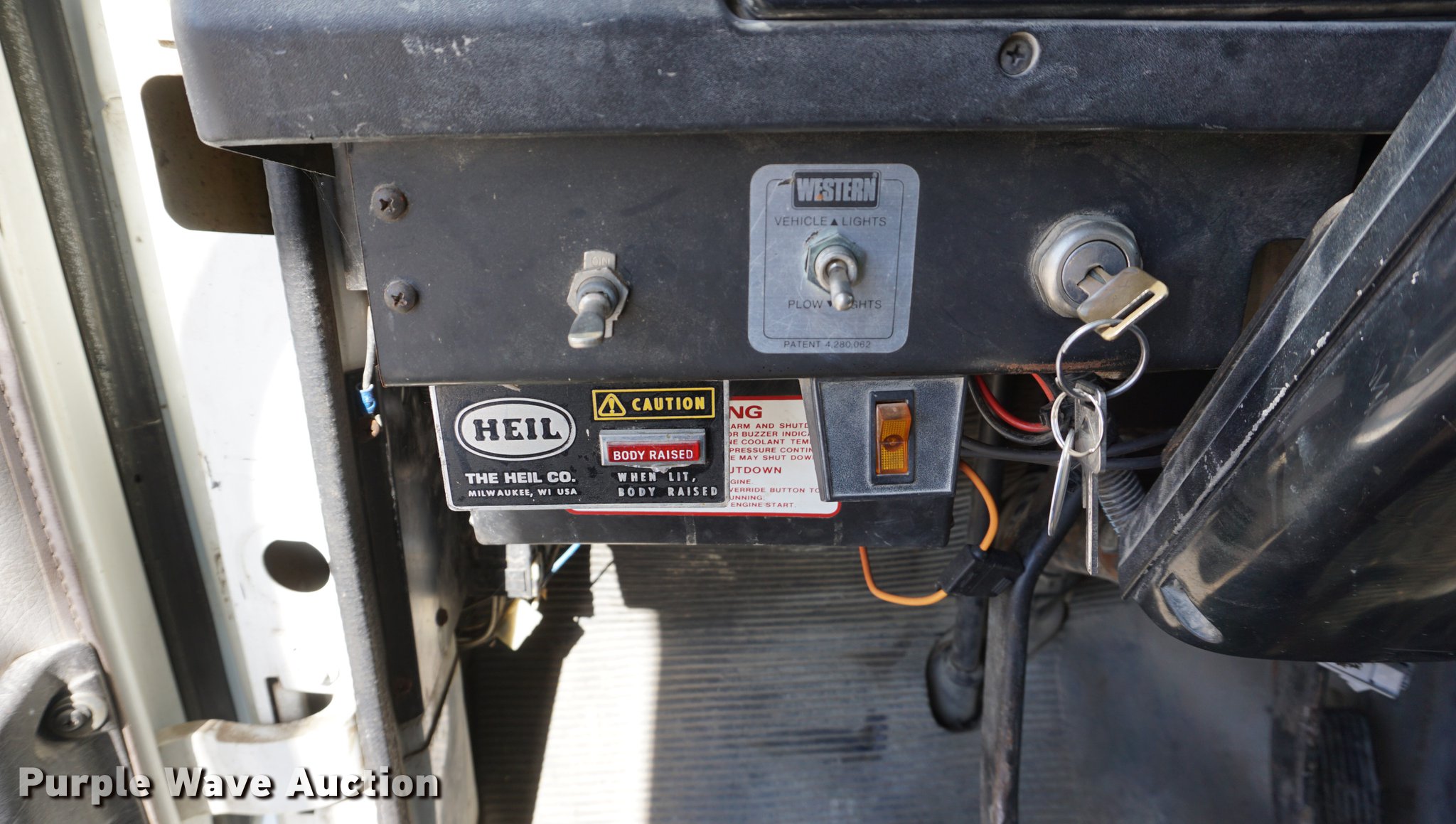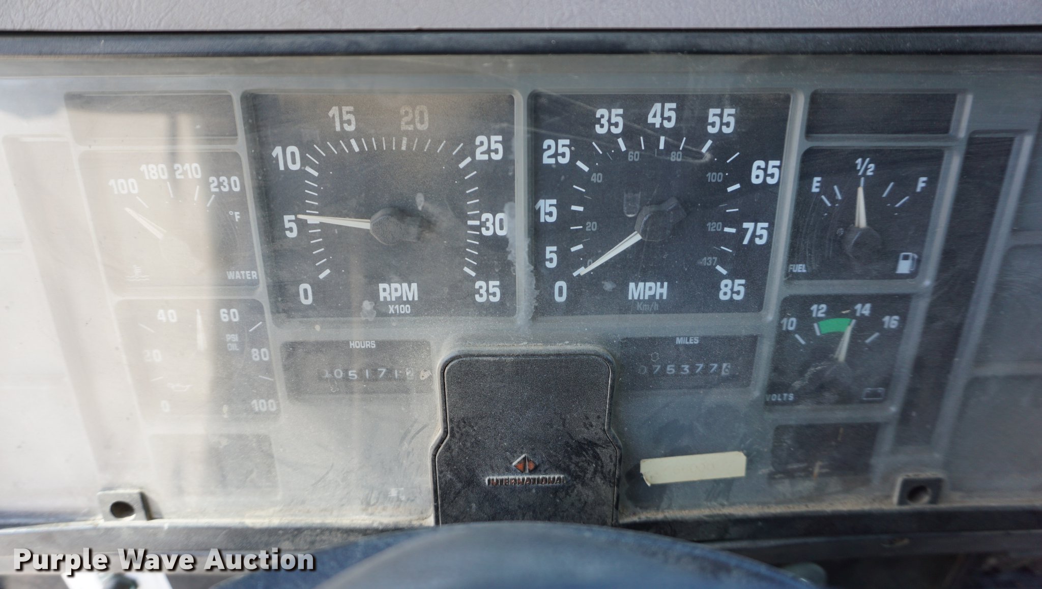 Purple Wave is selling a used Construction Dump Truck in Kansas. This item is a 1997 International 4700 dump truck with the following: 75,377 miles on odometer, 5,171 hours on meter, International DT466 7.6L L6 turbo diesel engine, 210 HP, Spicer five speed manual transmission, Two speed rear end, Single axle, Heat, AM/FM, Air suspension seat, Toolboxes, Front mounted PTO, Heil SL6YD10 steel dump bed, 10'L x 95"W, 28" side height, 10" side board height, Roll tarp, Single ram hoist, Manual end gate, Western VHW10 plow, 10'W, Single fuel tank, Pintle hitch, Spring suspension, Hydraulic brakes, 11R22.5 tires, Starter bendix needs to be repaired, Radio buttons and glass broken, Unit# PRK1426