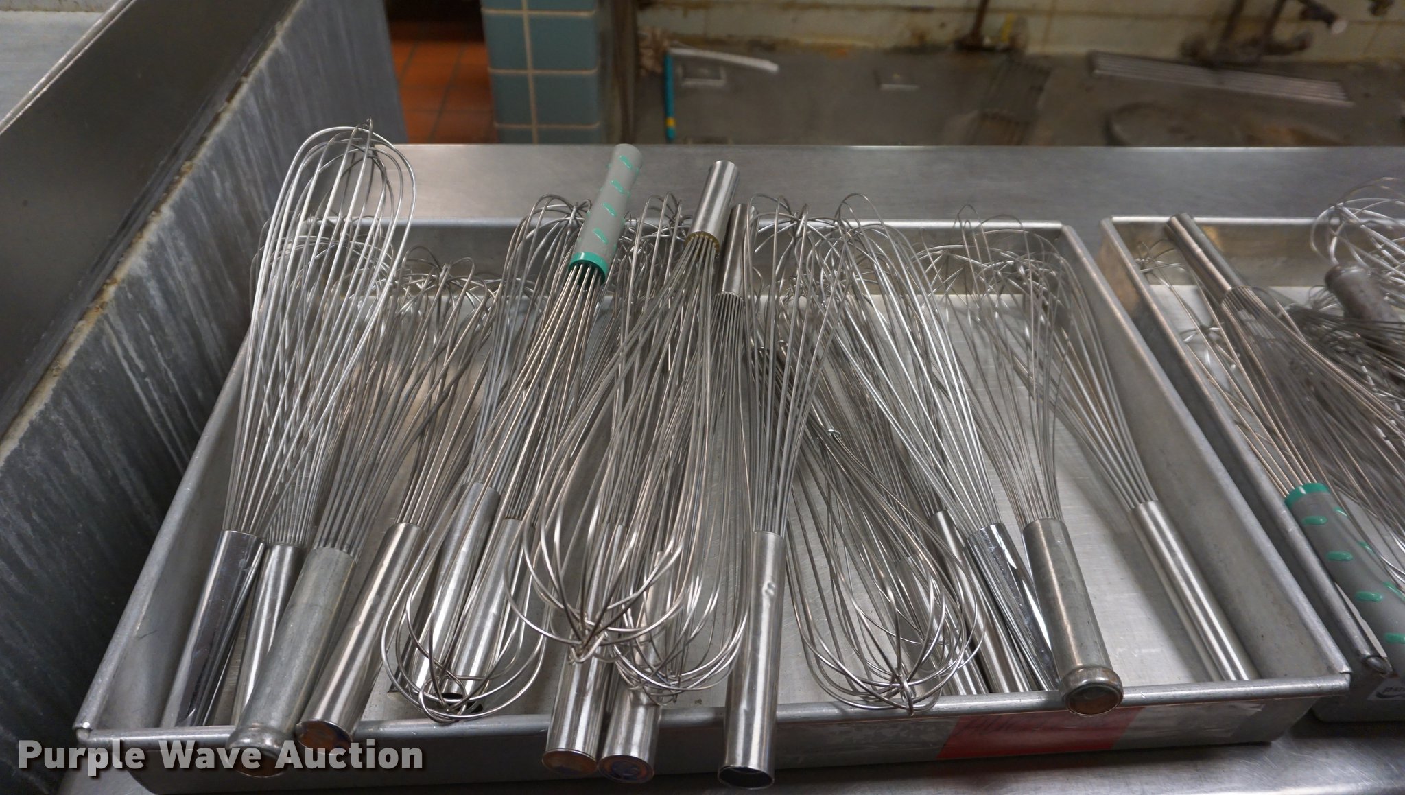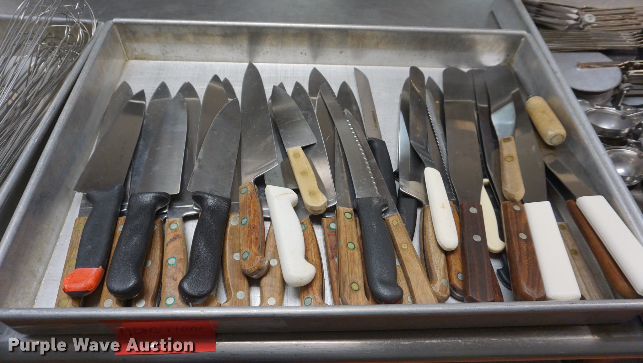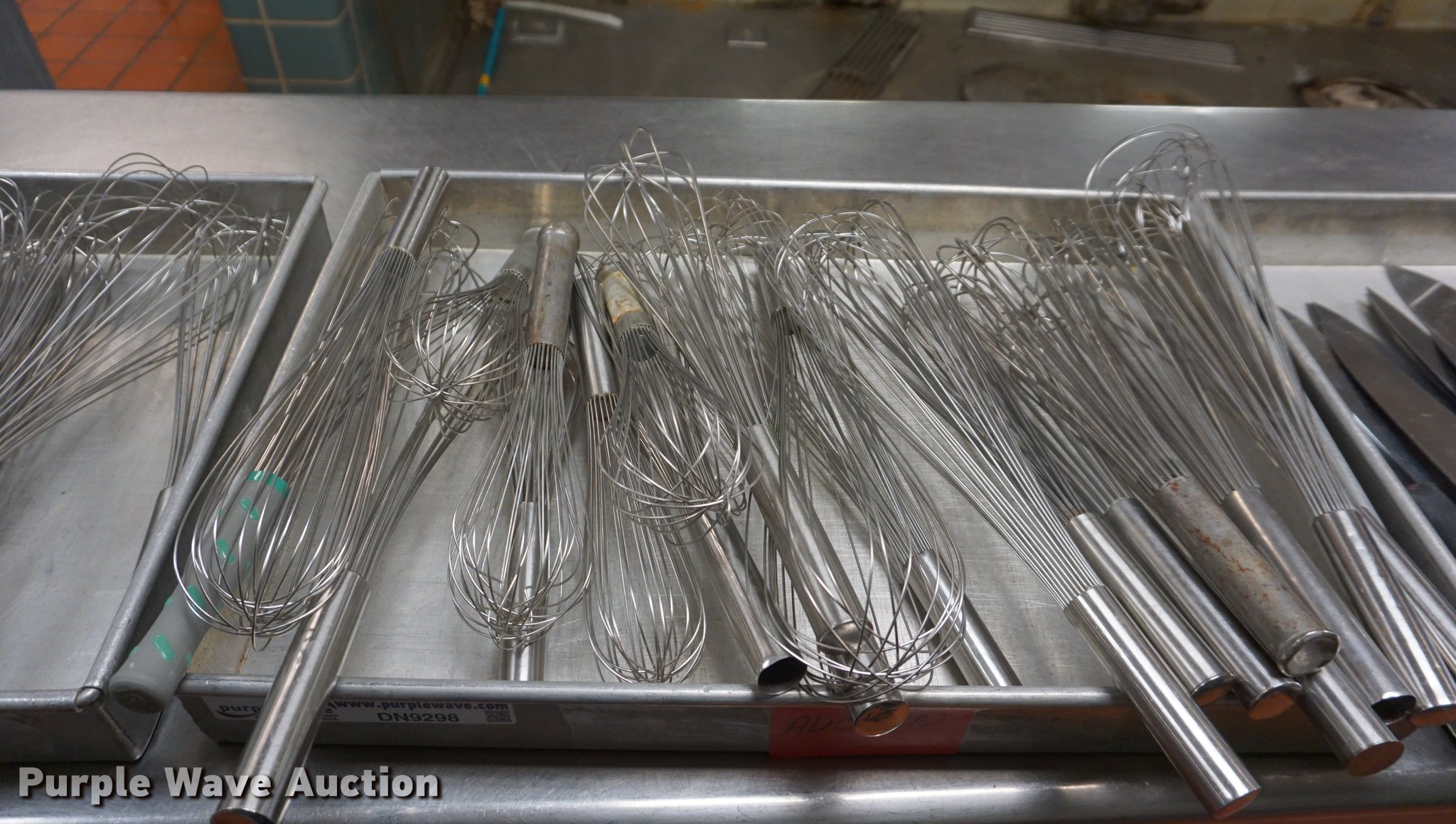 Purple Wave is selling a used Restaurant Equip. in Kansas. This item is a Restaurant equipment with the following: (18) pans, 24" x 16", (43) whisks, (20) kitchen knives, (7) cake markers, (18) ice cream scoops, (4) ice scoops and more
