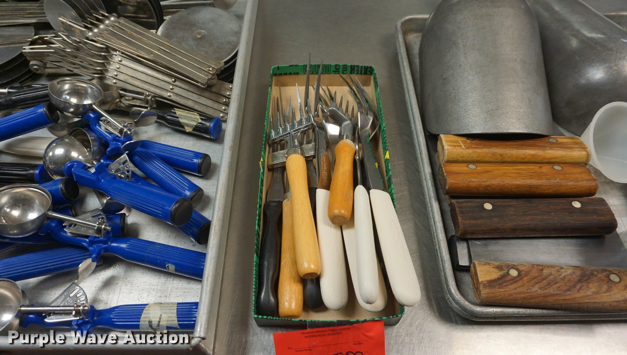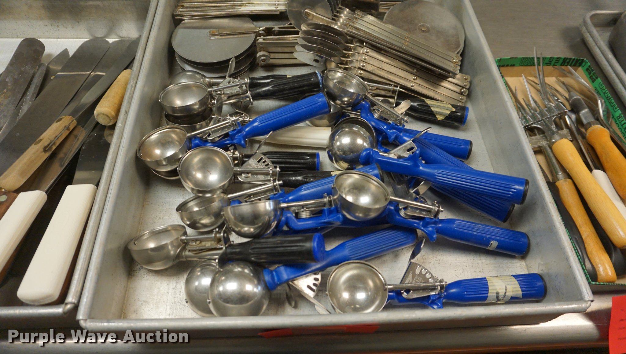 Restaurant equipment. (18) pans 24" x 16", (43) whisks, (20) kitchen knives, (7) cake markers, (18) ice cream scoops, (4) ice scoops and more. Shawnee Mission School District. 6701 W 83rd St. Overland Park, KS 66204