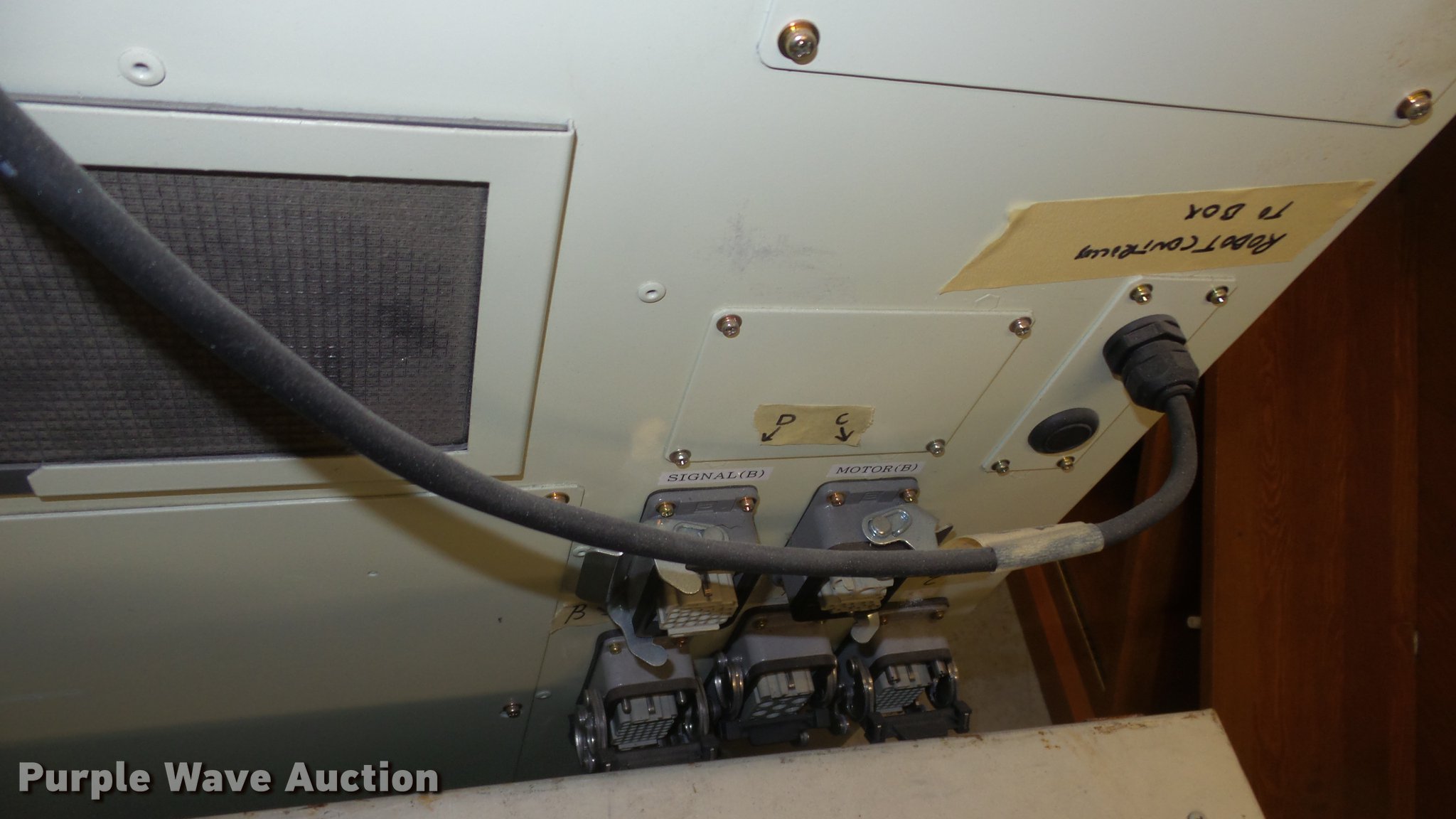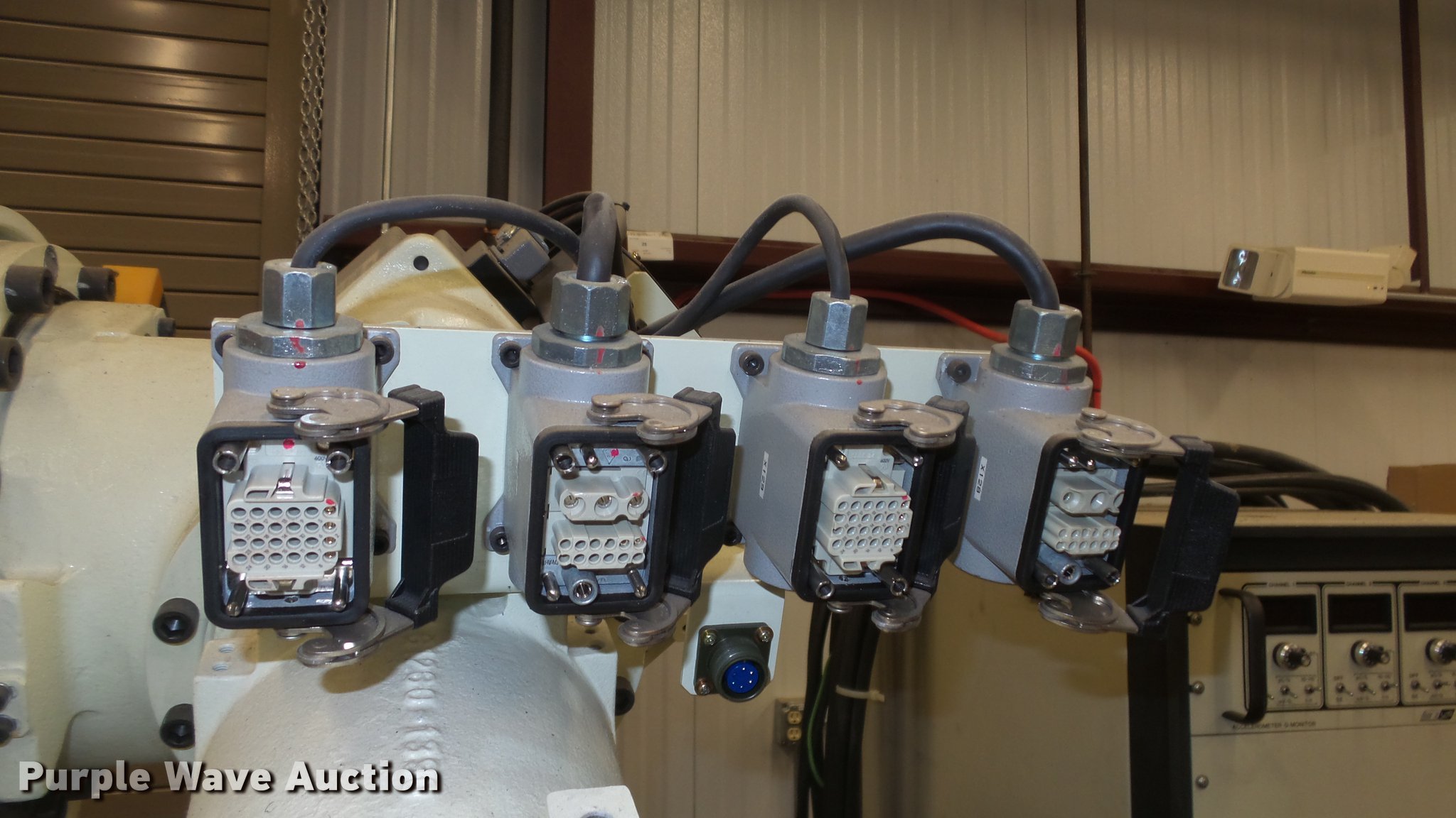 2005 Kawasaki ZX200S robot. 200 Kg payload, 2,651 mm reach, 1,400 kg unit weight, D32 controller, 8-axis, Wiring, Accessories , Three phase, NMB digital peak holder, Unknown operating condition, Serial ZX2000764. Wichita State University. 1845 Fairmount St. Wichita, KS 67260