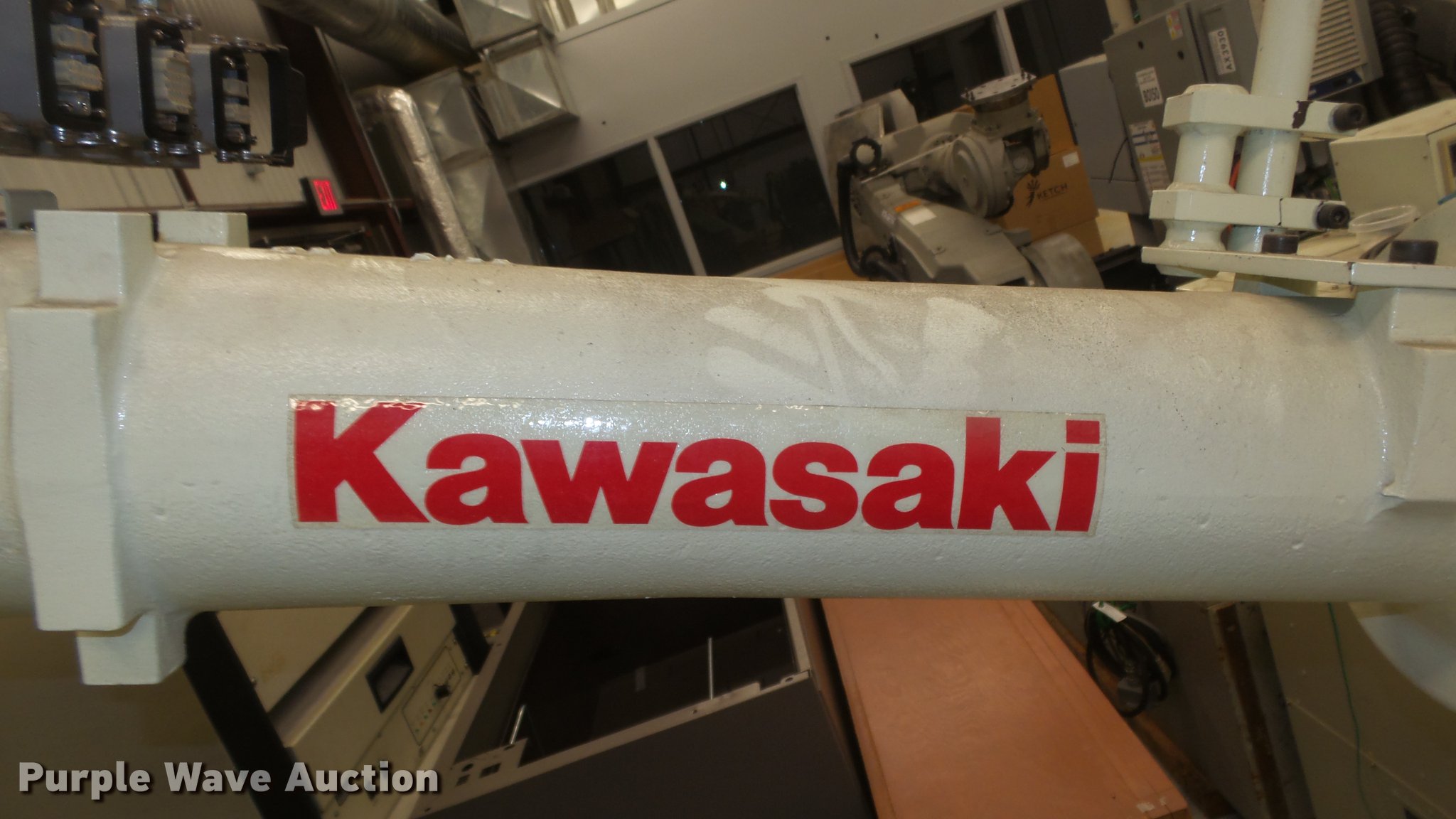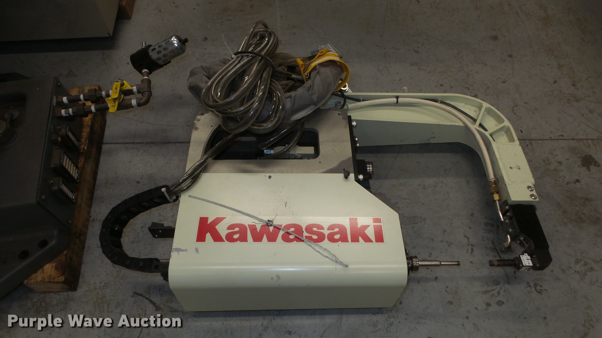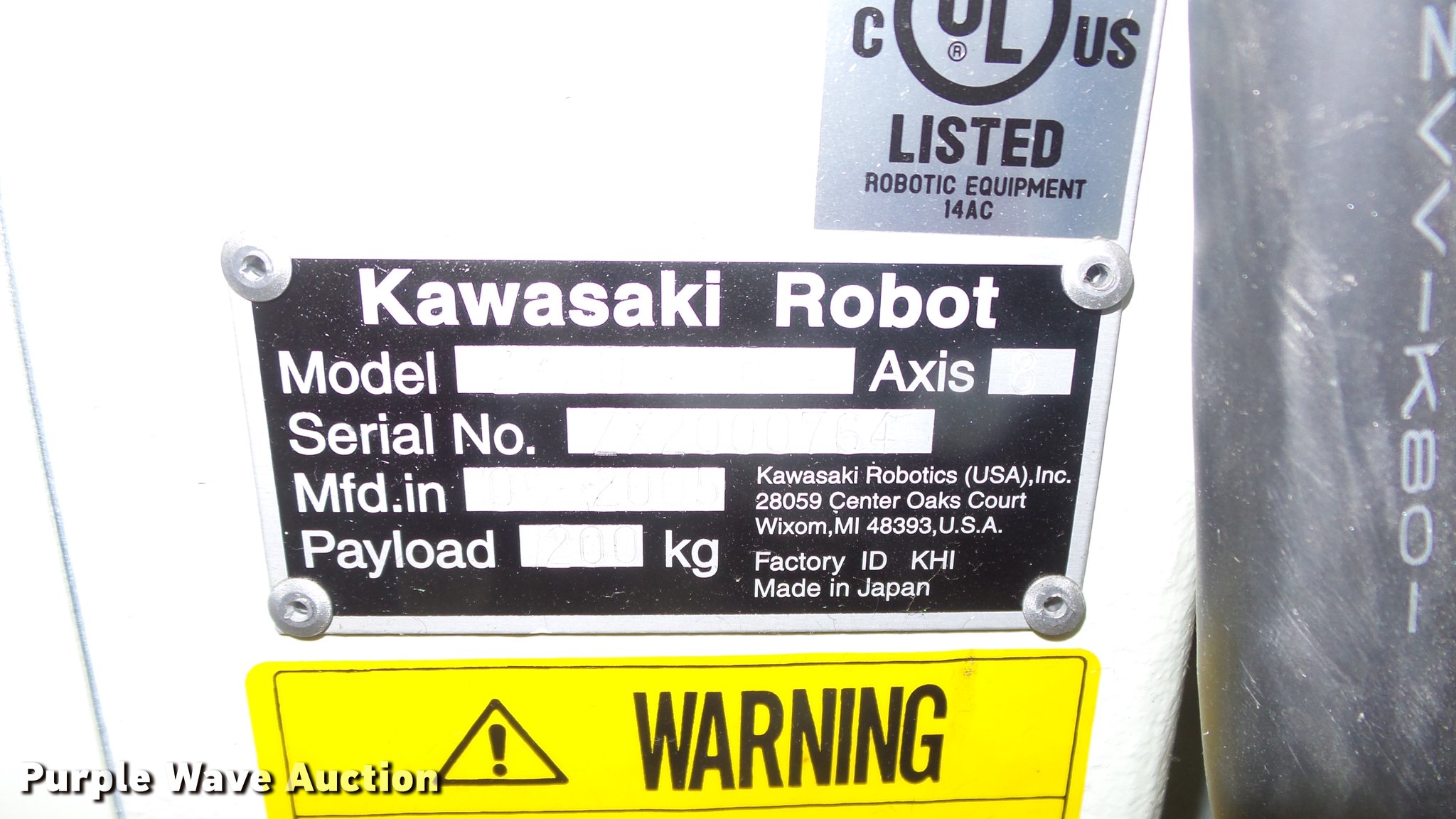 Purple Wave is selling a used Robot in Kansas. This item is a 2005 Kawasaki ZX200S robot with the following: 200 Kg payload, 2,651 mm reach, 1,400 kg unit weight, D32 controller, 8-axis, Wiring, Accessories, Three phase, NMB digital peak holder, Unknown operating condition, Serial ZX2000764