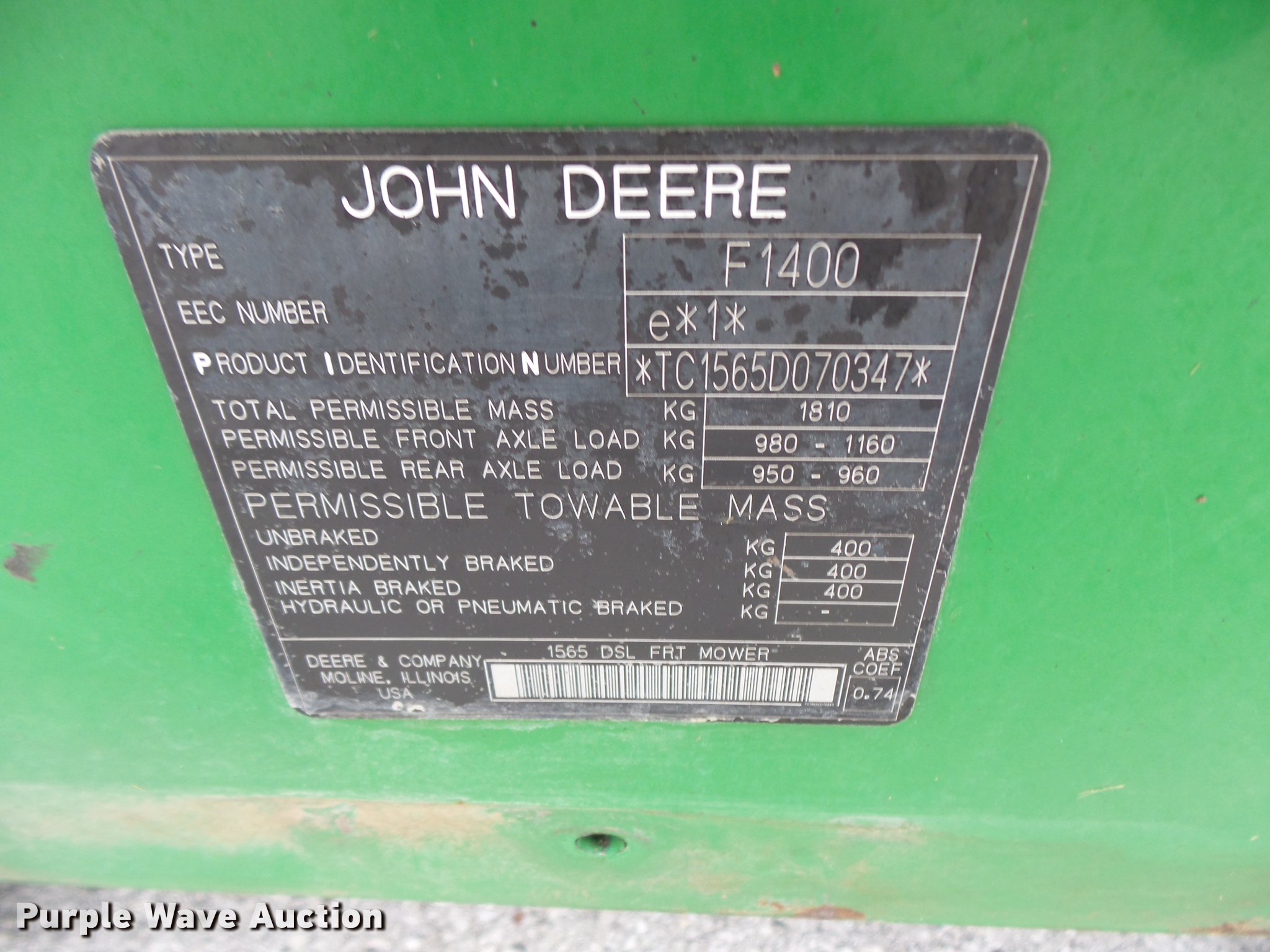 Purple Wave is selling a used Commercial Turf Mower in Iowa. This item is a John Deere 1565 Series II lawn mower with the following: 2,182 hours on meter, 72"W deck, Yanmar three cylinder diesel engine, Two speed hydrostatic transmission, Four wheel drive, Locking differential, Suspension seat, 26 x 12.00-12 front tires, 20 x 10.00-10 rear tires, Serial TC156D070347