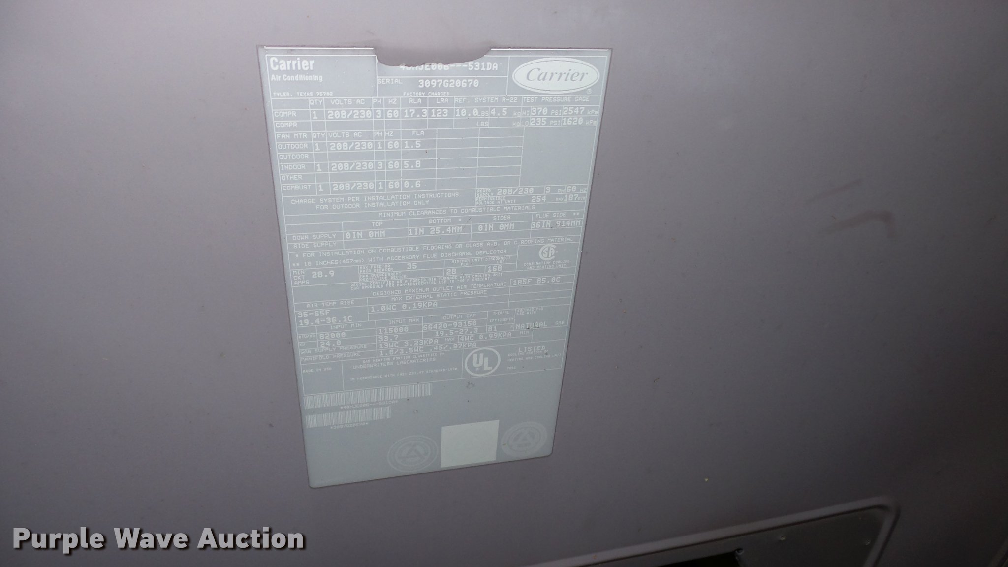 Purple Wave is selling a used Building Materials in Kansas. This item is a Carrier AC unit with the following: 45" x 74" x 33", 208/230V, Three phase, Serial 3097G20670