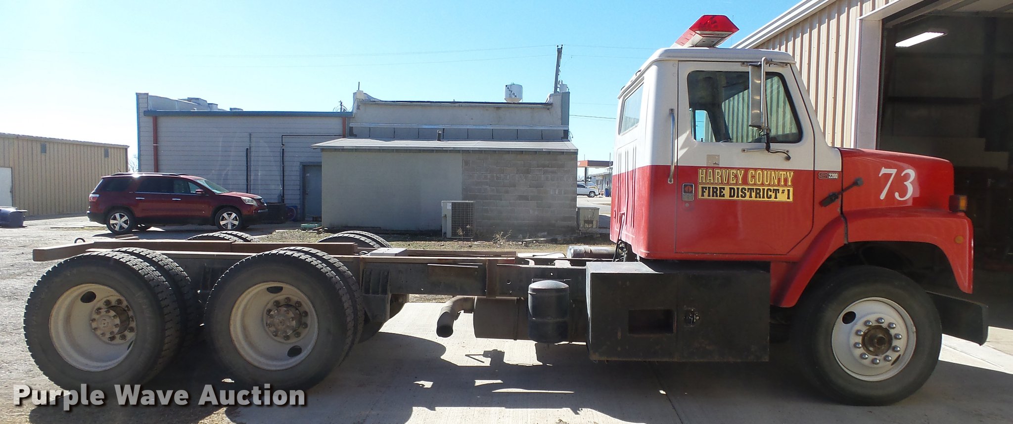 1987 International S2200 truck cab and chassis. 26,296 miles on odometer Actual mileage unknown, Cummins 14.0L L6 diesel engine, 10 speed manual transmission, AC and heat, AM/FM, Air suspension seat, Light bar, Chelsea PTO, Single fuel tank, 16' from cab to end of chassis, Air suspension, Air brakes, Tandem axle, 295/75R22.5 front tires, 275/80R24.5 rear tires, Cracked windshield. Kansas title. 1HSZGGUR8HH514607. Harvey County Fire District #1. 122 Main St. Walton, KS 67151