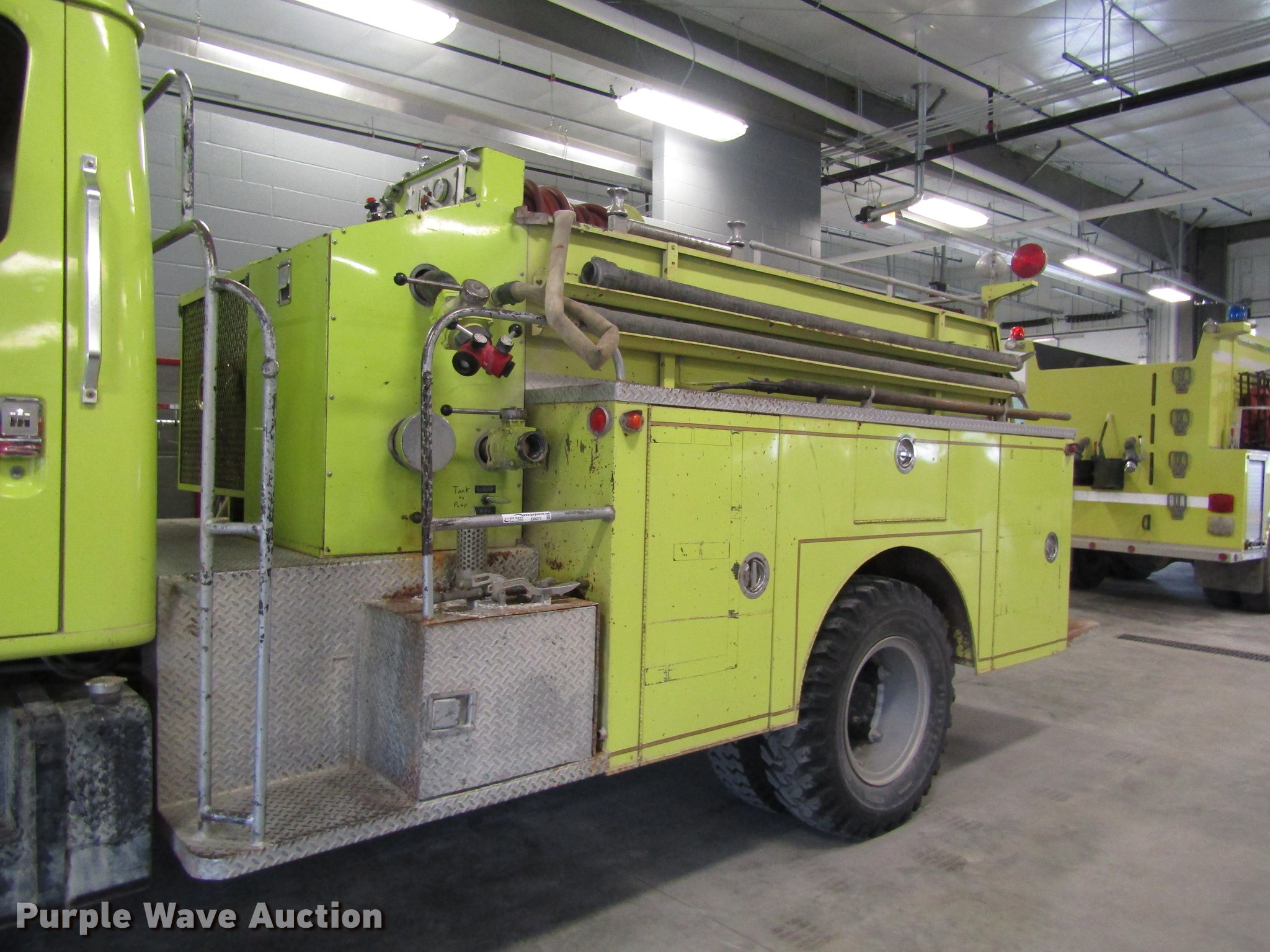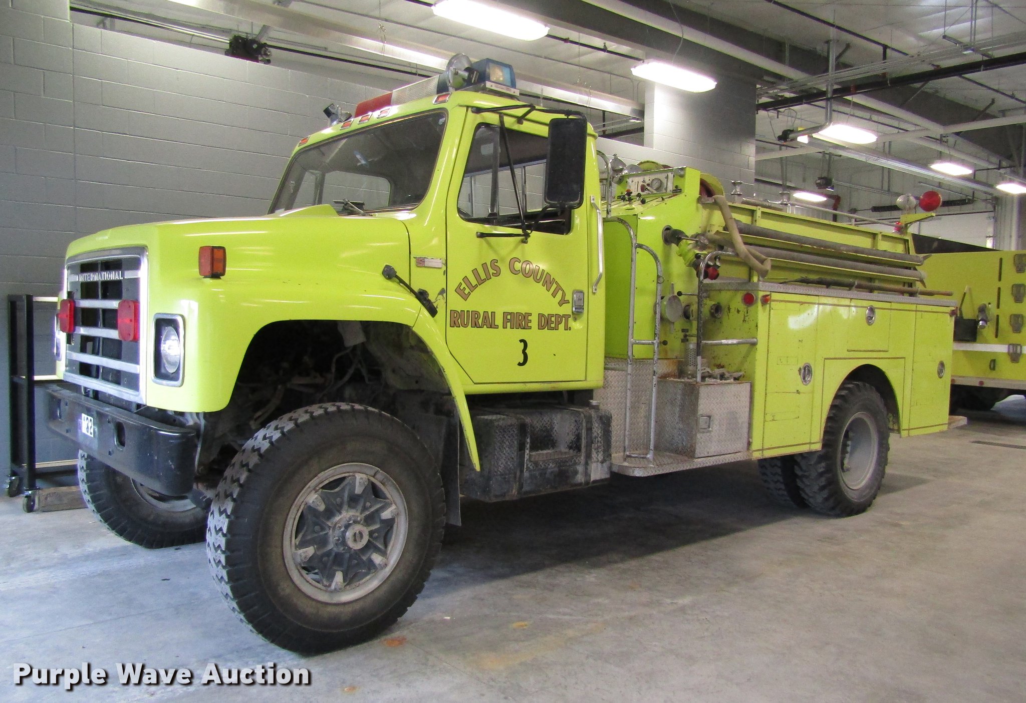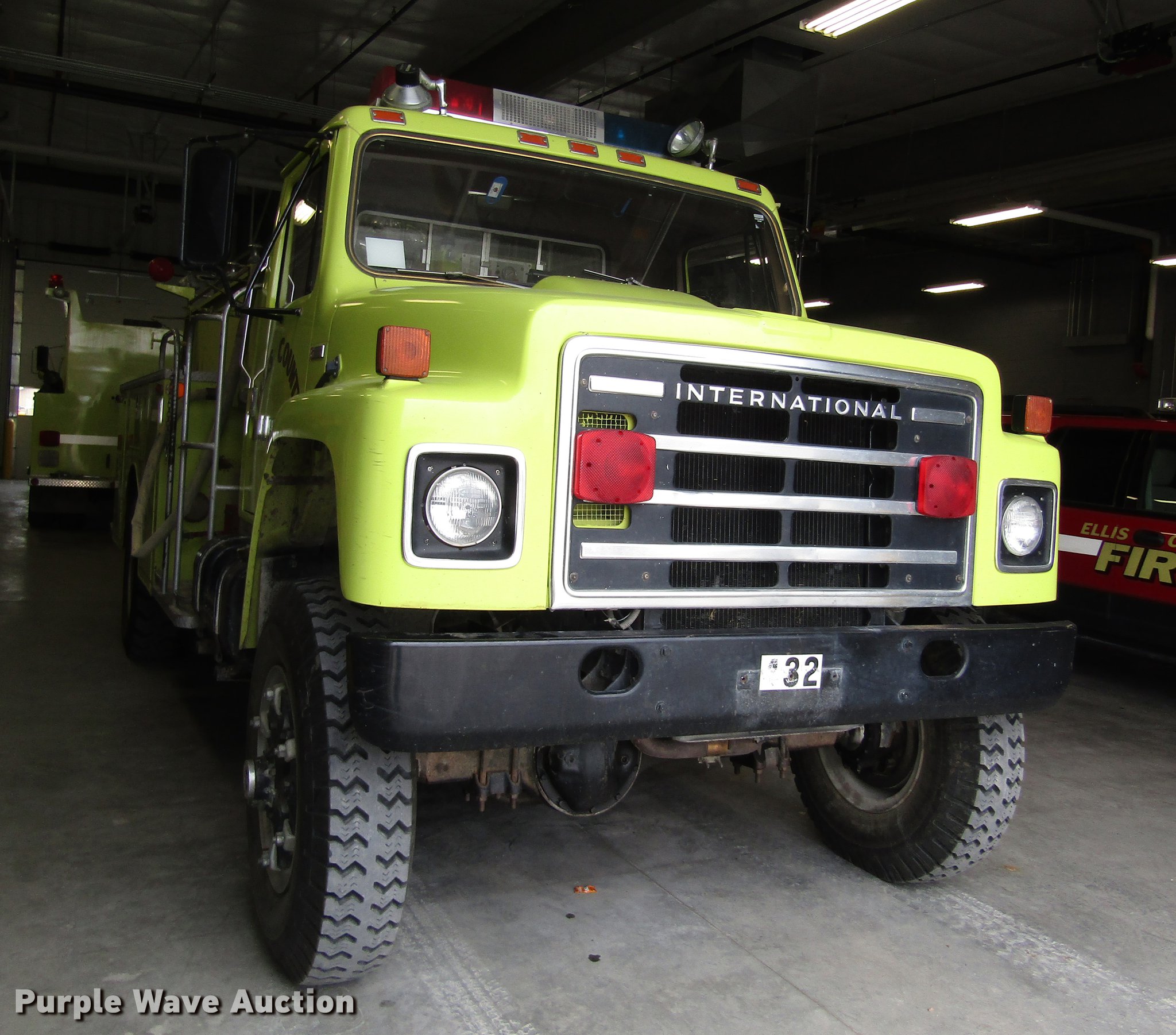 Purple Wave is selling a used Fire Truck or Emergency Vehicle in Kansas. This item is a 1979 International R1824 fire truck with the following: 15,116 miles on odometer, Eight cylinder gas engine, Automatic transmission, Four wheel drive, Single axle, Heat, Spotlights, Light bar, Electronic siren, 1,000 gallon water tank, Dual fuel tanks, Spring suspension, Hydraulic brakes, Microbrake, 170" wheelbase, 10.00-20 tires, Pump, fittings, hose, tools, and two-way radio not included, Contents not included