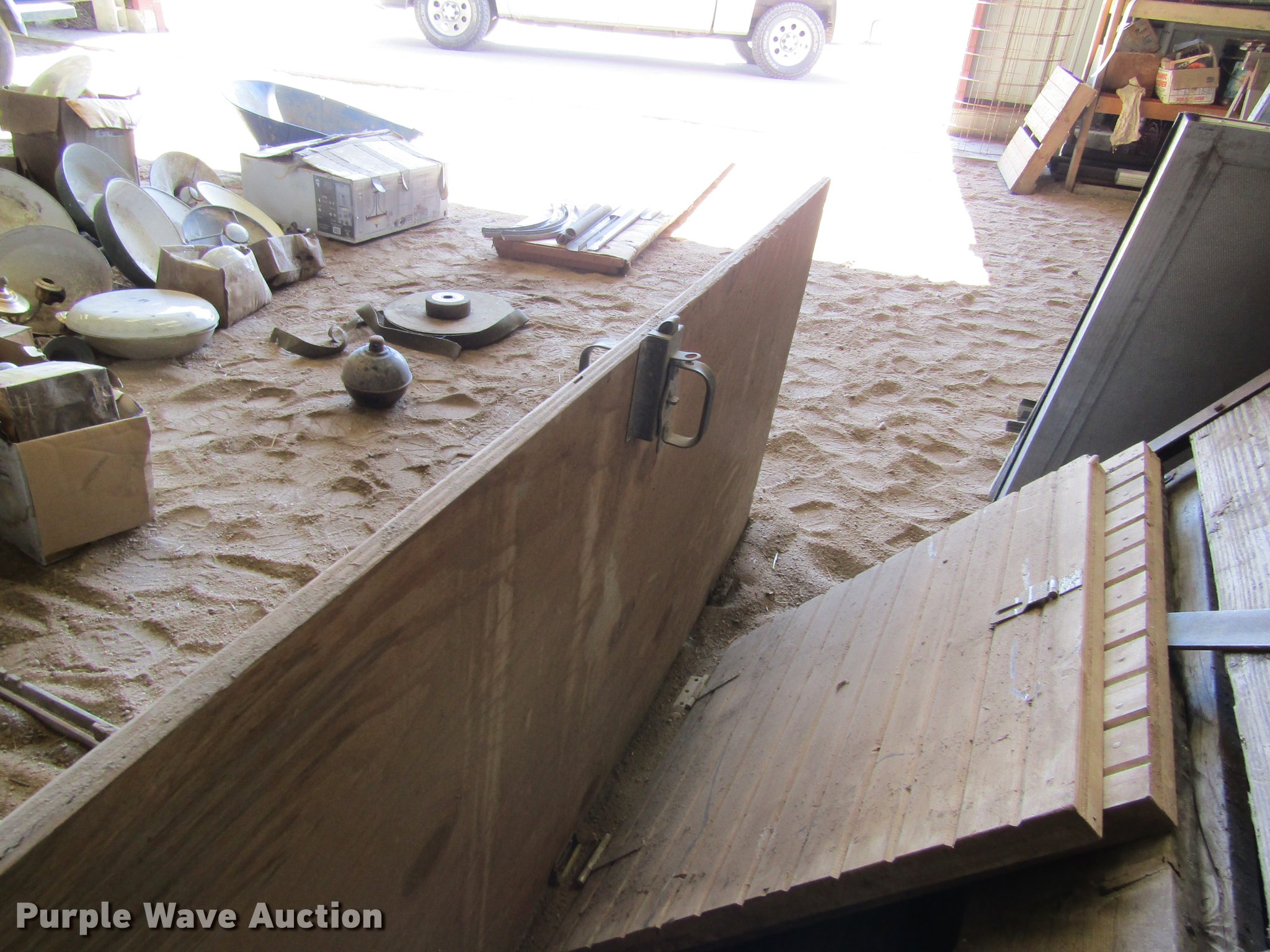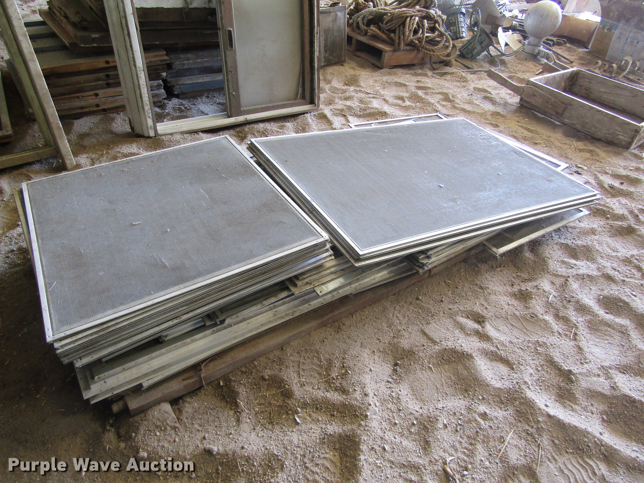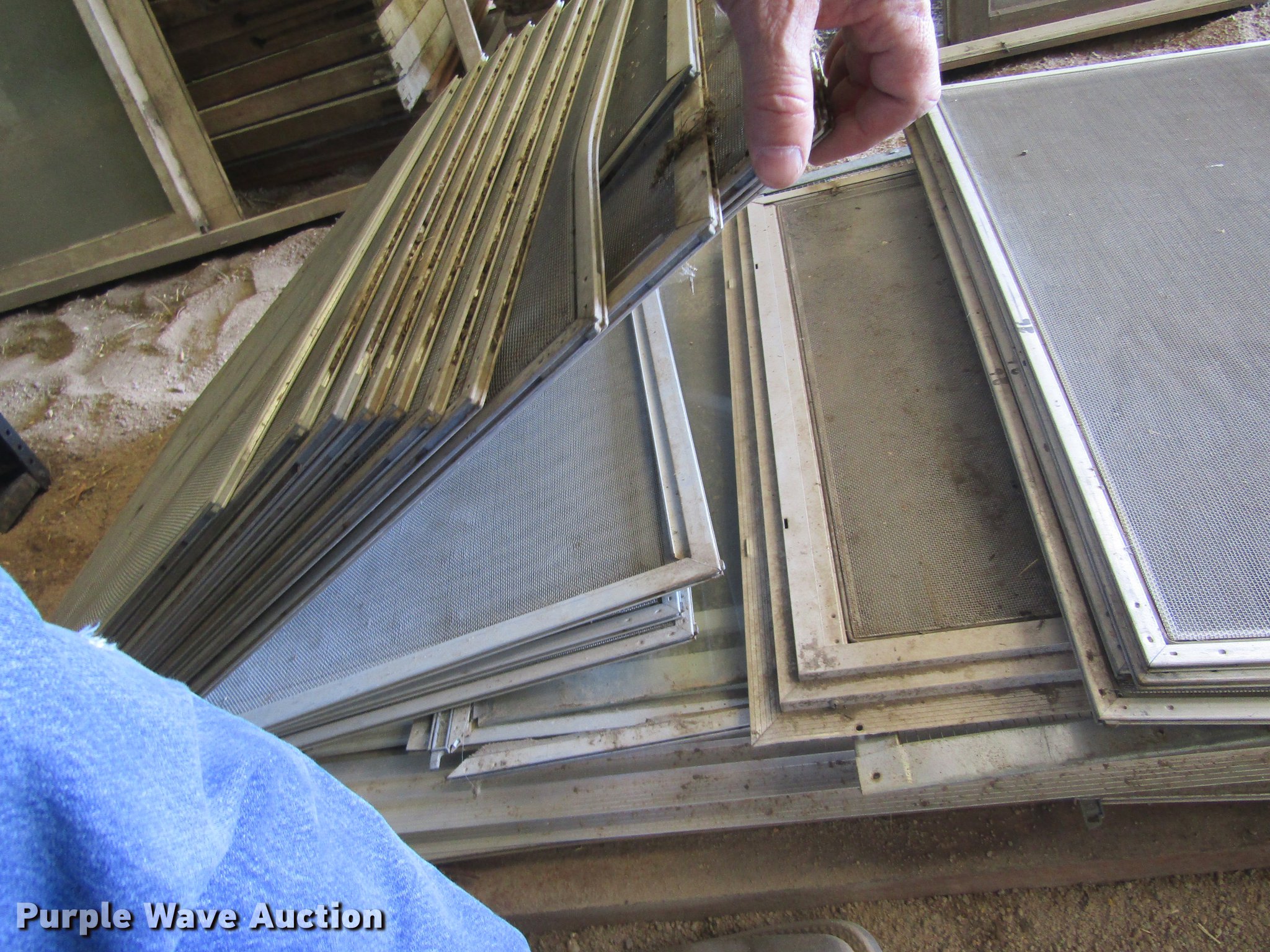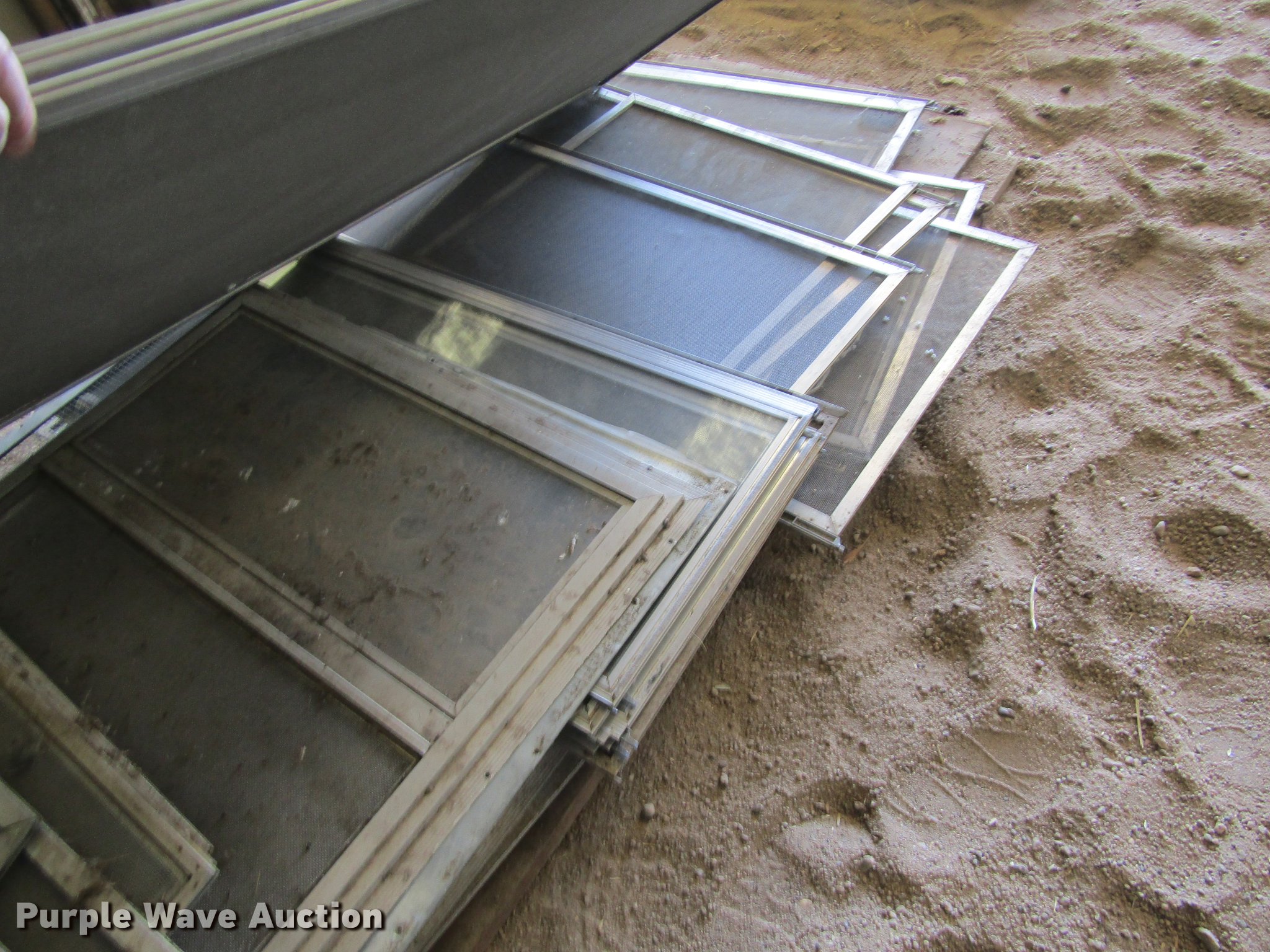 Purple Wave is selling a used Building Materials in Kansas. This item is a Building materials with the following: (6) storm doors, (9) entry doors, (8) windows, (4) gates, (2) trap doors, Garage door panels and hardware, Wood and aluminum construction, Various size glass and screens
