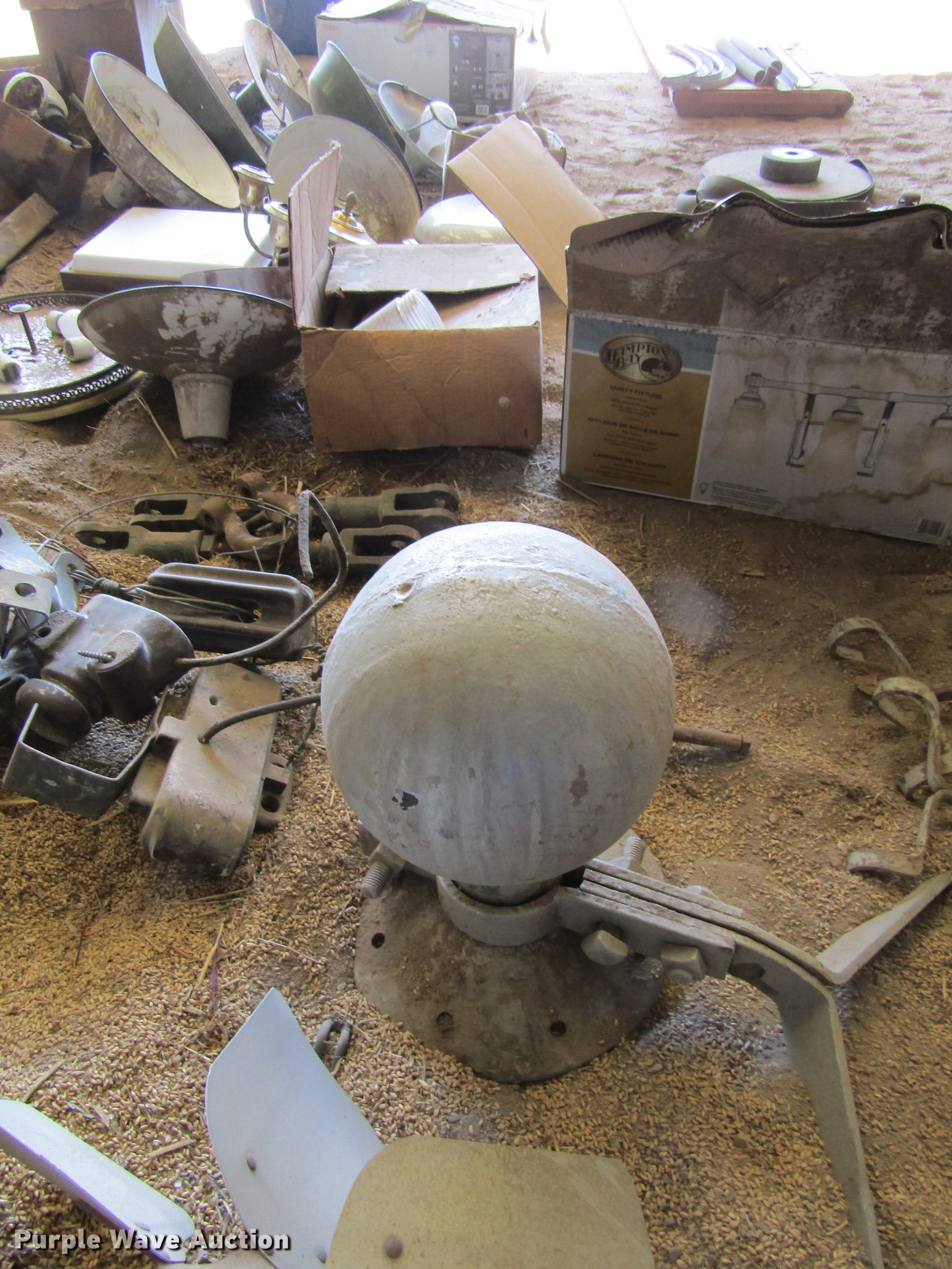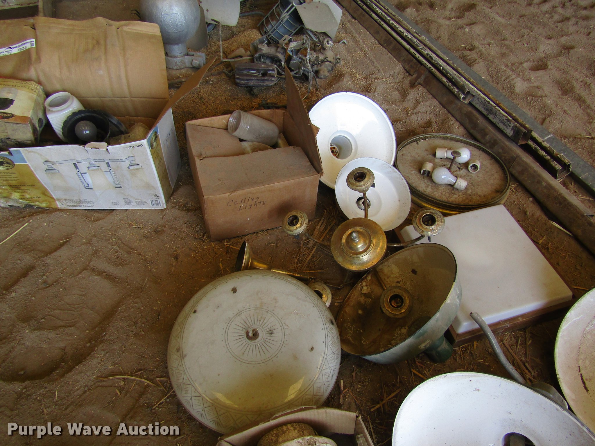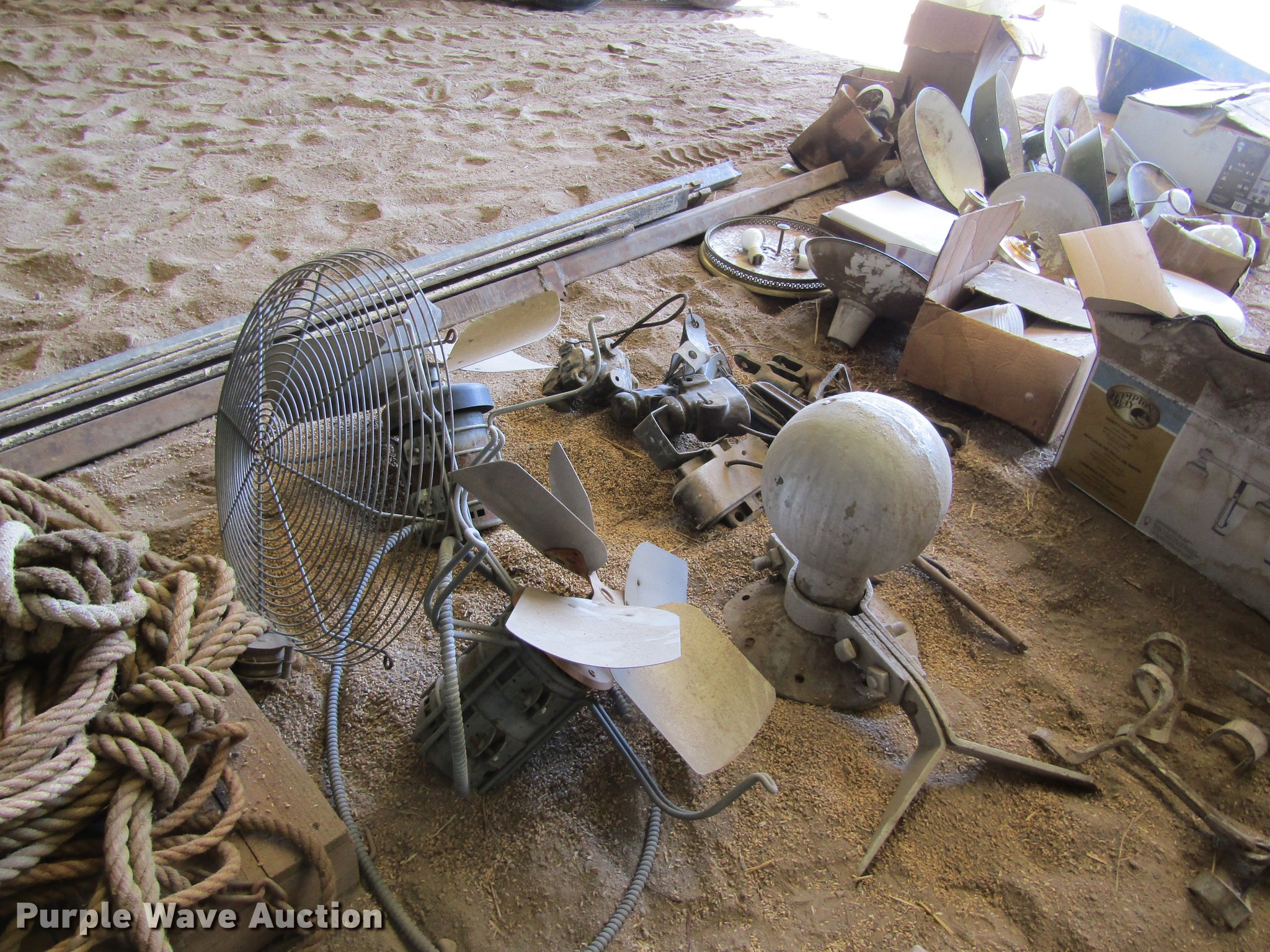 Purple Wave is selling a used Building Materials in Kansas. This item is a Building materials with the following: (9) porcelain bar lights, Porcelain insulators, Kero pot, Water tower ball topper, Fans, Ropes and pulleys, Door tracks, Hand sieve, Barn door