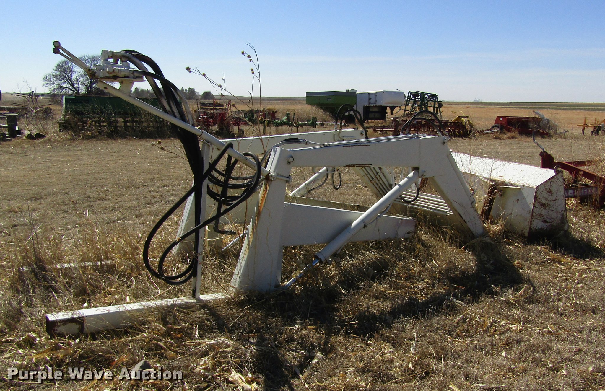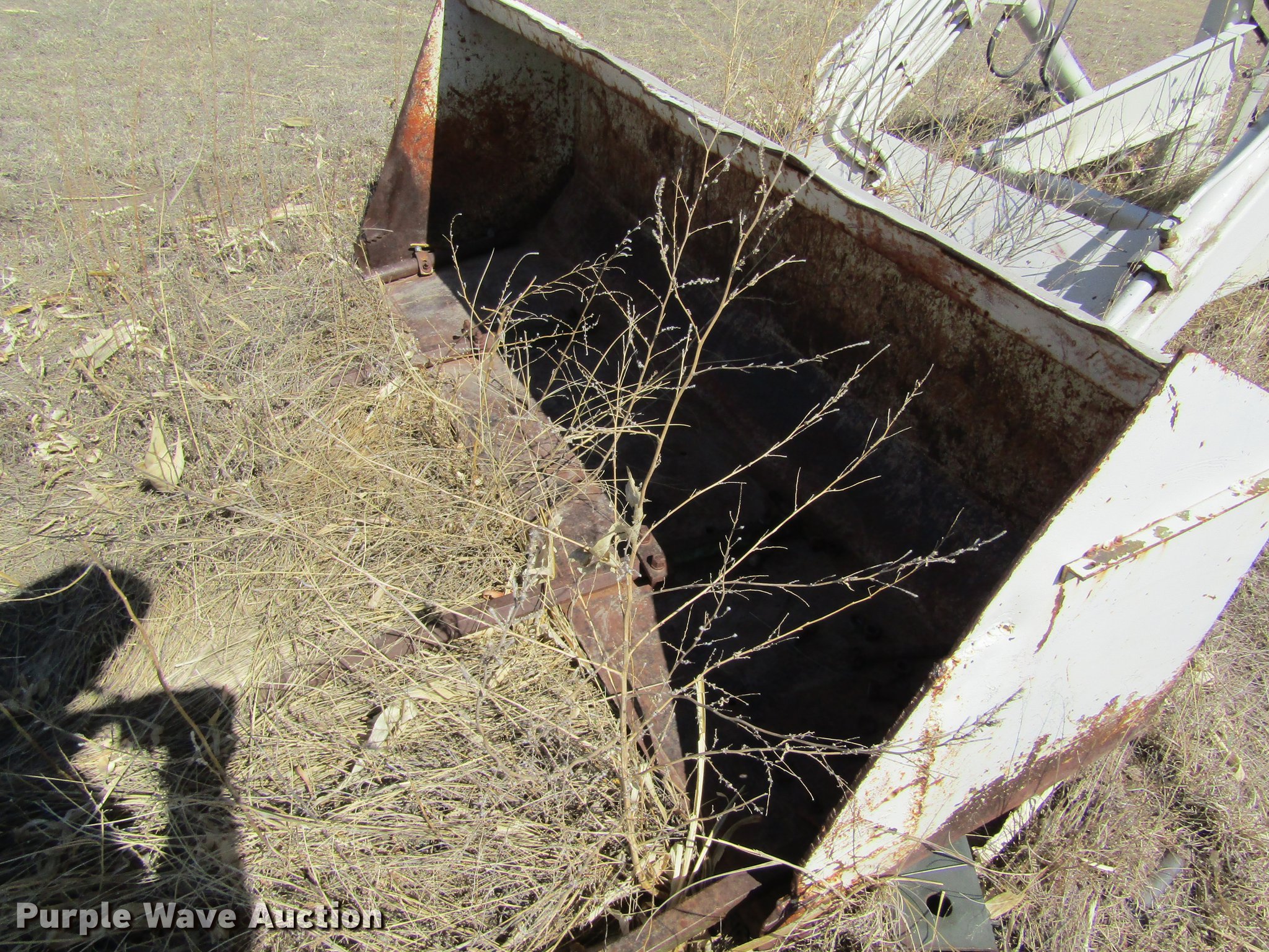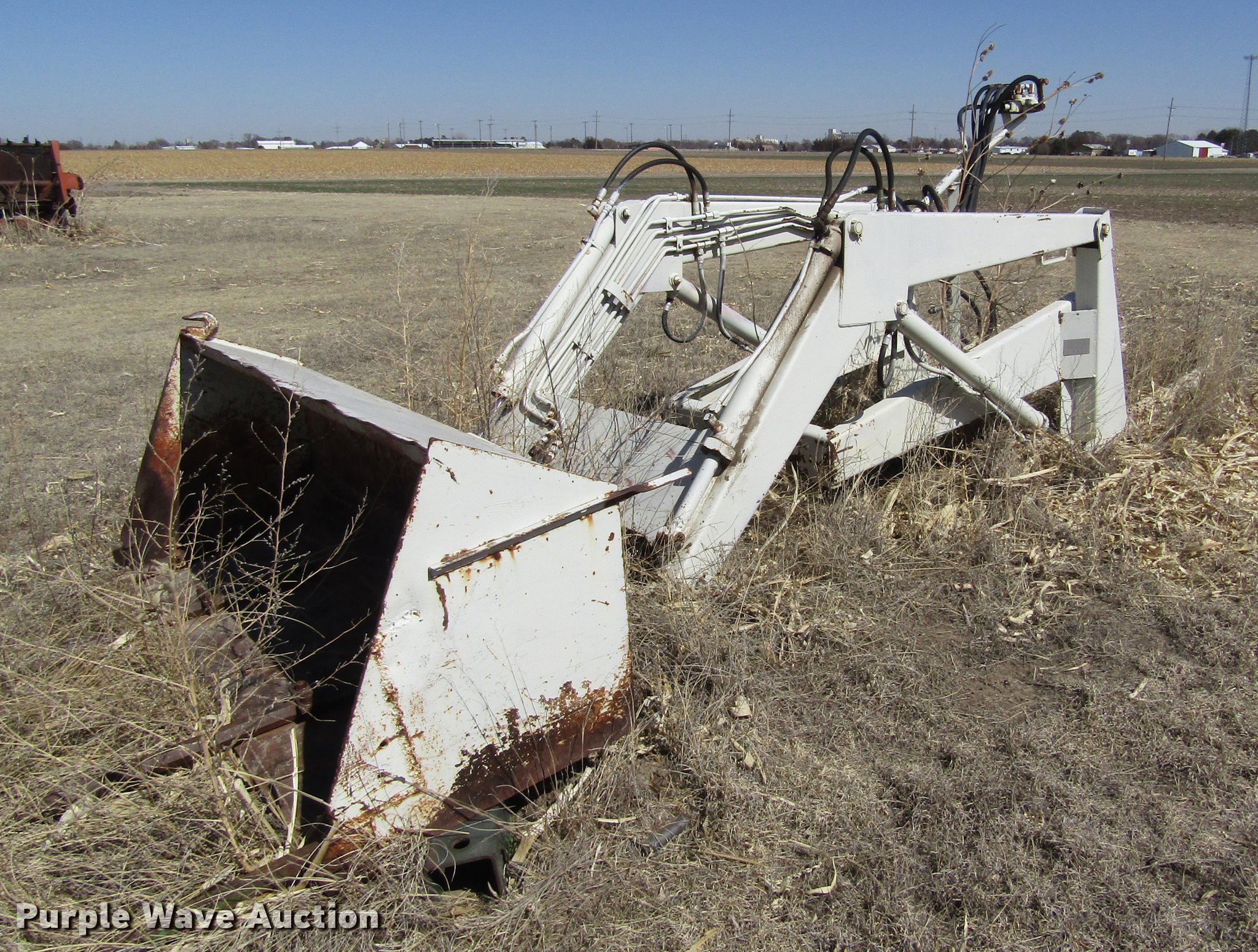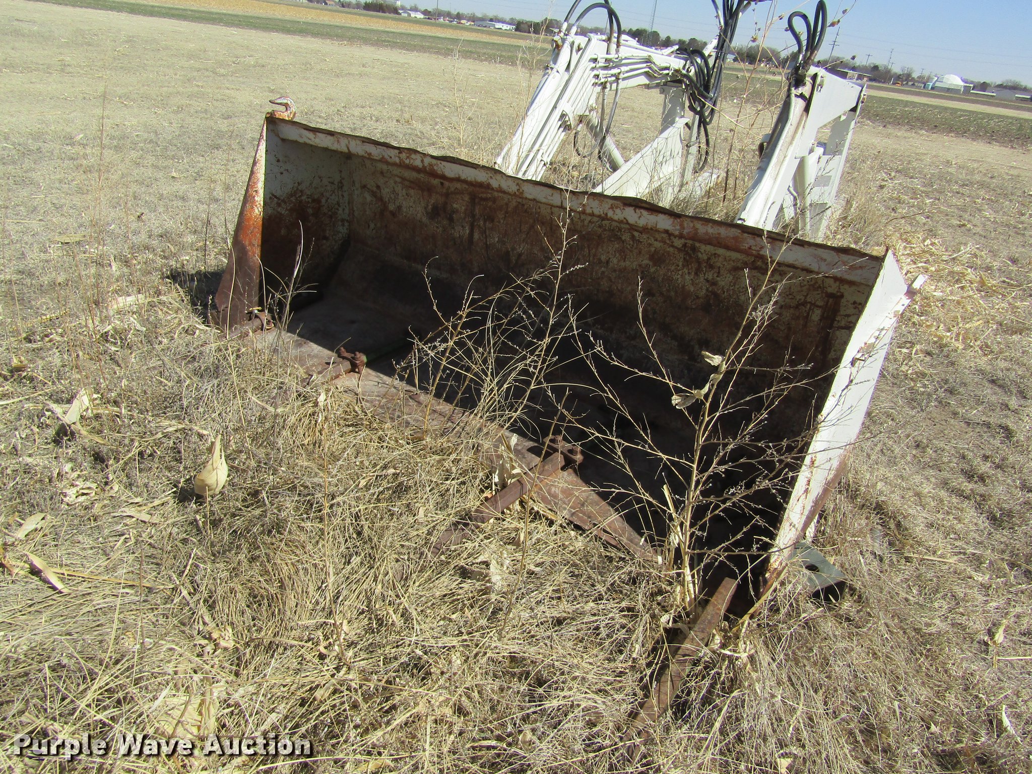 Loader. 6'W bucket Bolt-on forks, Three-lever controls, Front hydraulic remote hookup, Brackets, Removed from International 686 tractor. KSU NW Research. 105 Experiment Farm Dr. Colby, KS 67701