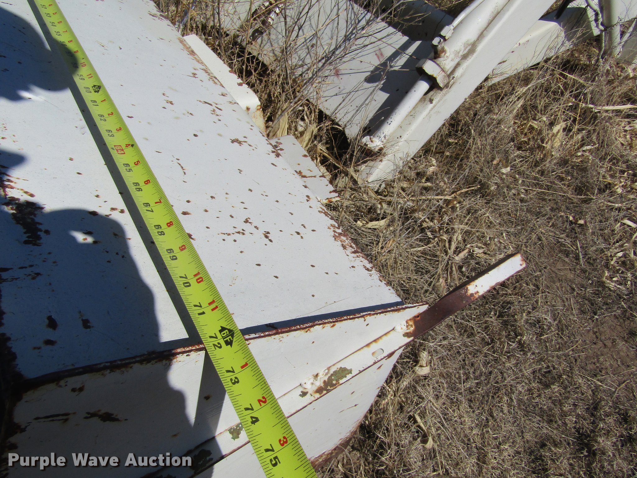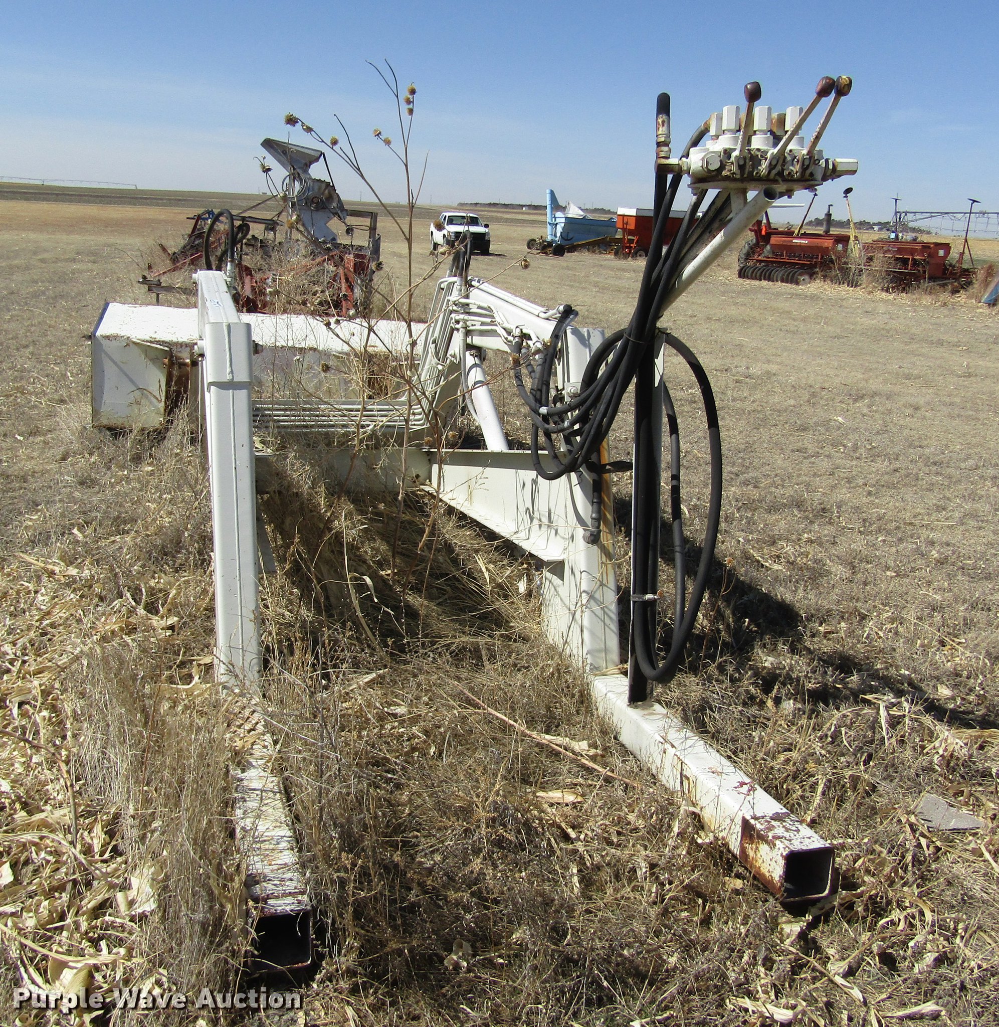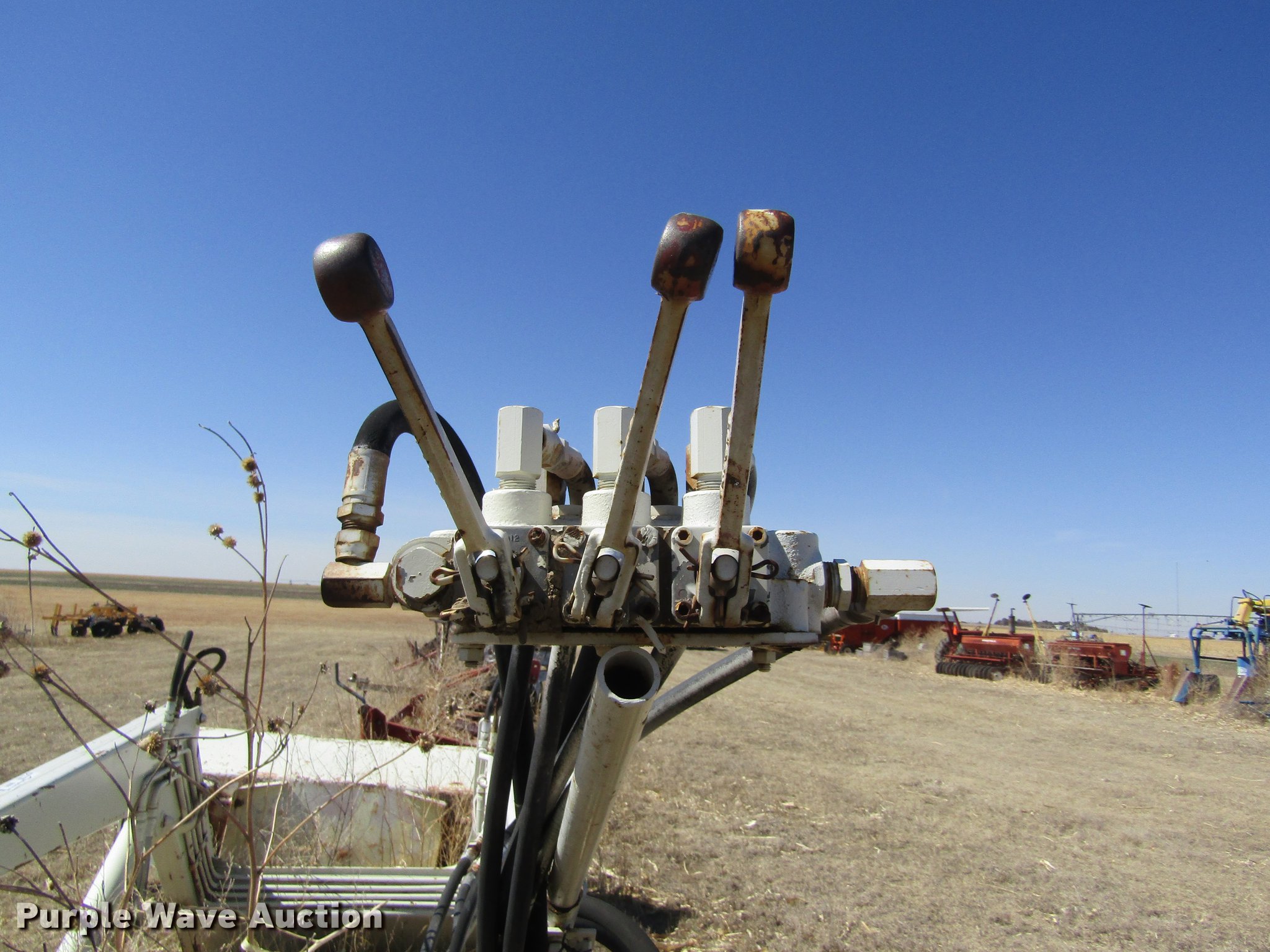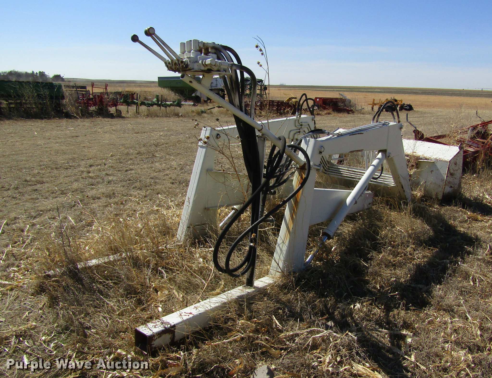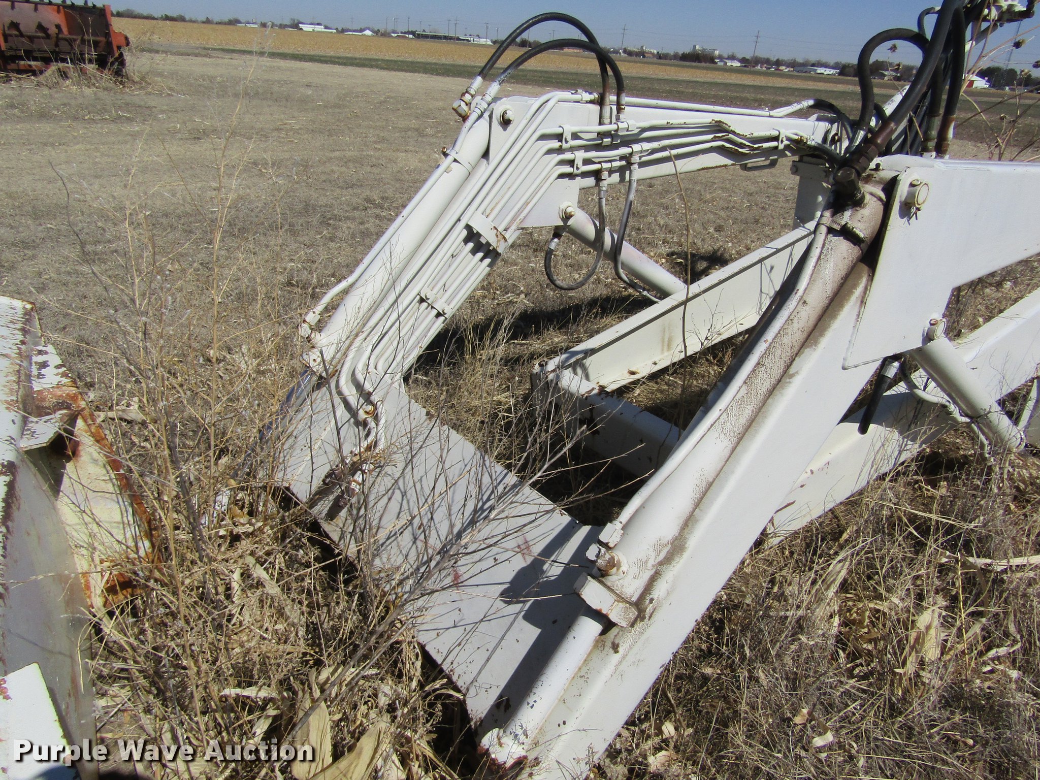 Loader. 6'W bucket Bolt-on forks, Three-lever controls, Front hydraulic remote hookup, Brackets, Removed from International 686 tractor. KSU NW Research. 105 Experiment Farm Dr. Colby, KS 67701