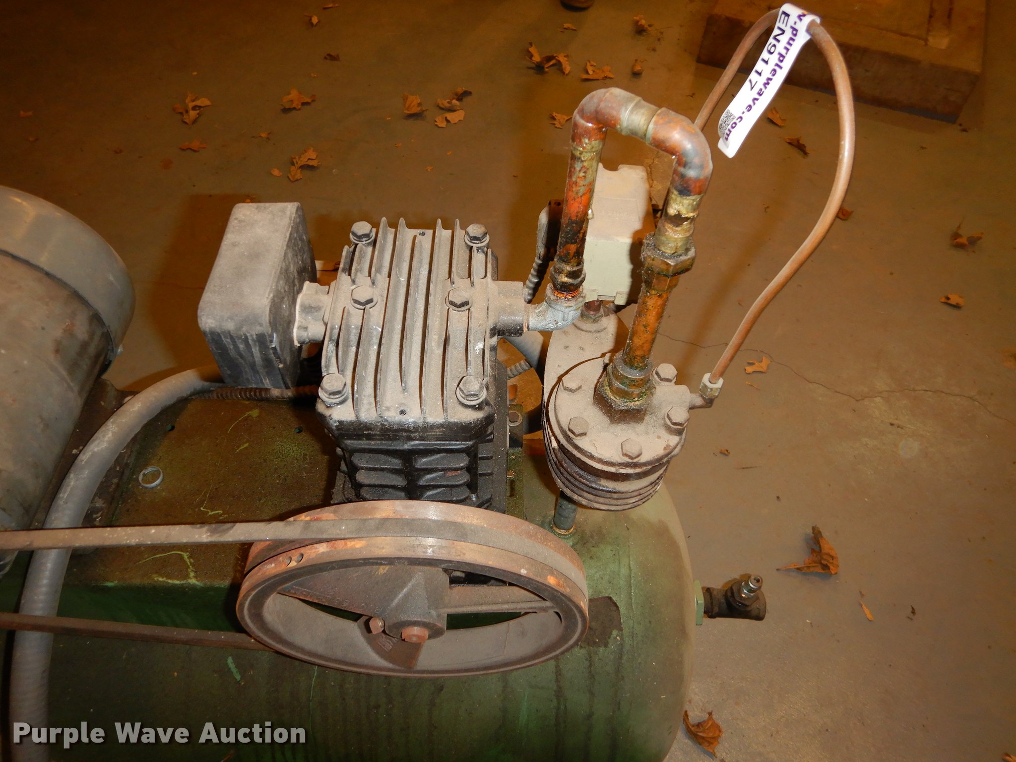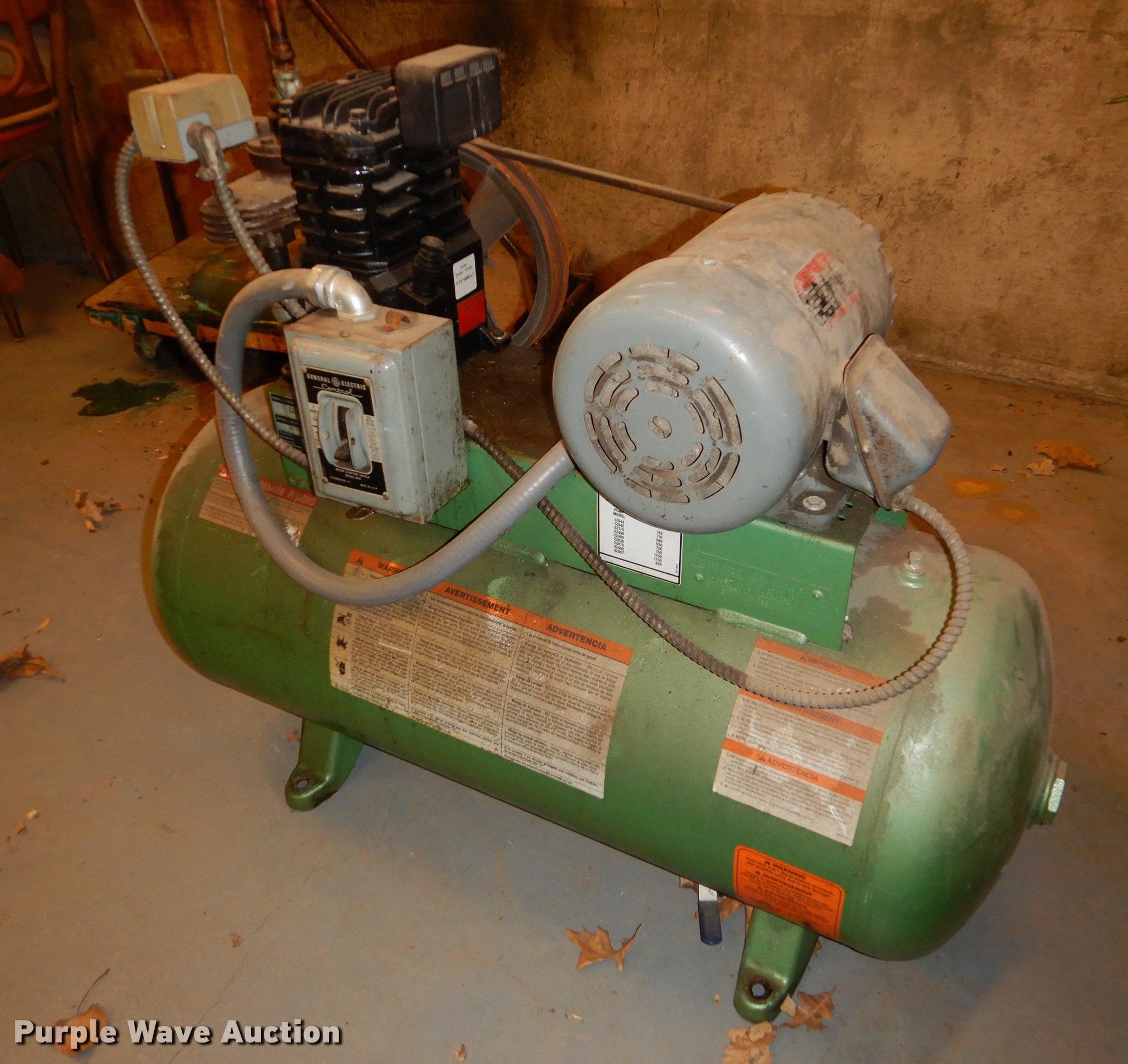 Purple Wave is selling a used Air Compressor in Kansas. This item is a GE 5Z359A air compressor with the following: Dayton three phase motor, 208/220 volt, Serial E9-9-97-03738