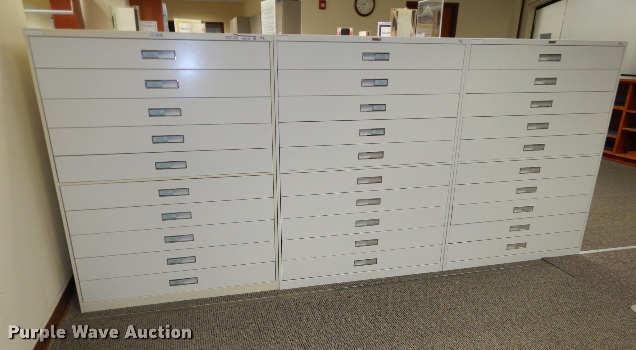 Purple Wave is selling a used Furniture in Kansas. This item is a (3) Russ Bassett card/microfiche cabinets with the following: 43" x 18" x 56", 10 drawers
