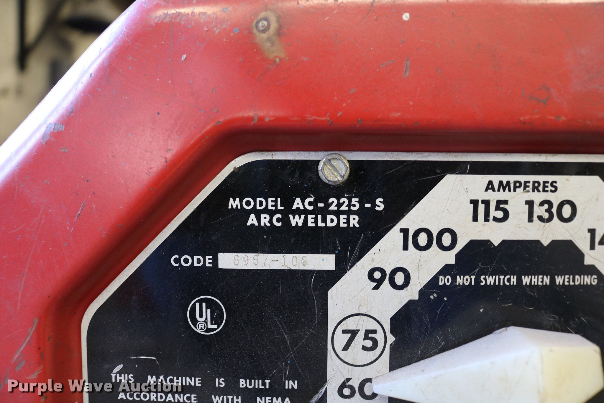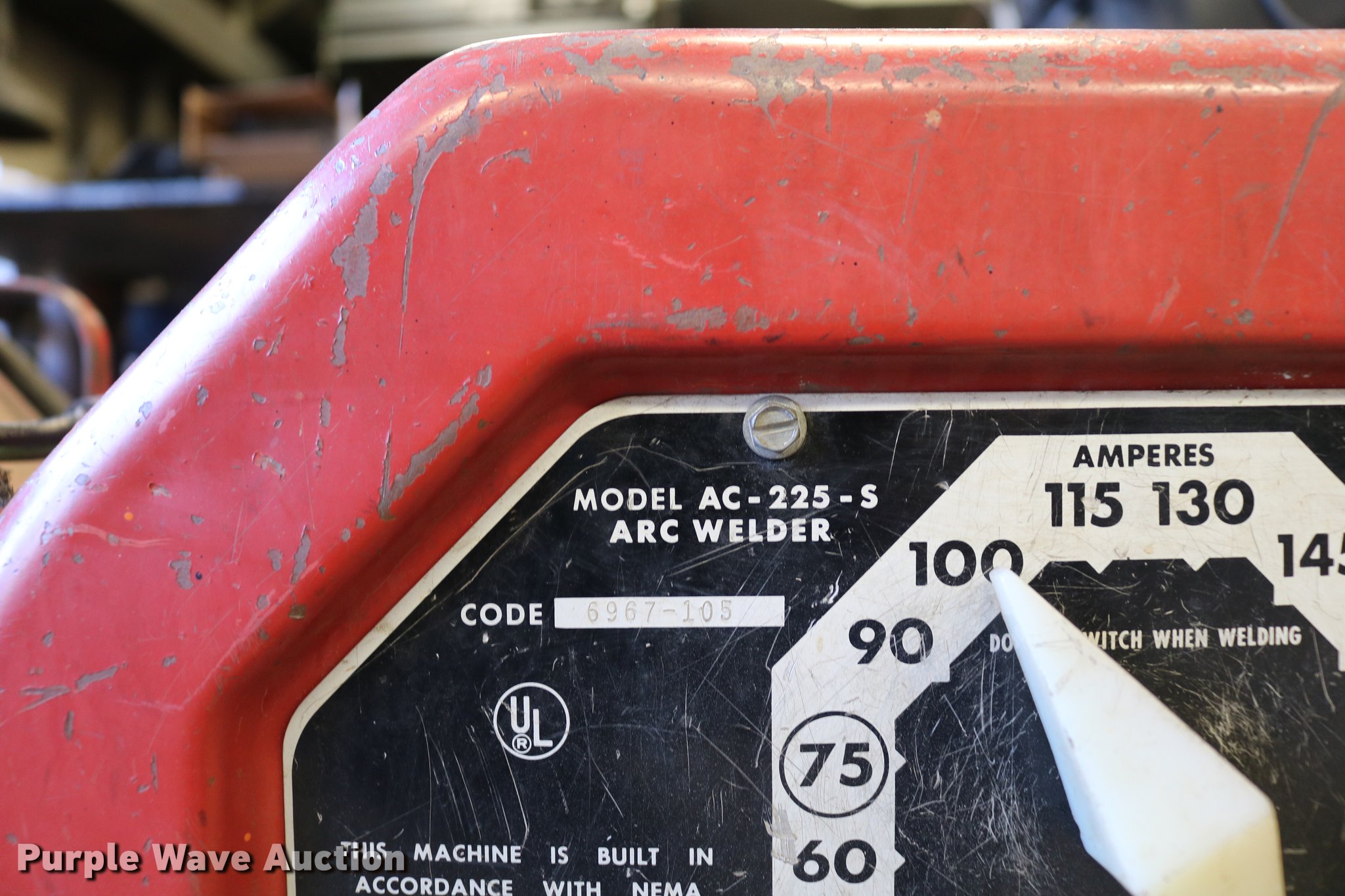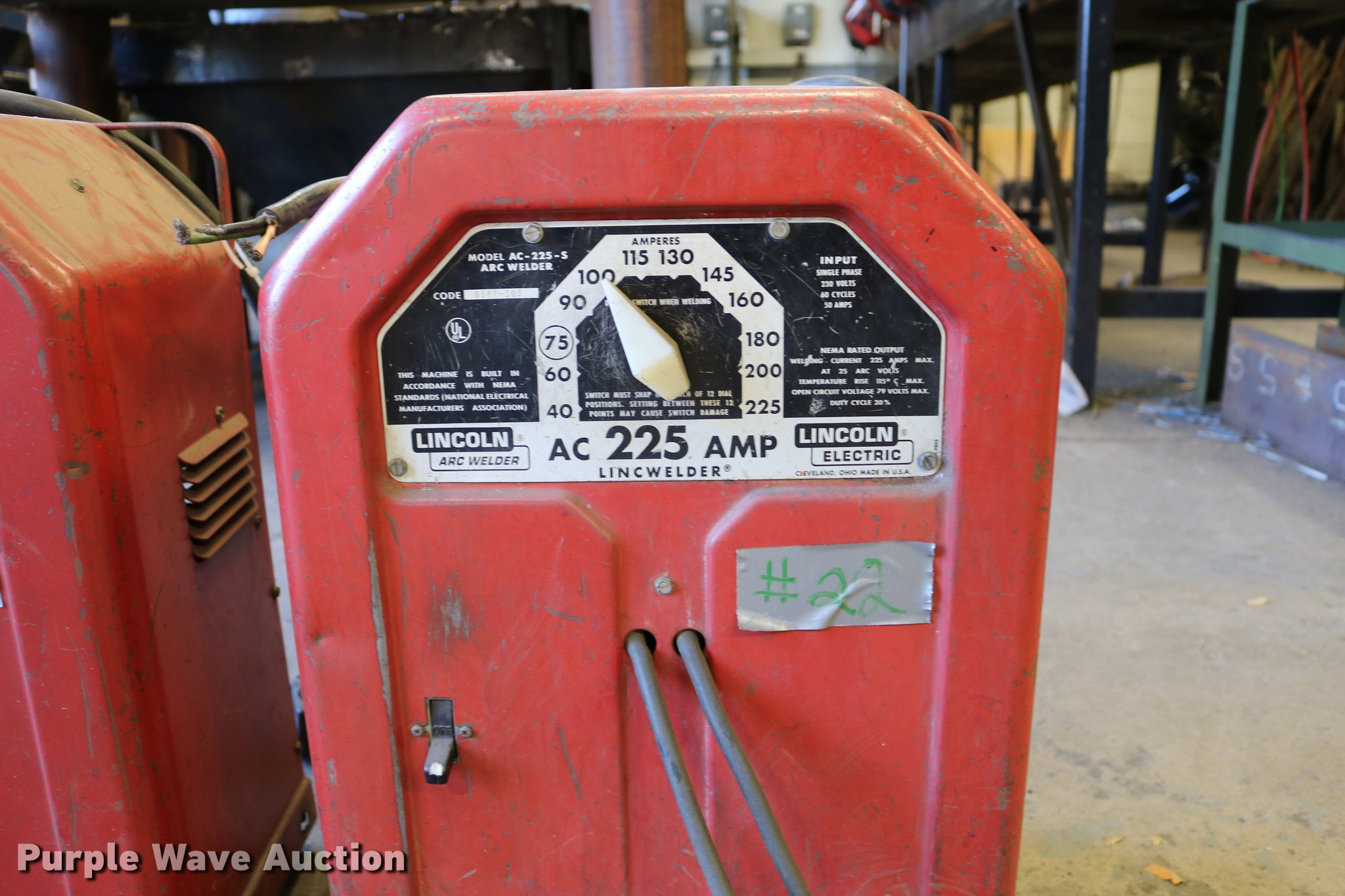 Purple Wave is selling a used Welder (Manual) in Kansas. This item is a (2) Lincoln arc welders with the following: Model AC-225-S, 230V, Single phase, Code 6967-106, Ground lead not attached, No gun lead, Model AC-225-S, 230V, Single phase, Code 6967-105, No plug-in on electrical cord, Non-operational units