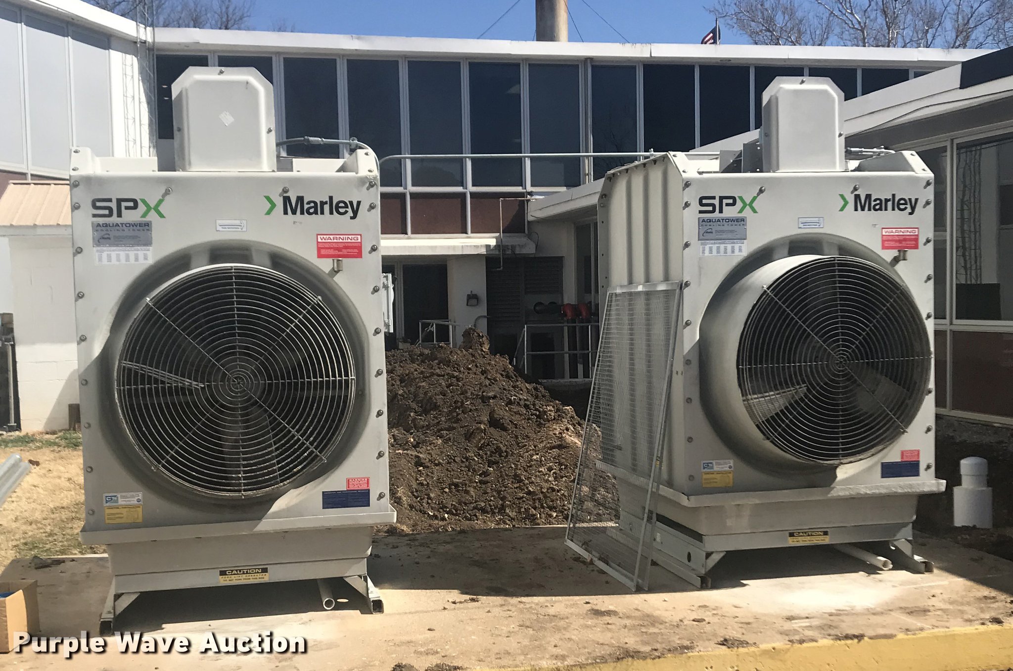 Purple Wave is selling a used Appliances in Kansas. This item is a (2) SPX Marley Aquatowers cooling towers with the following: VA112 belt, Service records available upon request, Serial AQ-10052308-A1492G, AQ10052308-B1492G