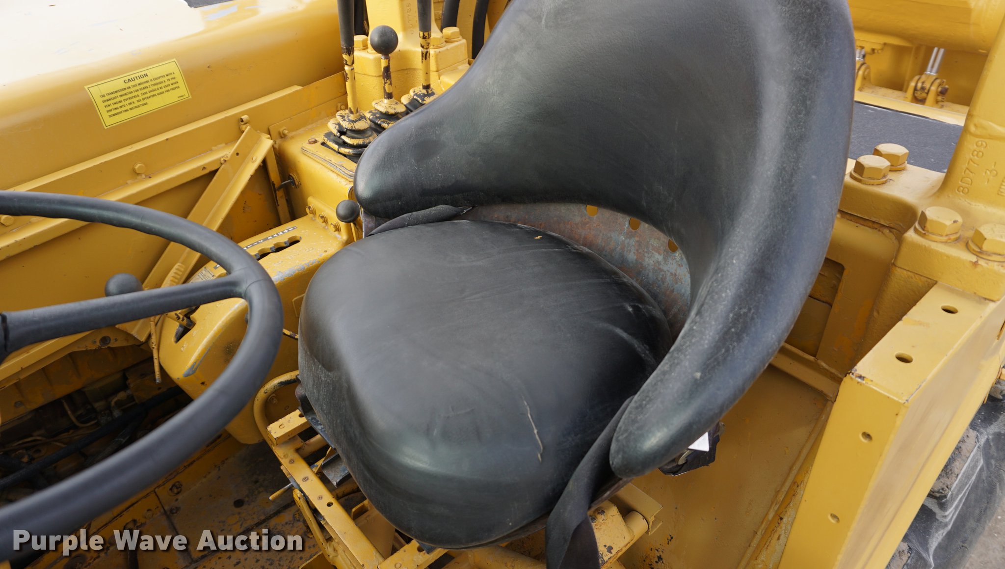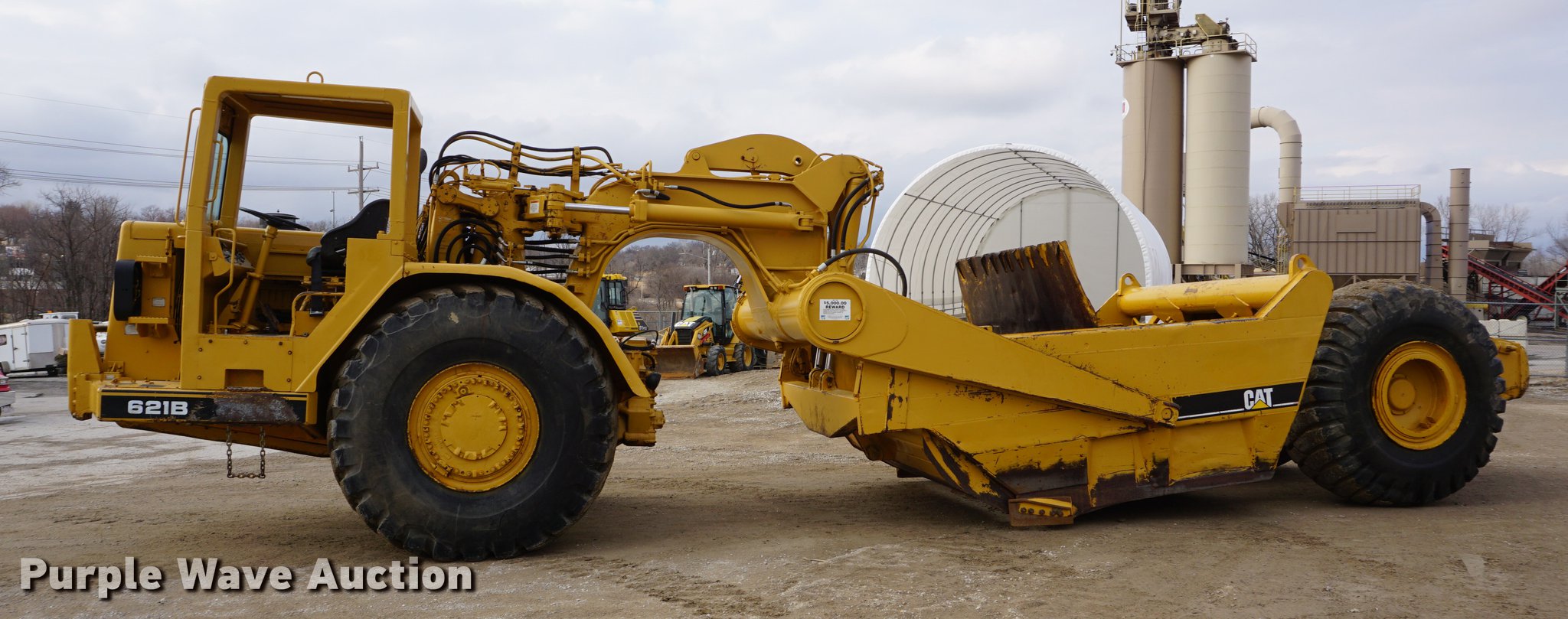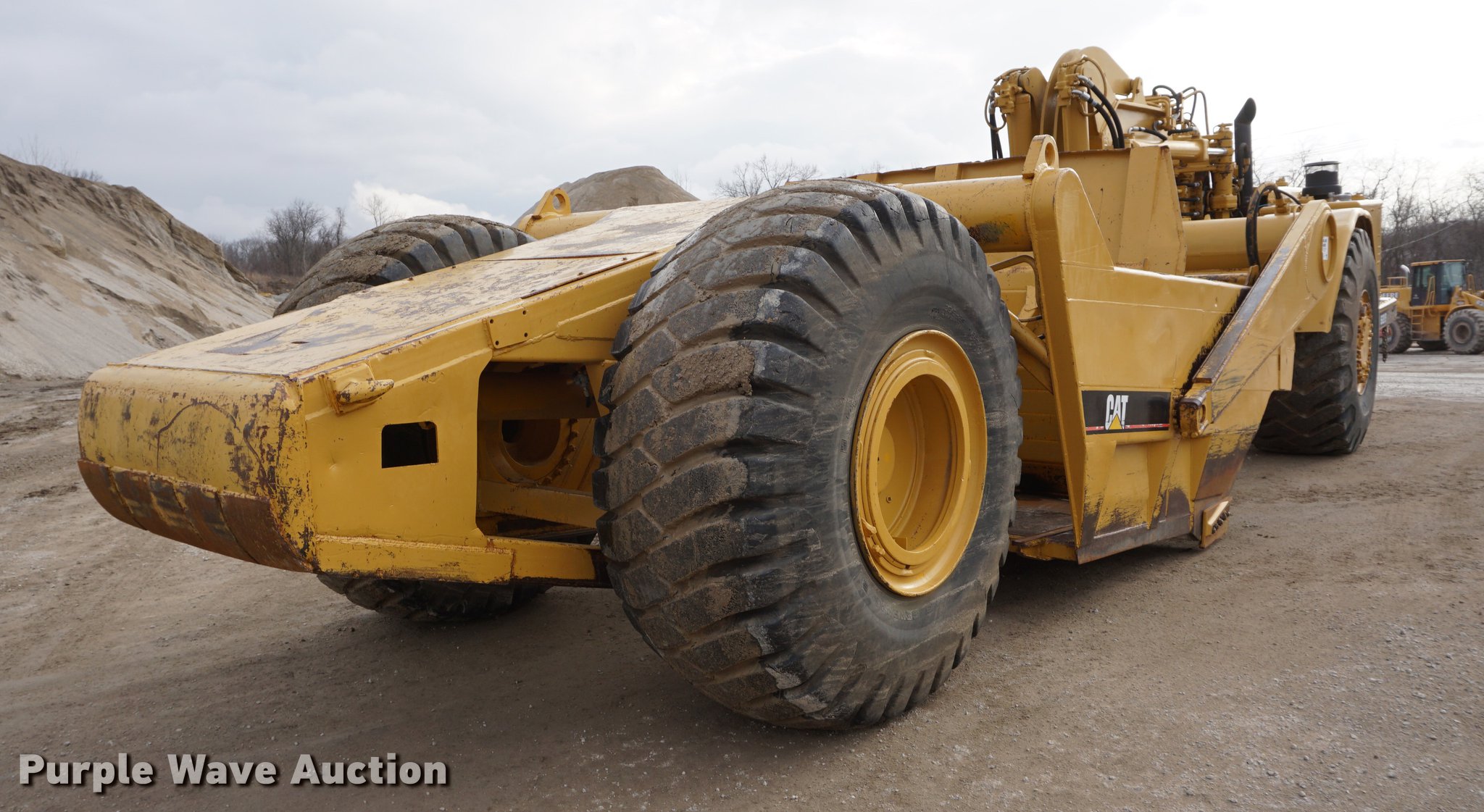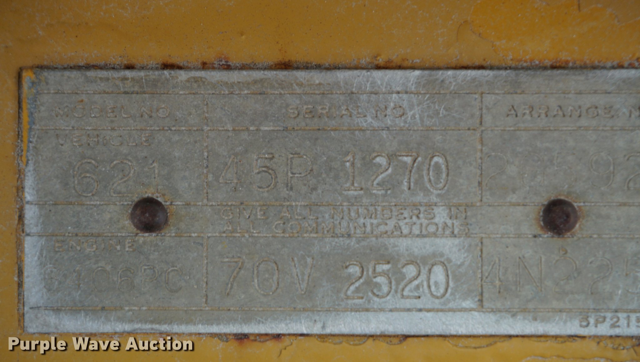 Purple Wave is selling a used Conventional Scraper in Kansas. This item is a 1976 Caterpillar 621B conventional scraper with the following: 3,869 hours on meter, Caterpillar 3406 14.6L six cylinder turbo diesel engine, 330 HP, Serial 70V2520, Powershift transmission, 8F-1R gears, OROPS, Suspension seat, Backup alarm, 20 cu.yd. capacity, Hydraulic lift, Cushion hitch, Three lever controls, Rear push block, Air brakes, Front work lights, 33.25-29 E-3 front tires, 29.5-29 E-3 rear tires, Serial 45P1270