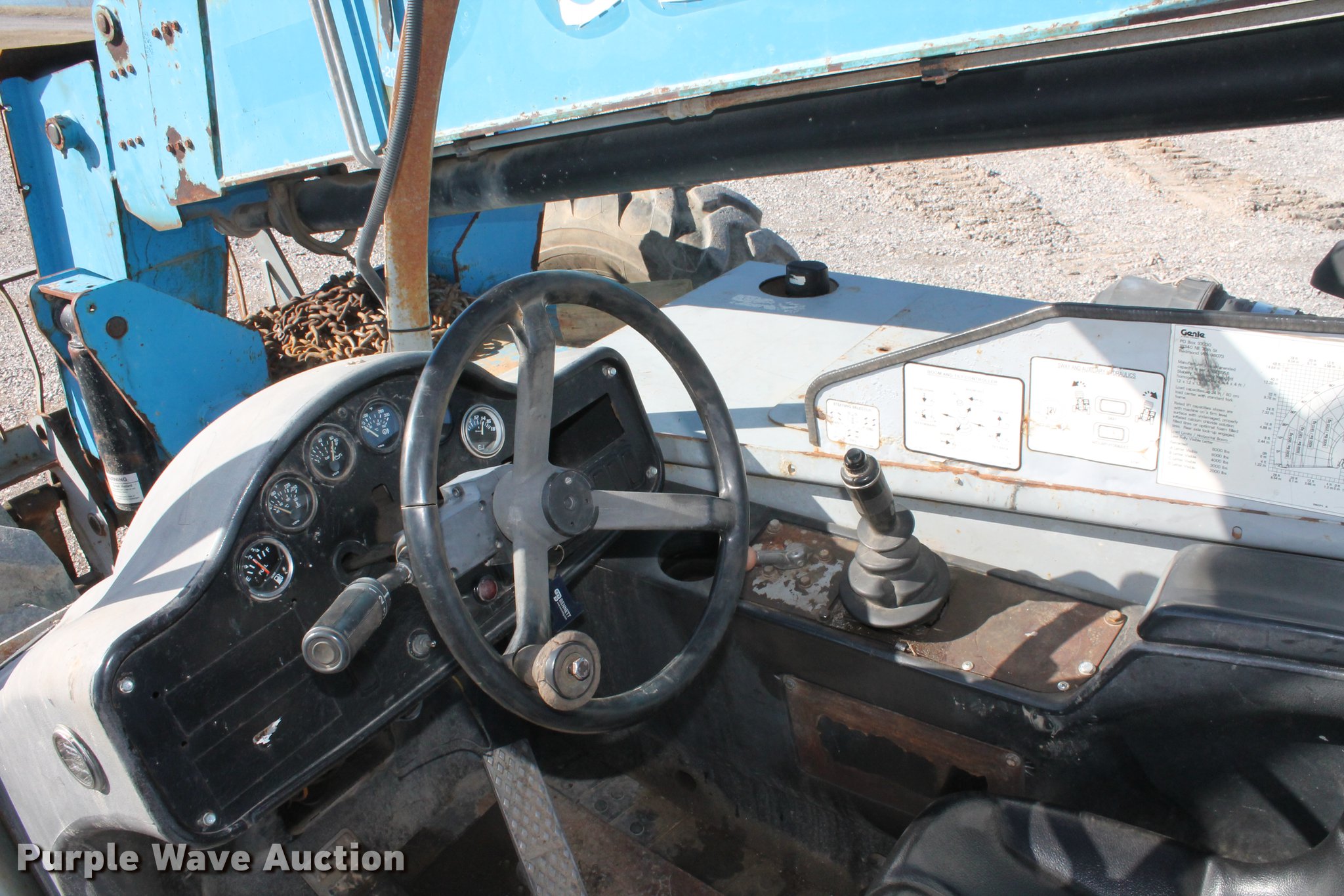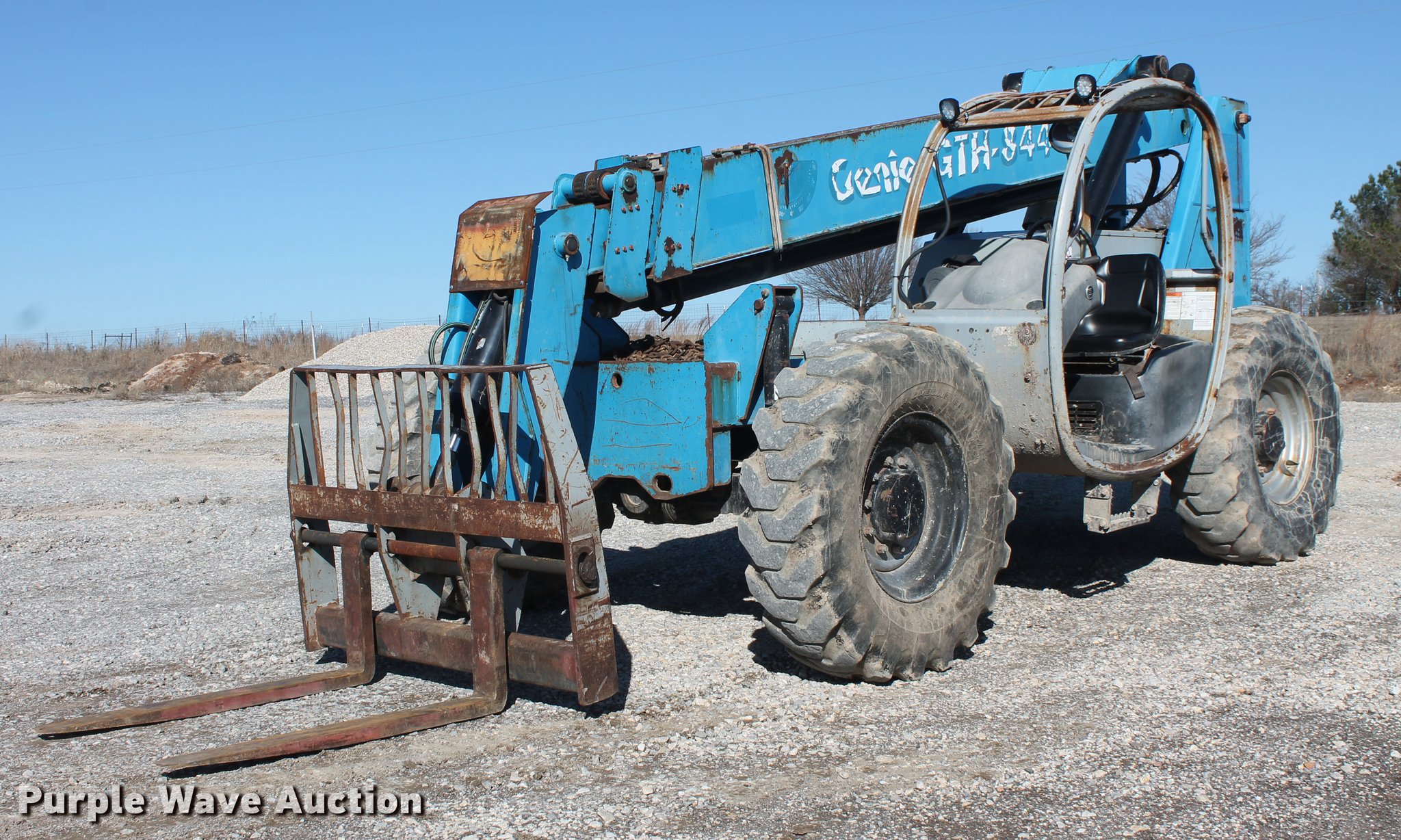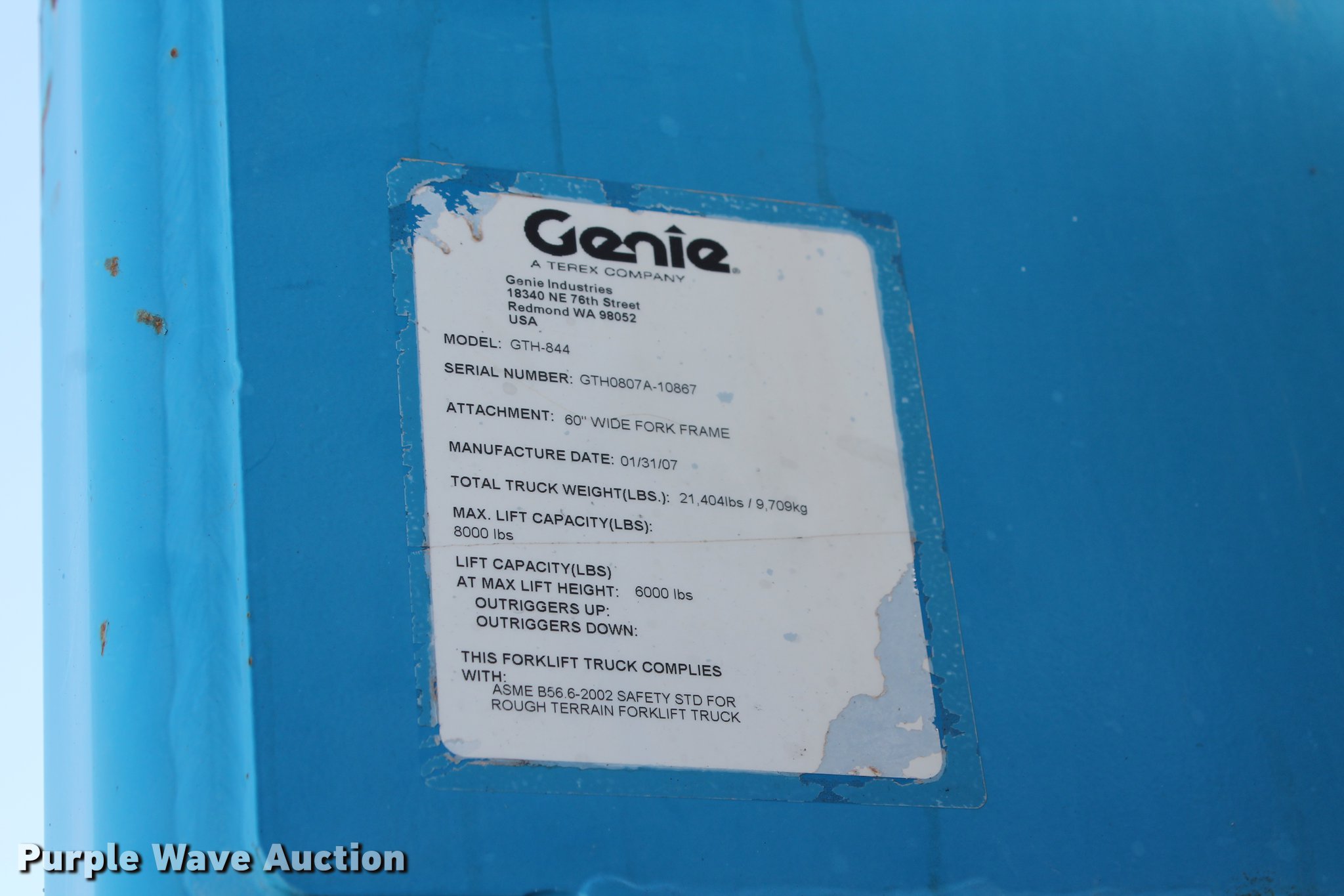Purple Wave is selling a used Telehandler in Oklahoma. This item is a 2007 Genie GTH-844 telehandler with the following: 1,334 hours on meter, John Deere 4045TF270B 4.5L four cylinder turbo diesel engine, 100 HP, Powershift transmission, 4F-4R gears, Four wheel drive, Locking differential, Crab steer, Four wheel steer, OROPS, Tilt cab, Work lights, 8,000 lbs maximum lift capacity, 44' maximum lift height, 28' maximum reach, Three stage boom, 48" fork length, 60"W tilt carriage, 14.00-24 tires, Serial GTH0807A-10687
