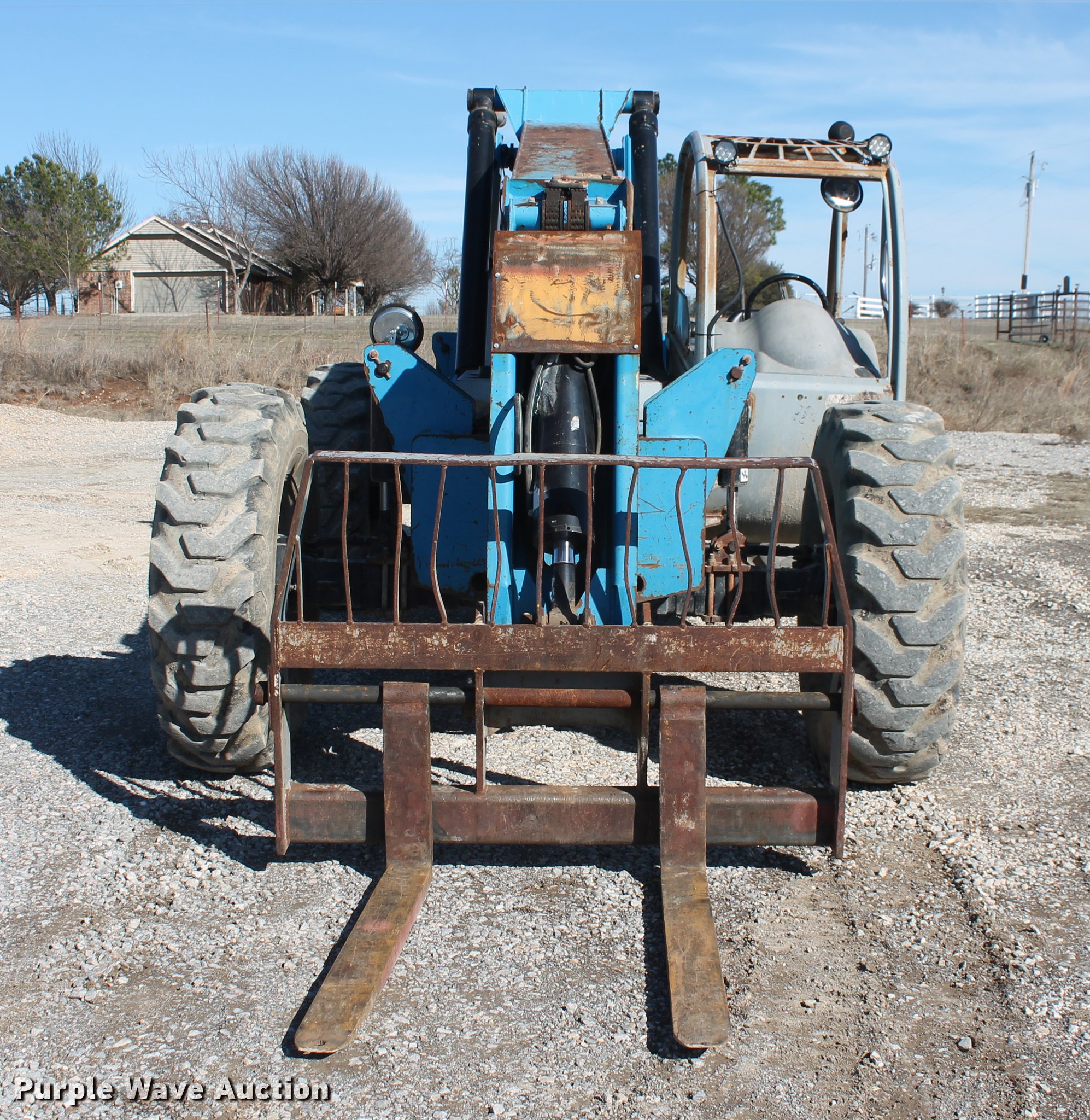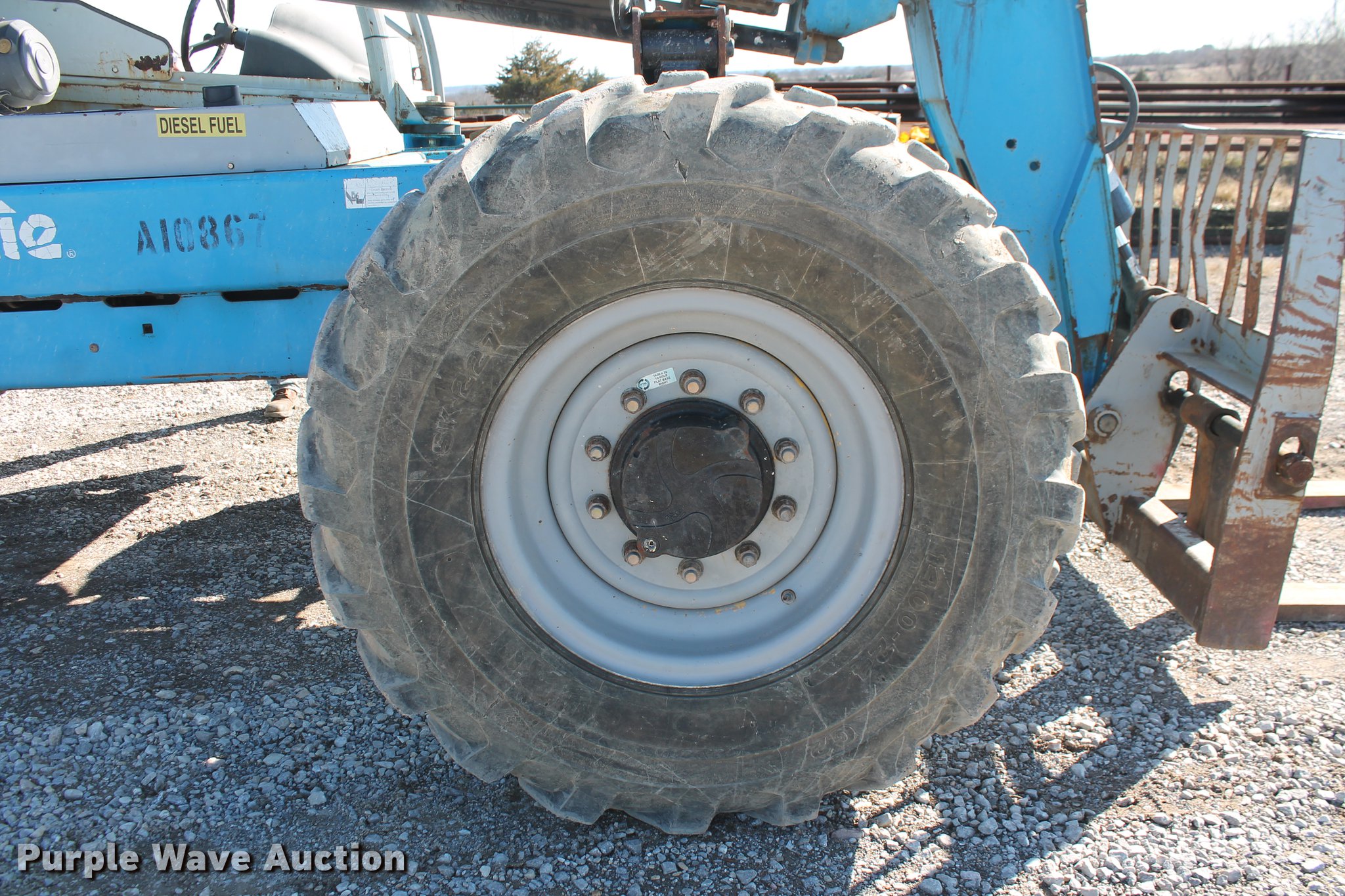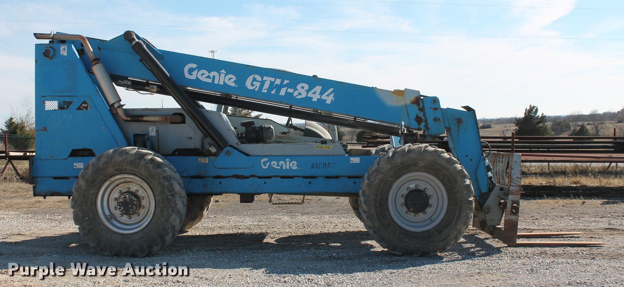Purple Wave is selling a used Telehandler in Oklahoma. This item is a 2007 Genie GTH-844 telehandler with the following: 1,334 hours on meter, John Deere 4045TF270B 4.5L four cylinder turbo diesel engine, 100 HP, Powershift transmission, 4F-4R gears, Four wheel drive, Locking differential, Crab steer, Four wheel steer, OROPS, Tilt cab, Work lights, 8,000 lbs maximum lift capacity, 44' maximum lift height, 28' maximum reach, Three stage boom, 48" fork length, 60"W tilt carriage, 14.00-24 tires, Serial GTH0807A-10687
