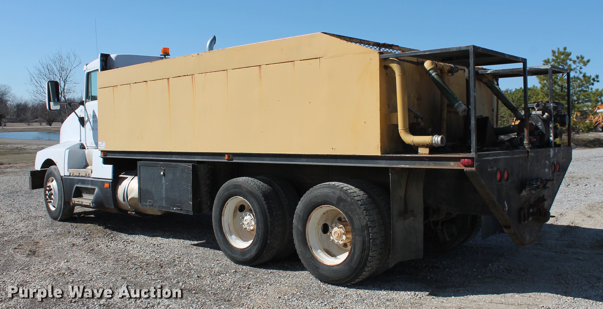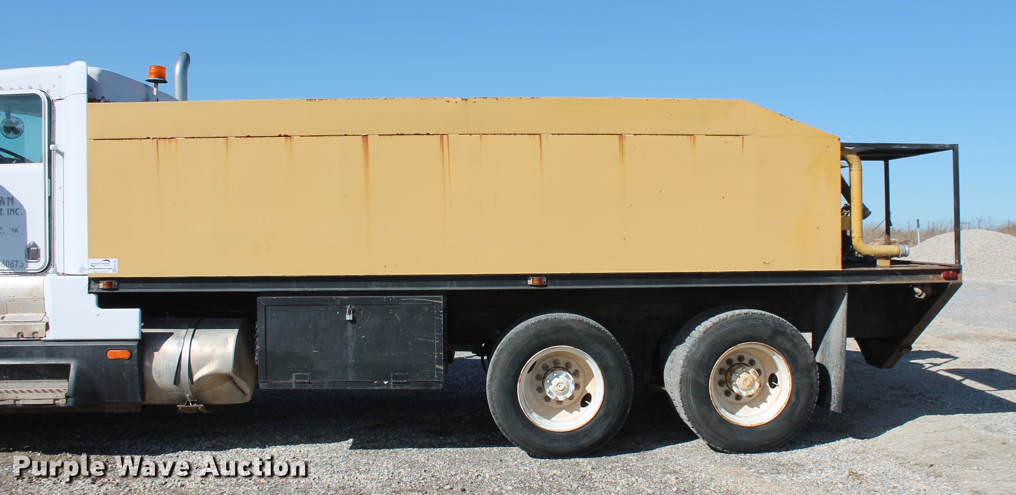 Purple Wave is selling a used Tank Truck or Water Truck in Oklahoma. This item is a 1990 Kenworth T600 tank truck with the following: 320,251 miles on odometer, Caterpillar 3406B 14.6L L6 turbo diesel engine, Manual transmission, Tandem axle, AC and heat, Cruise, Heated mirrors, Air suspension seat, Trailer brake controller, Front tow hooks, 20'L x 8'W tank, Subaru Robin EH30 gas engine, 9 HP, CH&E 4355KI7 self-priming pump, 2.5" and 3" plumbing, Side and rear discharge, Toolbox, Single exhaust stack, Dual fuel tanks, Pintle hitch, Gladhand connections, 230" wheelbase, Air suspension, Air brakes, 295/75R22.5 front tires