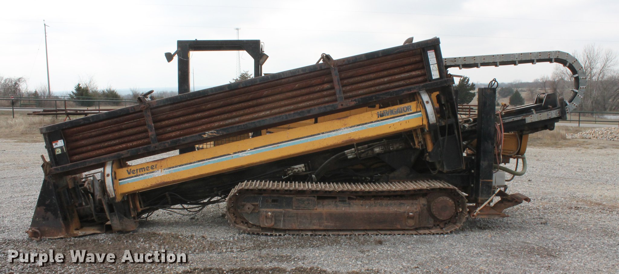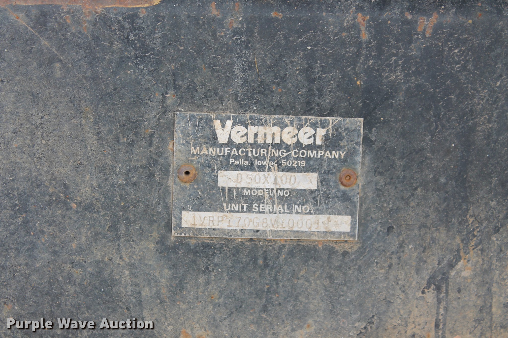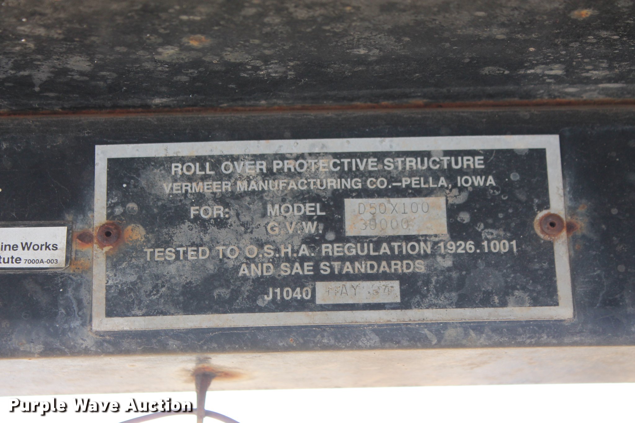 Purple Wave is selling a used Directional Boring Unit in Oklahoma. This item is a 1997 Vermeer D50X100 Navigator directional boring unit with the following: 6,080 hours on meter, Cummins 6BT5-9C 5.9L L6 turbo diesel engine, 185 gross HP, OROPS, 21"L x 93"W overall dimensions, (18) drill stems, 15'L x 3.5" diameter, Auto rod loader, Kerr triplex pump, 150 gallon per minute capacity, 1,000 psi, 4.5" diameter minimum bore, Hydraulic pipe vise, 49,600 lbs pull back, 38,000 lbs thrust, 10,000 lbs torque, Rear hydraulic stabilizers, Steel triple grouser track pads, Serial 1VRP170G8V1000184