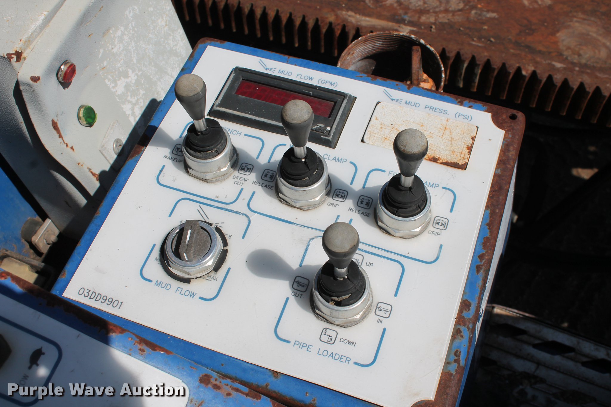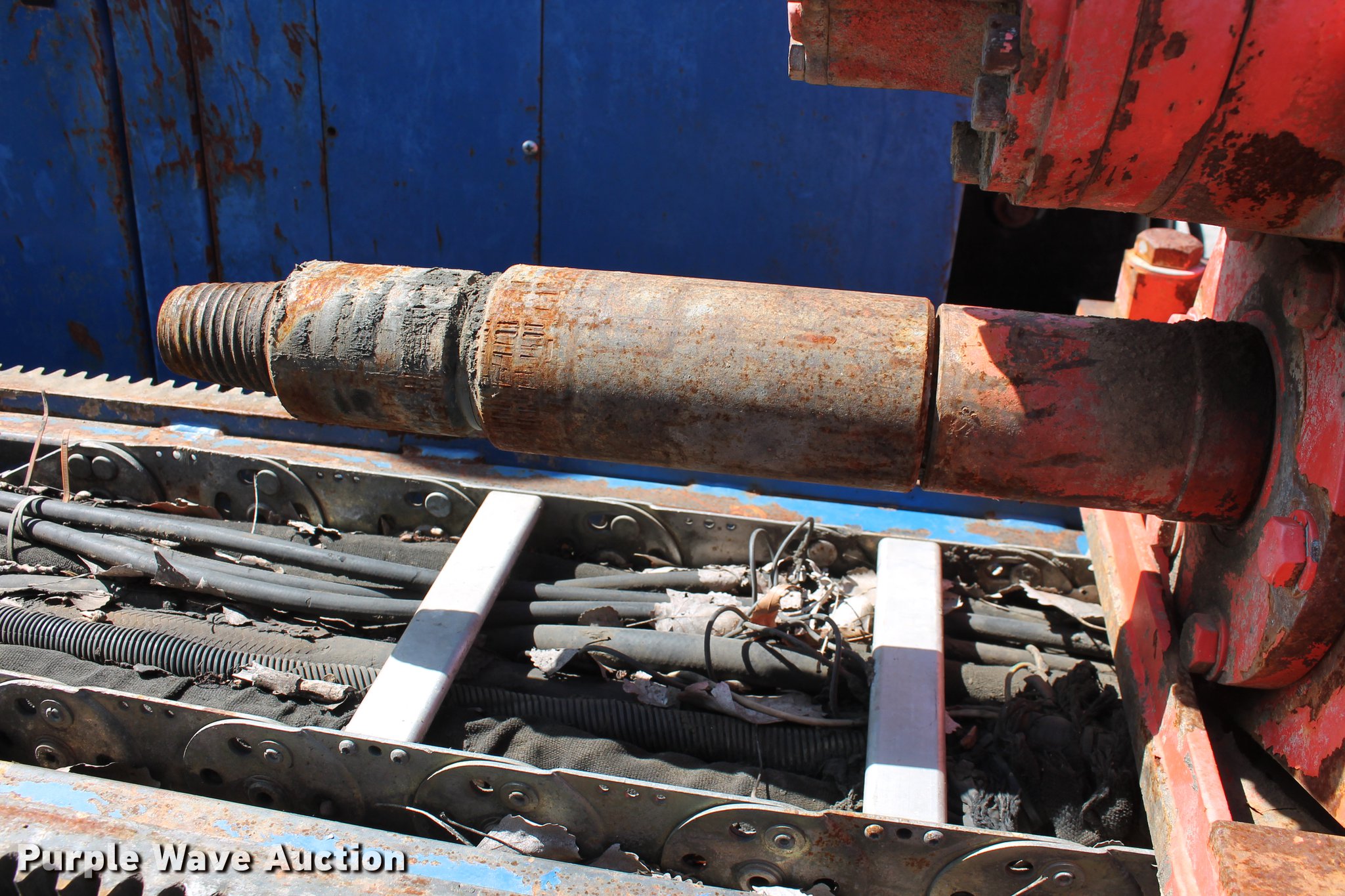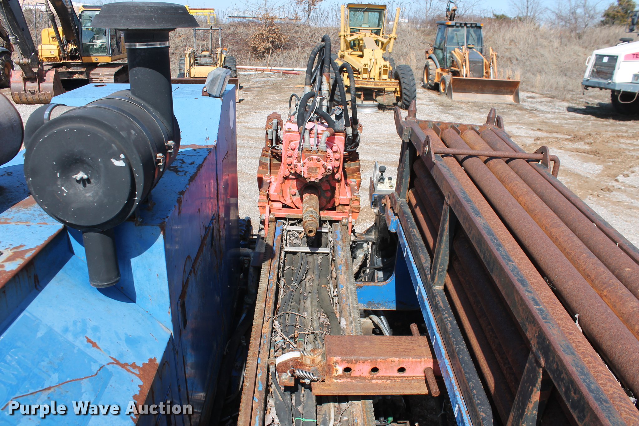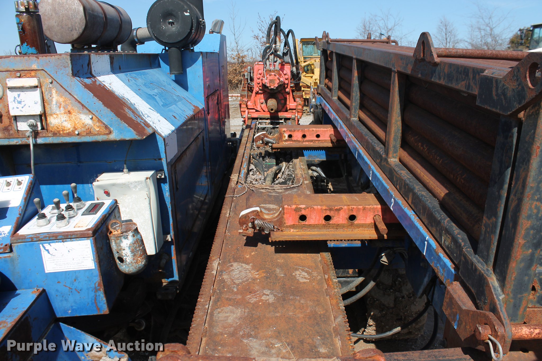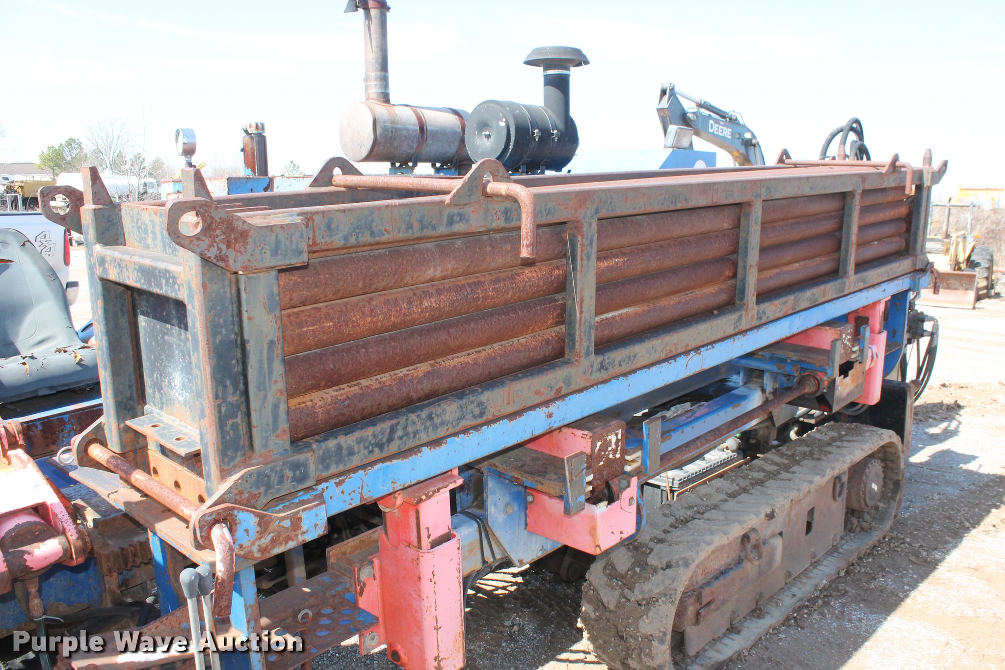 Purple Wave is selling a used Directional Boring Unit in Oklahoma. This item is a 2000 American Augers DD-4 directional drill with the following: 2,448 hours on meter, John Deere 6068TF155 six cylinder turbo diesel engine, 155 HP, 20'L x 7'W overall, (24) 10'L x 2 5/8" diameter drill stems, Auto rod loader, Hydraulic pump vise, FMC Bean Triplex pump, 100 gpm, 33,500 lbs thrust/pullback, 4,000 lbs torque, Rear hydraulic stabilizers, 12"W rubber tracks, Serial DD40570900