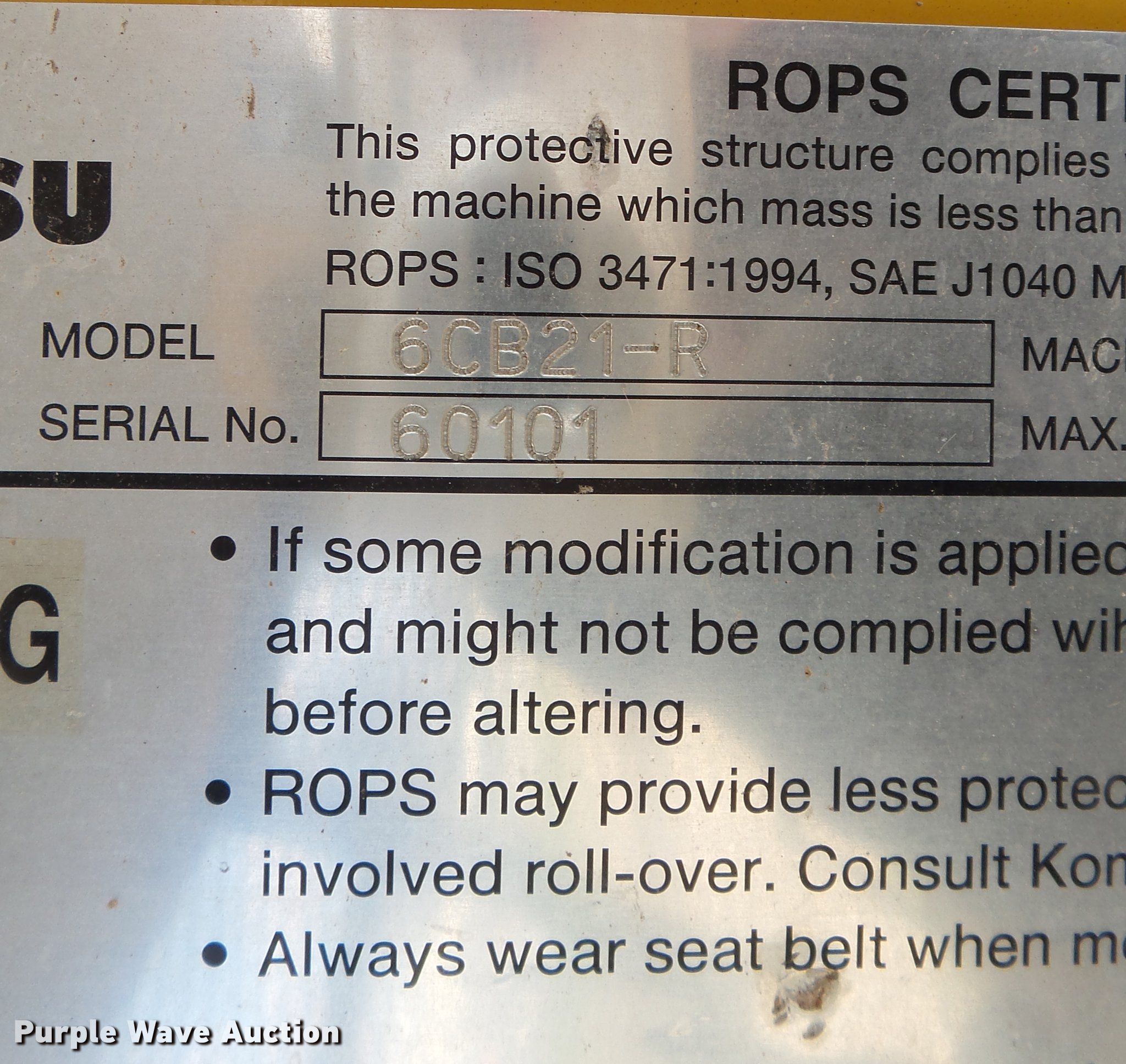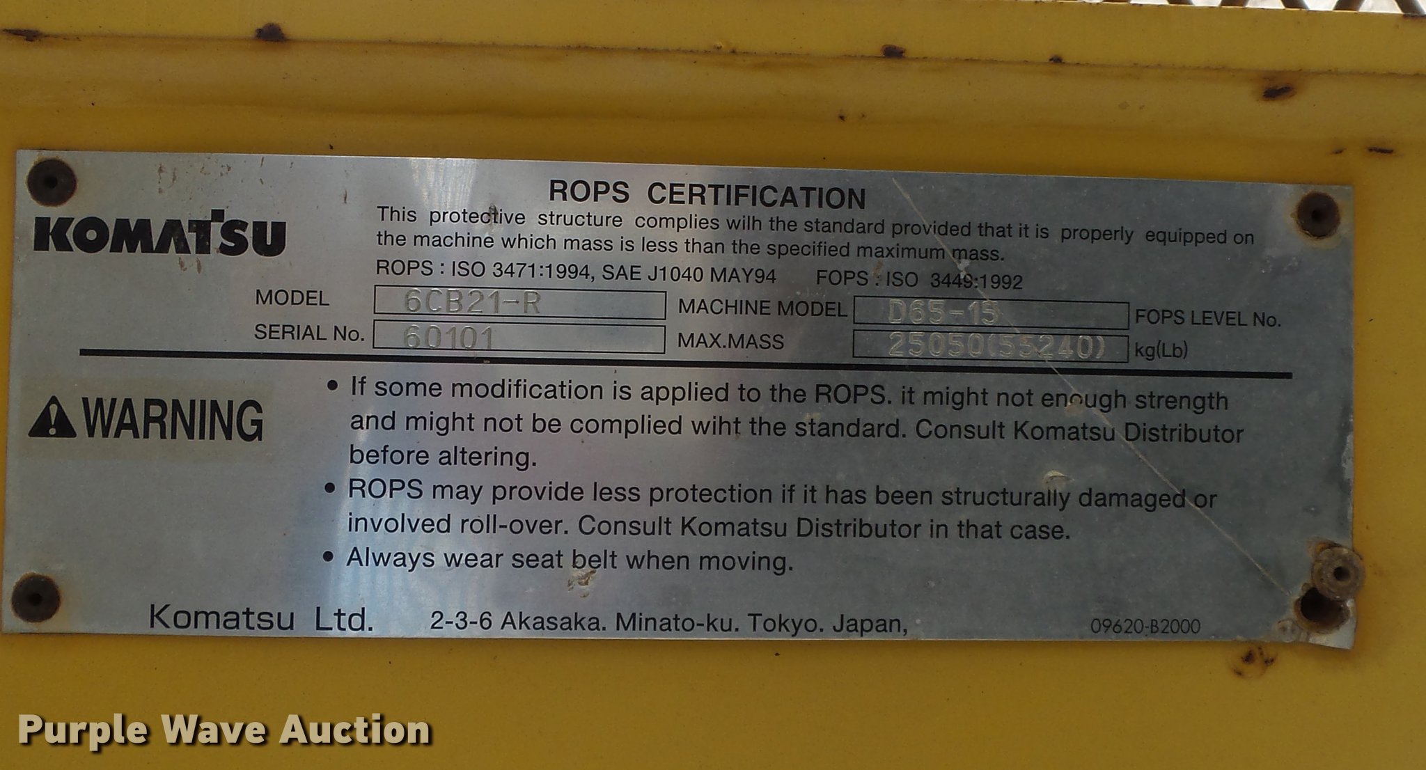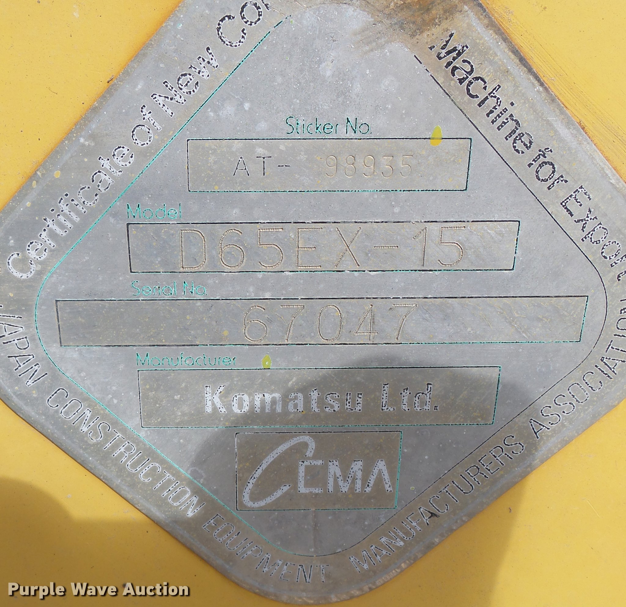 Purple Wave is selling a used Crawler Dozer in Missouri. This item is a 2003 Komatsu D65EX-15 dozer with the following: 6,439 hours on meter, Komatsu SA6D125E3 11.045L six cylinder turbo diesel engine, 207 HP, Powershift transmission, 3F-3R gears, Canopy, Serial A3009, Suspension seat, Joystick control steering, Screen guards, Rear work lights, 135" Semi-U single tilt dozer blade, Rear draw bar, Eight bottom rollers, 26"W single grouser track pads, Serial 67047