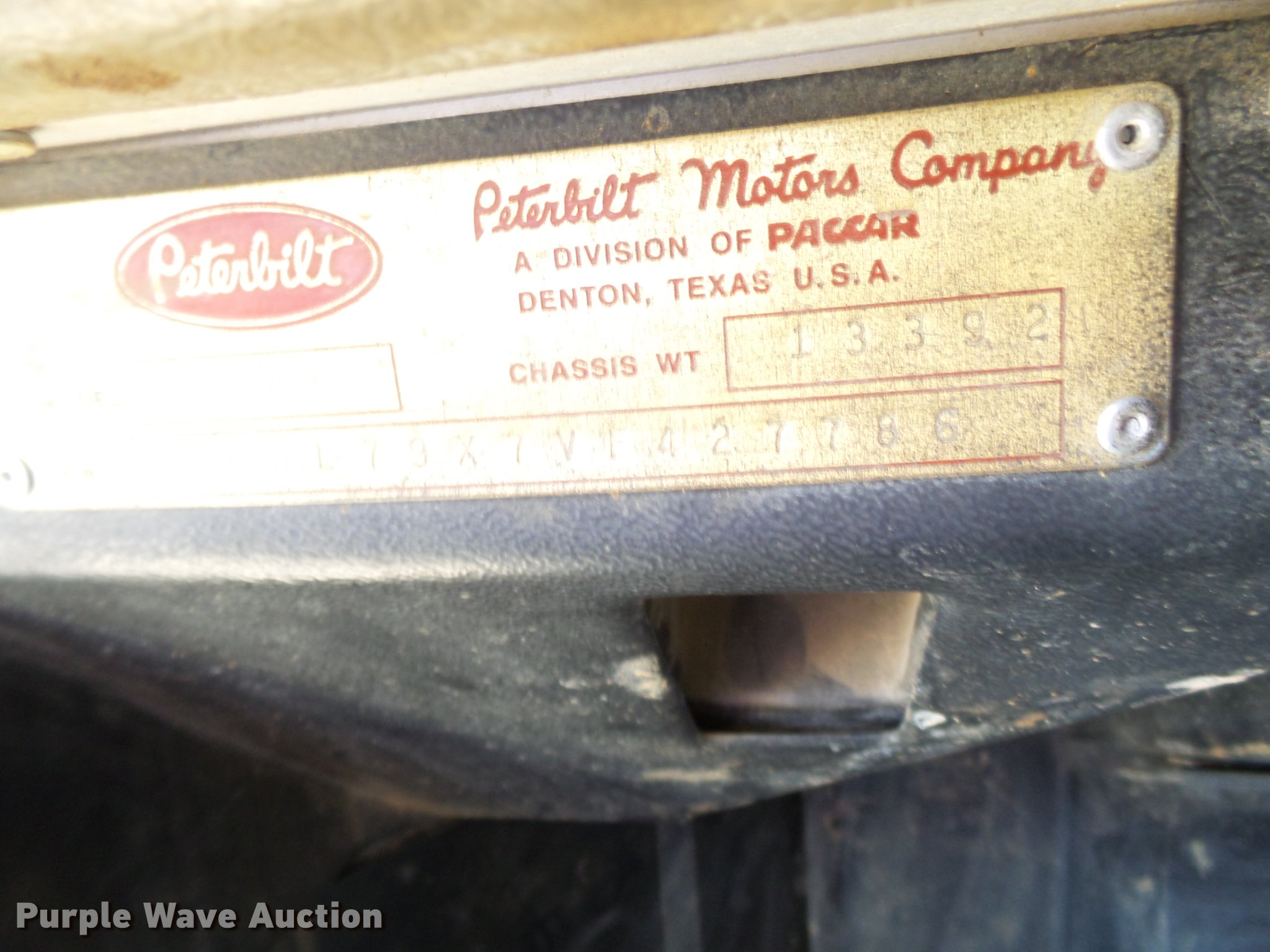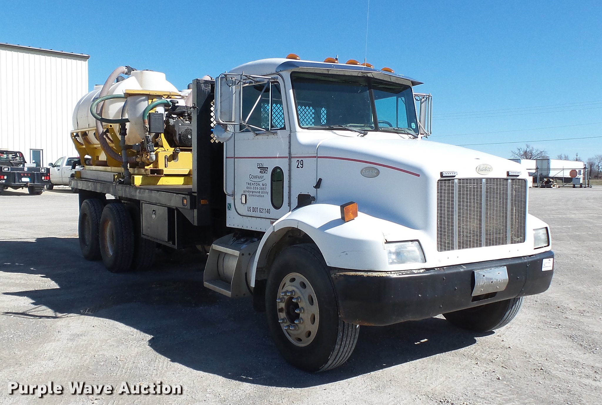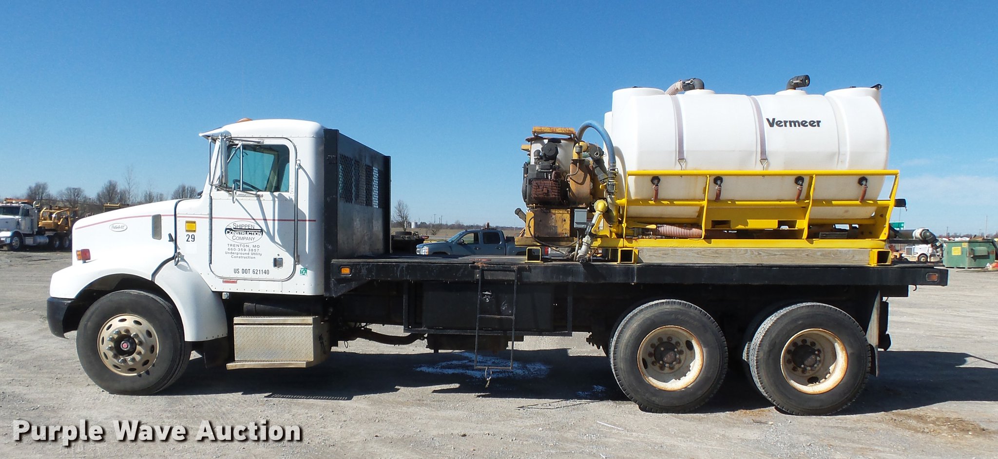 Purple Wave is selling a used Flat Bed Truck in Missouri. This item is a 1997 Peterbilt 330 flatbed truck with mixing system with the following: 293,685 miles on odometer, 15,540 hours on meter, Cummins C 8.3L L6 turbo diesel engine, Serial 45370310, Eaton Fuller nine speed manual transmission, Tandem axle, AC and heat, AM/FM/cassette, Heated mirrors, Air suspension seat, Front tow hooks, Exterior visor, Knapheide flatbed, 18.5'L x 8'W wood deck, Headache rack, Stake side pockets, Toolbox, (2) 2009 Vermeer MX240 mixing systems, 750 gallon poly tanks, Kohler gas engine, 25 HP, Serial 1VR3120P19000726, 1VR6120P19000723, Single exhaust stack, Single fuel tank, Pintle hitch, Trailer wiring, 228" wheelbase, Air suspension, Air brakes, 11R22.5 tires, GVWR 50,000 lbs, AC belt removed, Windshield cracked, Unit# 29