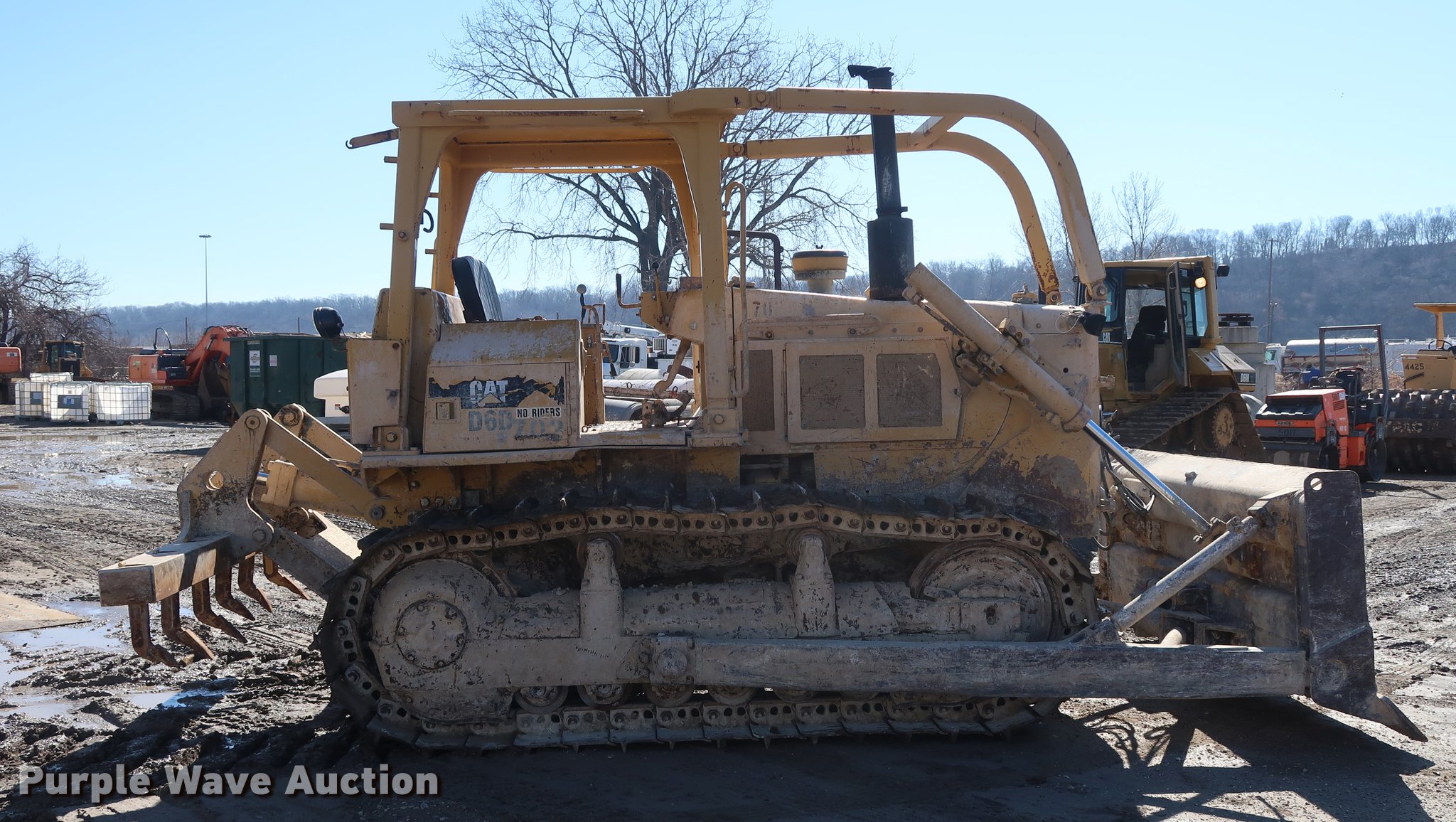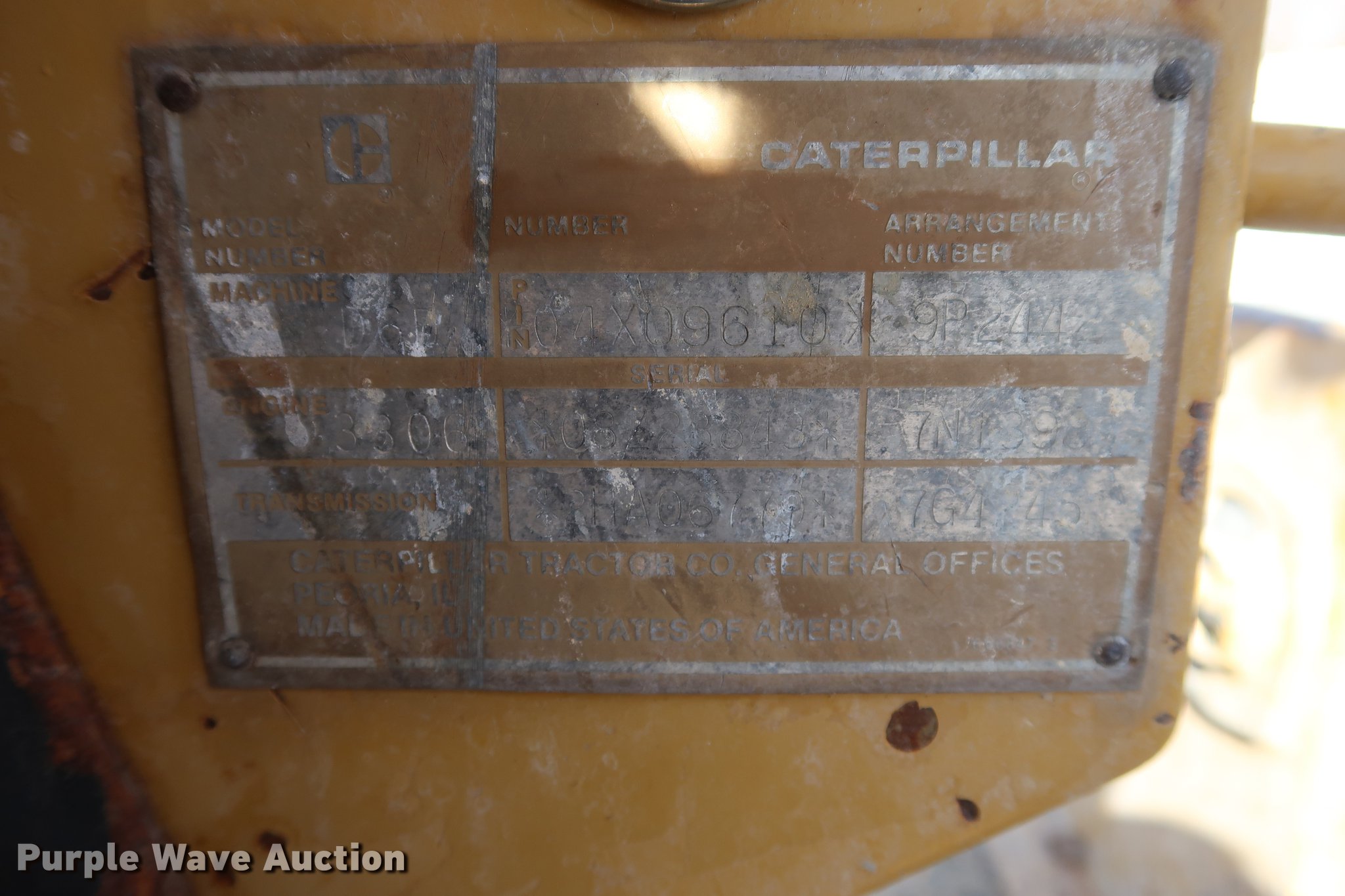 Purple Wave is selling a used Crawler Dozer in Missouri. This item is a 1984 Caterpillar D6D dozer with the following: 1,685 hours on meter, Caterpillar 3306 six cylinder turbo diesel engine, Powershift transmission, 3F-3R gears, Canopy, Clutch brake steering, 120"W blade, Ripper, (8) shanks, 22" single grouser track pads, Rear ripper currently plumbed through blade tilt valve, Serial 04X09610, Unit# 703