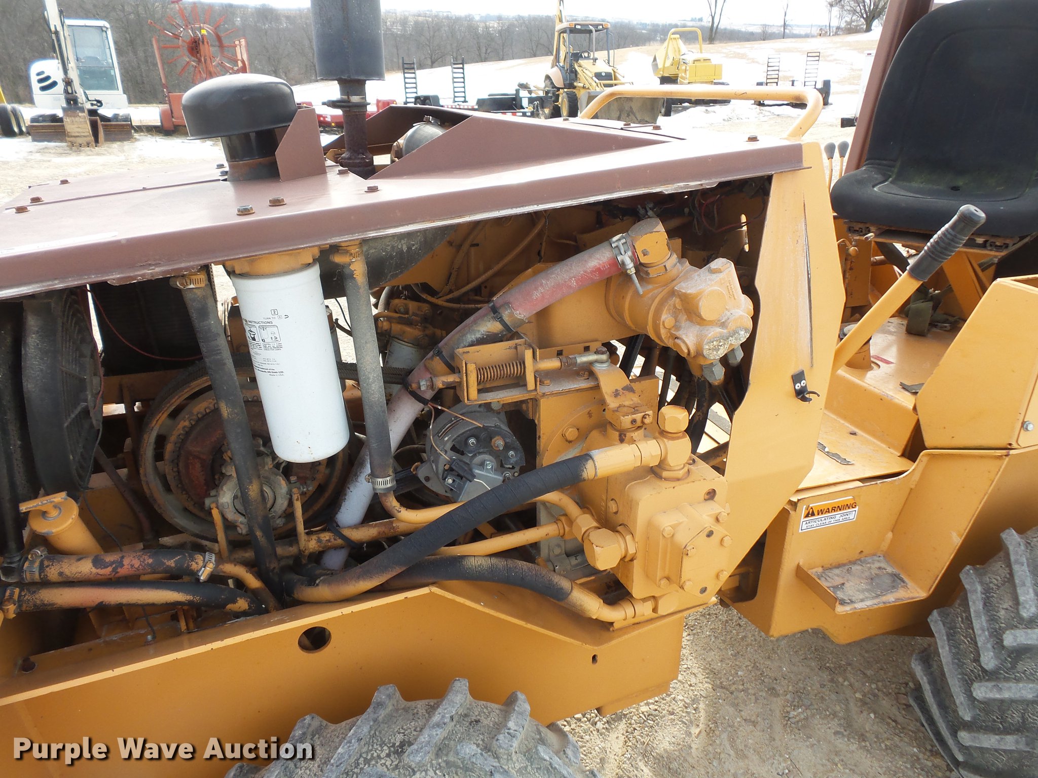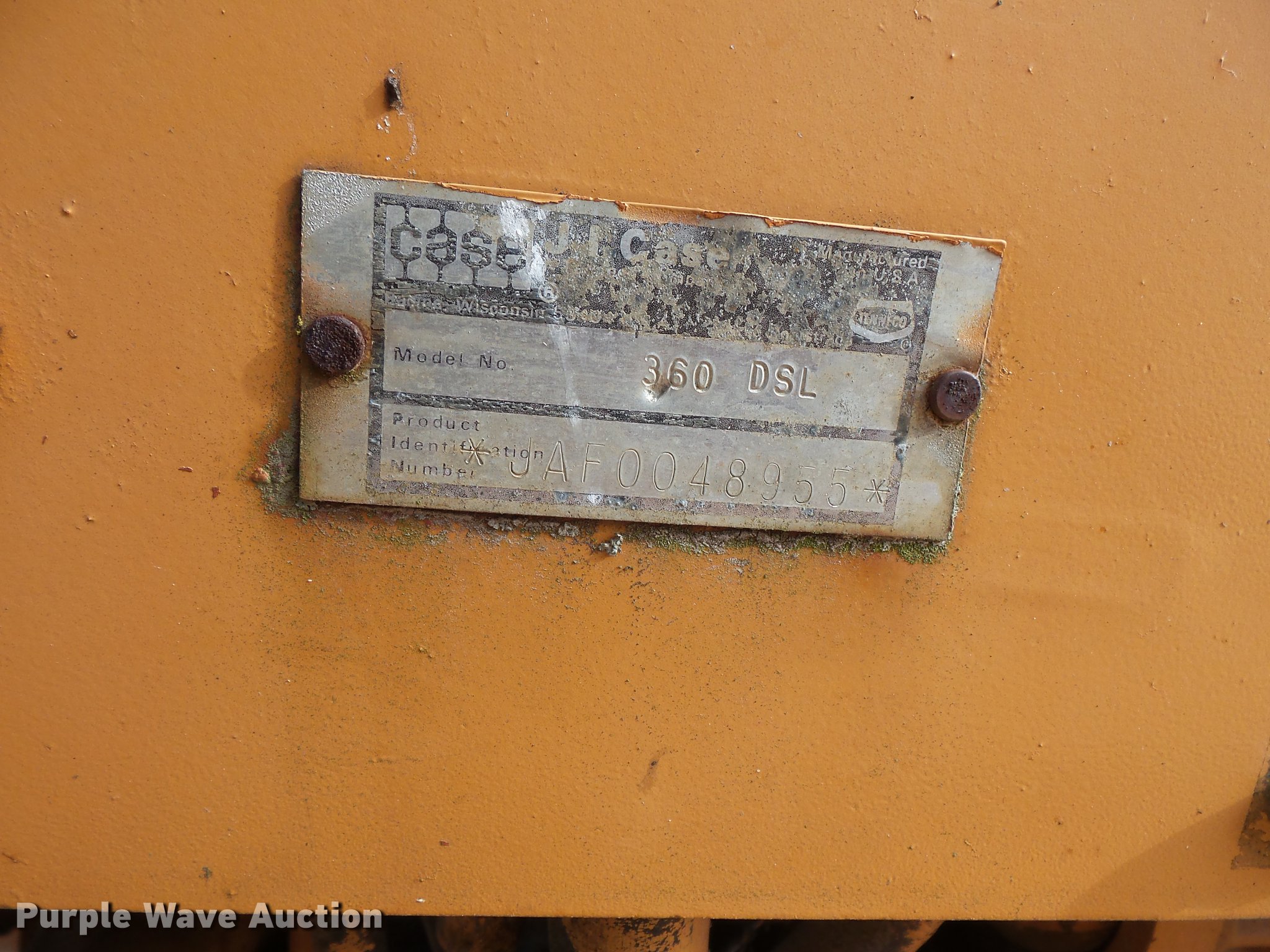 Purple Wave is selling a used Trencher or Rock Saw in Wisconsin. This item is a Case 360DSL trencher with the following: 352 hours on meter, Two cylinder diesel engine, Hydrostatic transmission, Four wheel drive, OROPS, Rotating seat, P60 vibratory plow, Hydraulic side shift, 72"L trencher boom, 5" cutting width, 8" end idler diameter, Dirt teeth, 26 x 12.00-12 tires, Additional parts, Hydra bare attachment, No plow shank, Serial JAF0048955