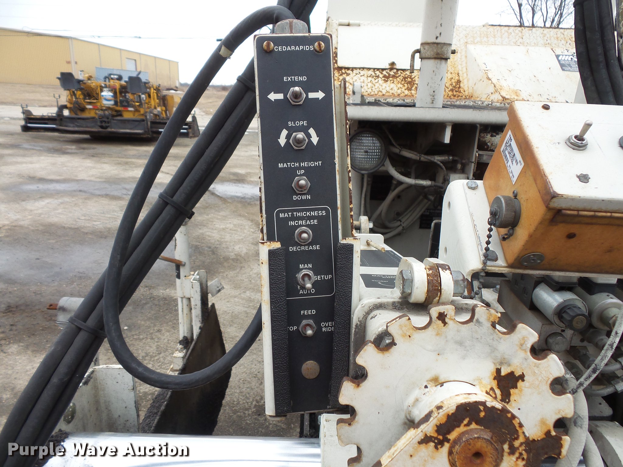 Purple Wave is selling a used Paver or Screed in Illinois. This item is a 2002 Cedarapids CR351 paver with the following: 1,635 hours on meter, Cummins four cylinder turbo diesel engine, Hydrostatic transmission, Dual operating stations, Protective cover, 8' to 16' paving width, 10'W front spread hopper, 2' extension wings and auger, Diesel fired screed heater, Ground level remote, Grade and slope controls, Sonic, Skies included, Goodyear 18.4-26 tires, Serial 04-2002