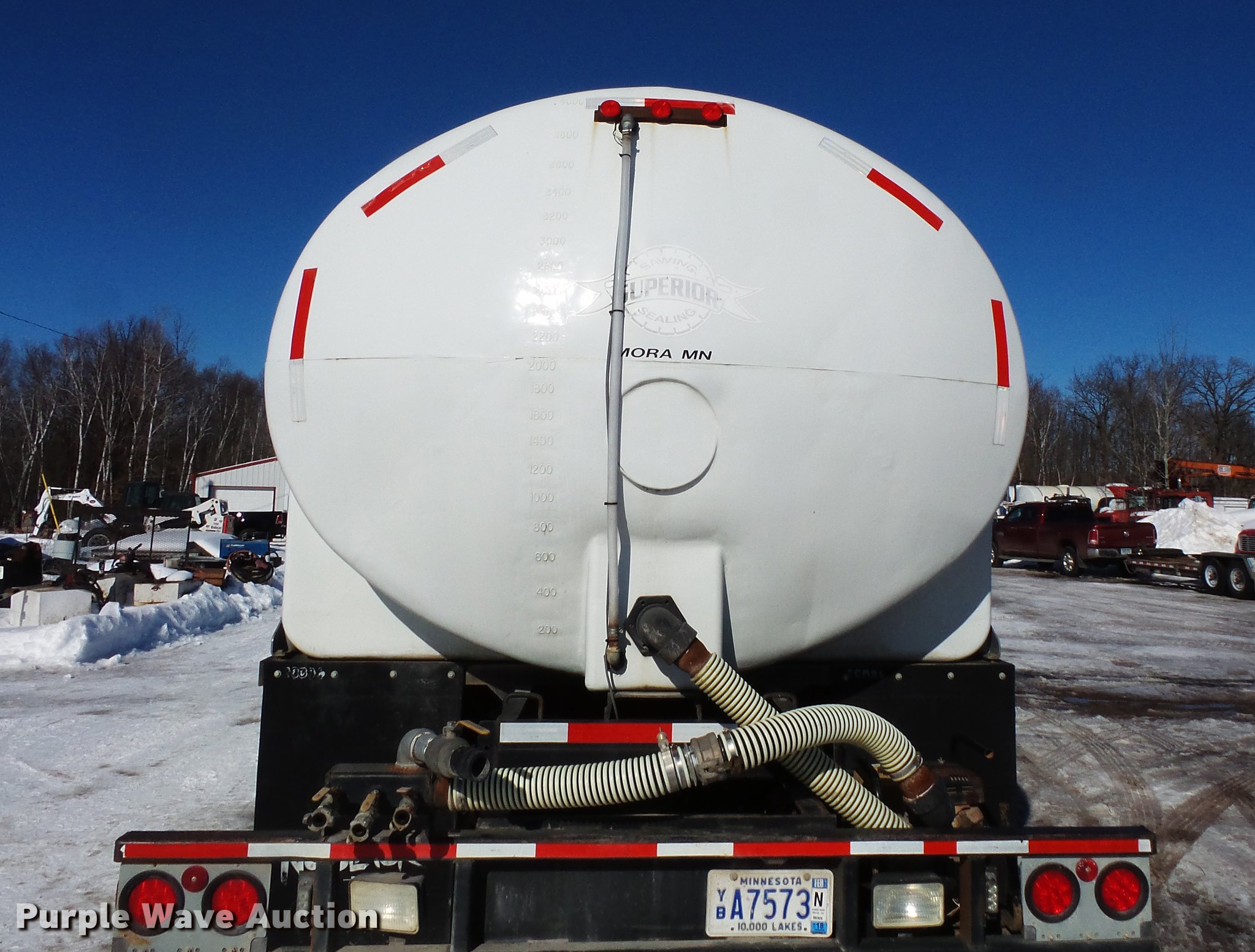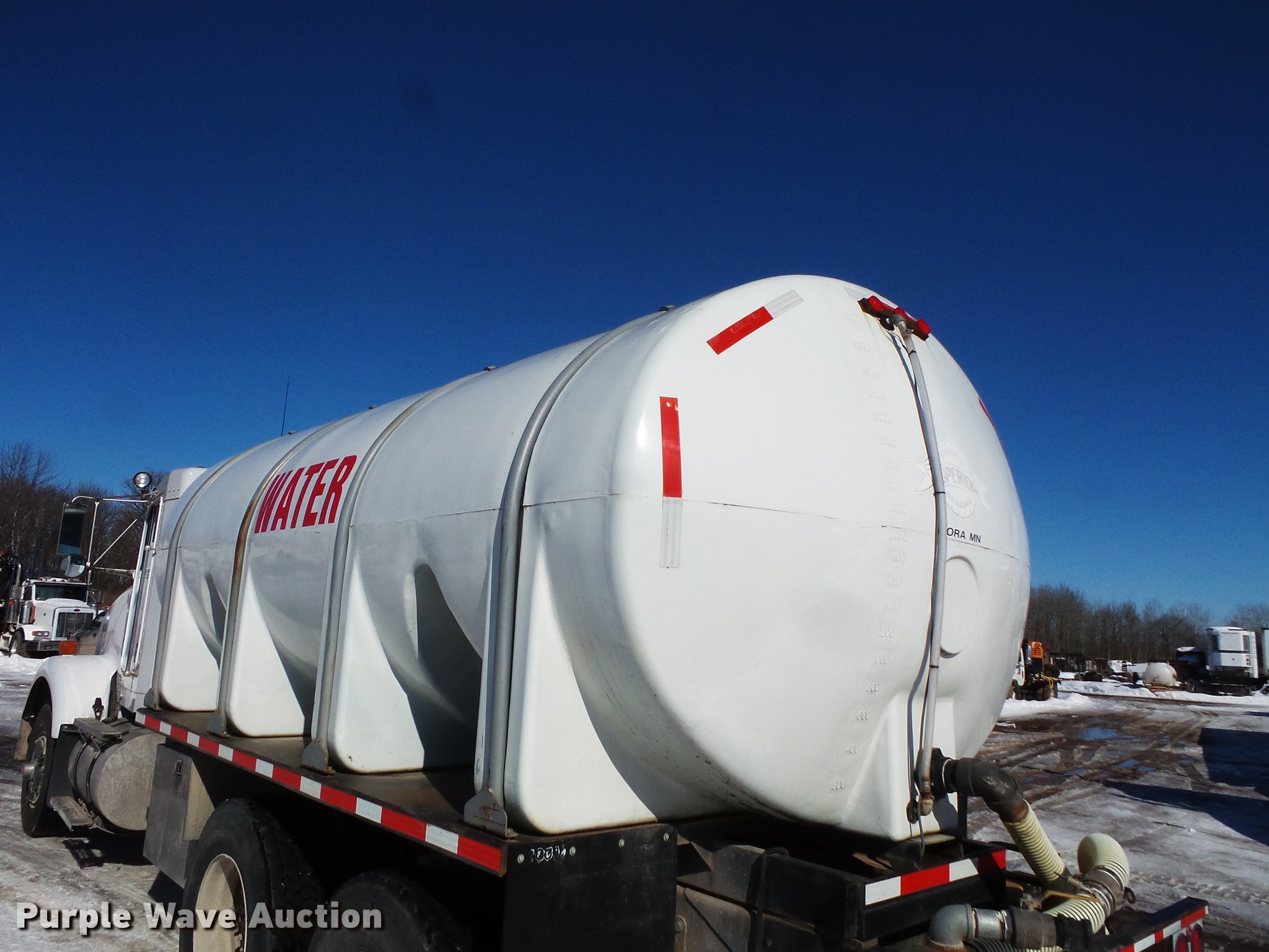 Purple Wave is selling a used Tank Truck or Water Truck in Minnesota. This item is a 1991 Kenworth T800 tank truck with the following: 129,675 miles on odometer, Caterpillar 3406B 14.6L L6 turbo diesel engine, Nine speed manual transmission, Tandem axle, AC and heat, Heated mirrors, Air suspension seat, Block heater, 4,050 gallon poly tank, Subaru PX30 gas engine, Baffles, 3" rear discharge, Top fill, Sight tube, Dual fuel tanks, Single exhaust stack, Receiver hitch, Trailer wiring, Spring suspension, Air brakes, 11R22.5 tires, GVWR 50,000 lbs