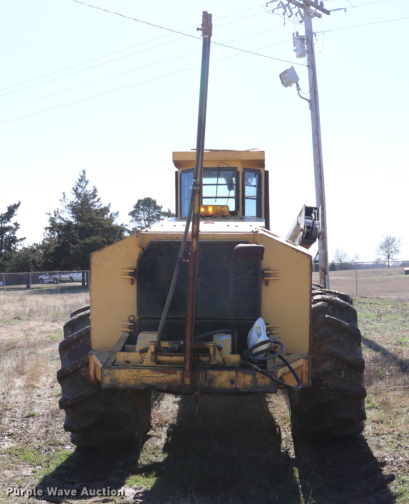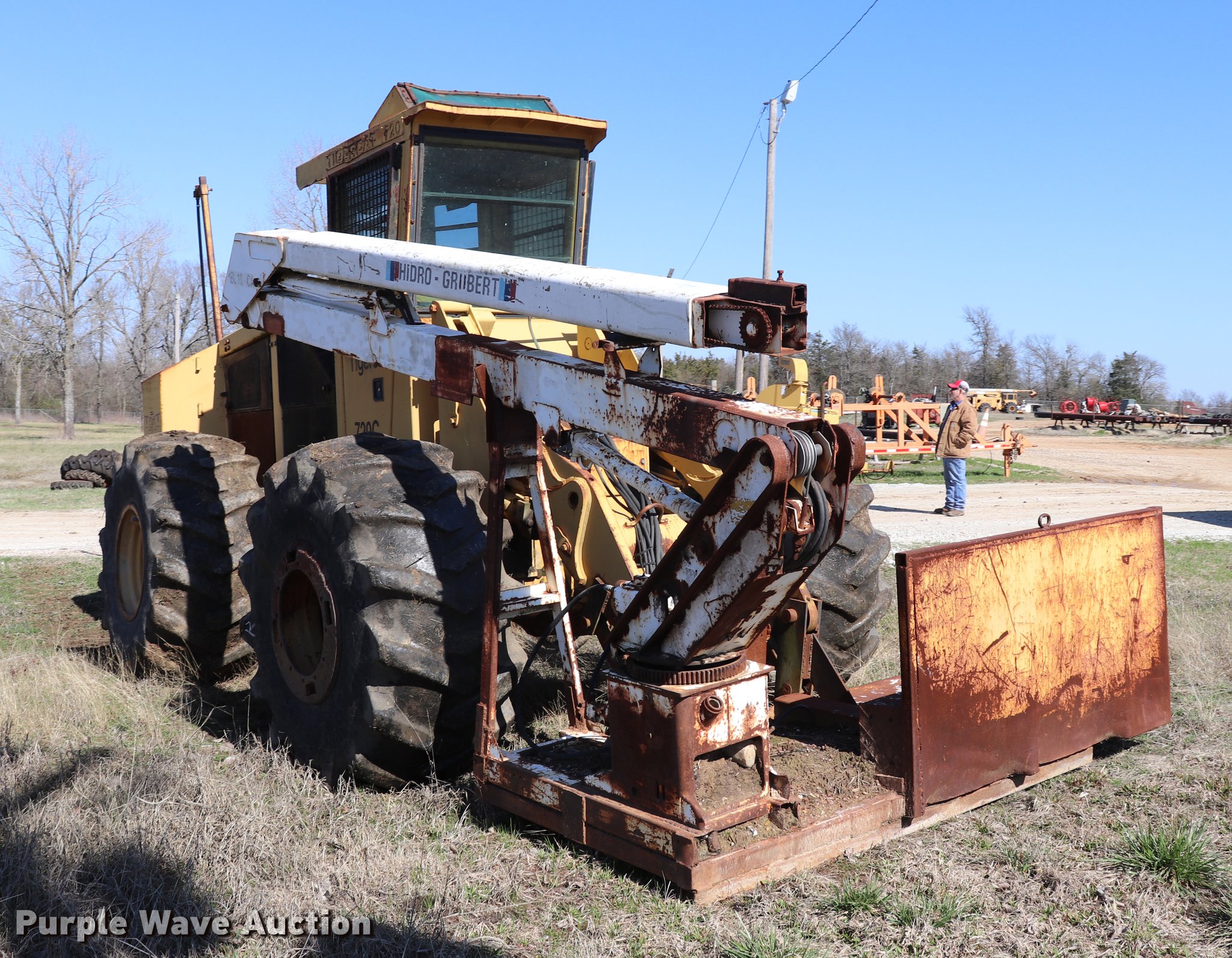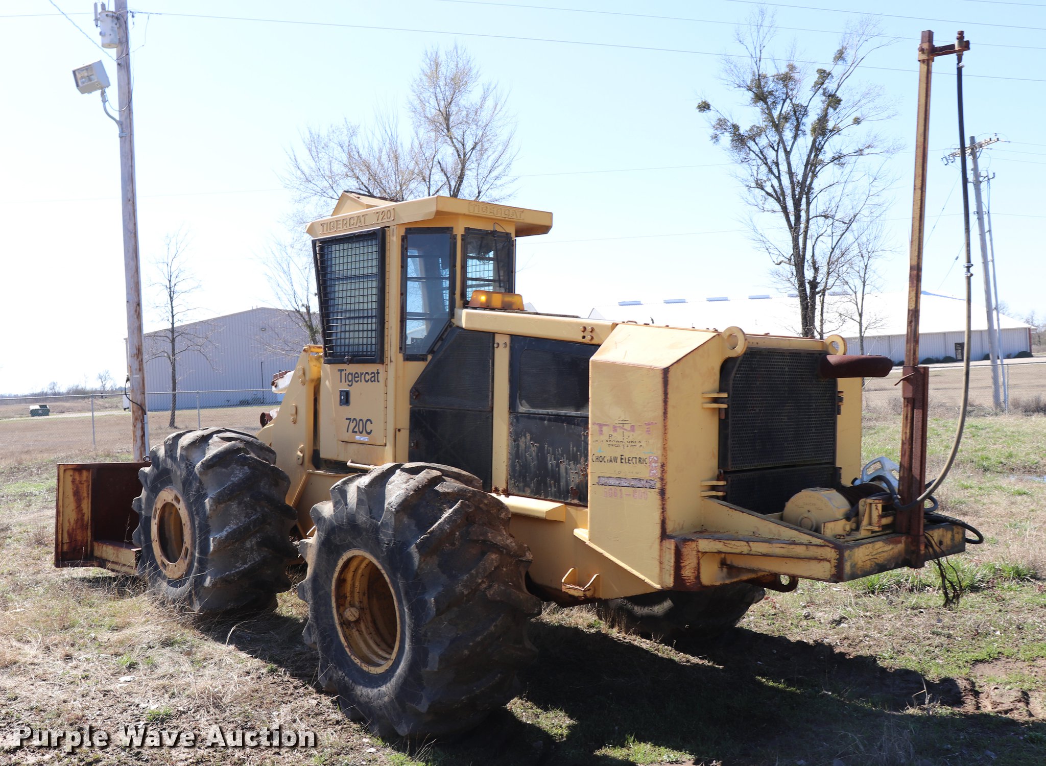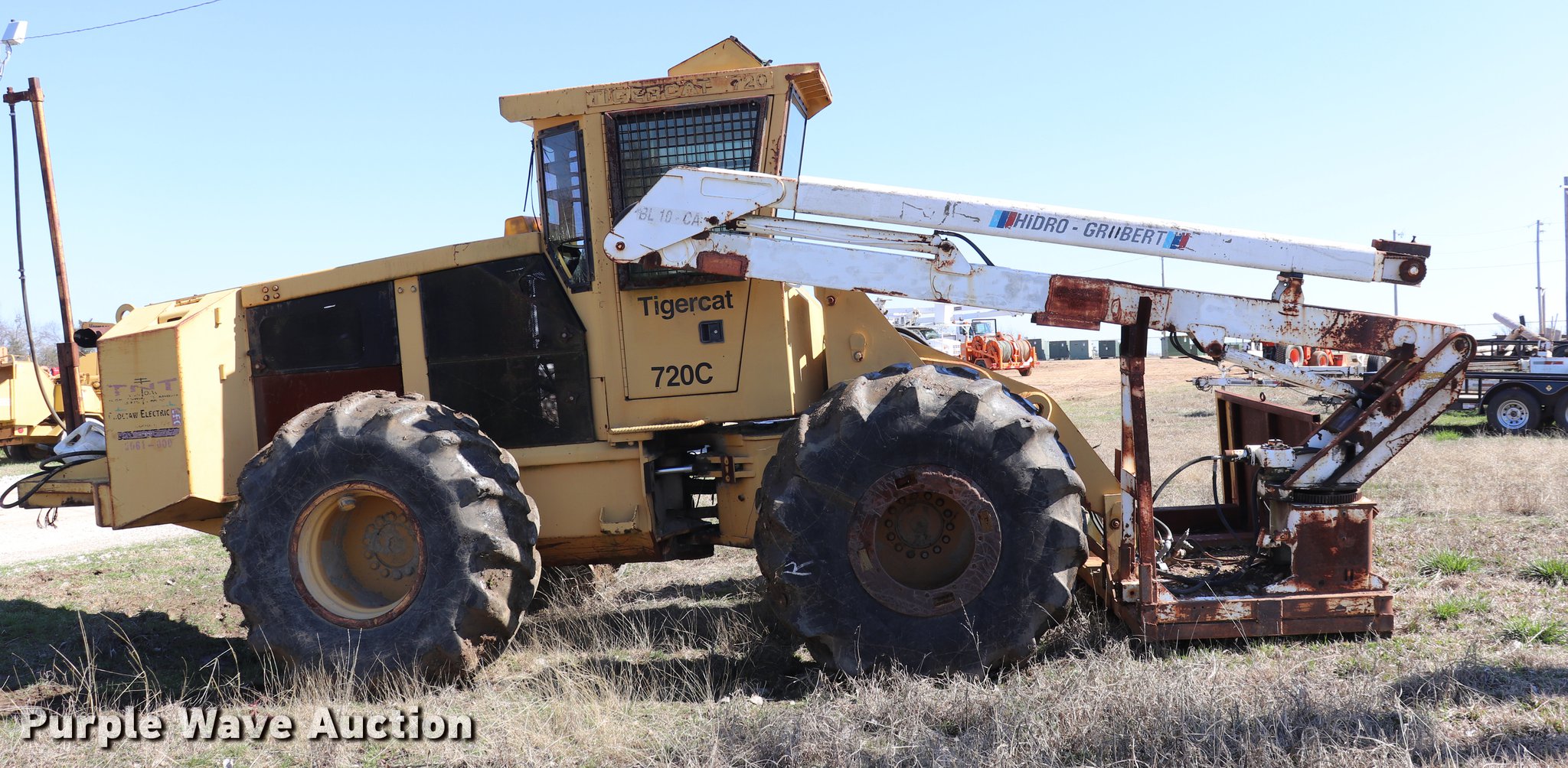Tigercat 720C feller buncher. 9,233 hours on meter, Six cylinder turbo diesel engine, Hydrostatic transmission, AC and heat, AM/FM/cassette, Suspension seat, Hydraulic lift, Ramsey 800R winch Serial 438497, Hidro Grubert boom, 25'L x 10'W overall, 10' overall height, 20" ground clearance, 28L-26 tires, Unknown operating condition, Right side glass broken, No cutter head, Serial 7201147. Choctaw Electric Cooperative. 1033 N 4250 Rd. Hugo, OK 74743