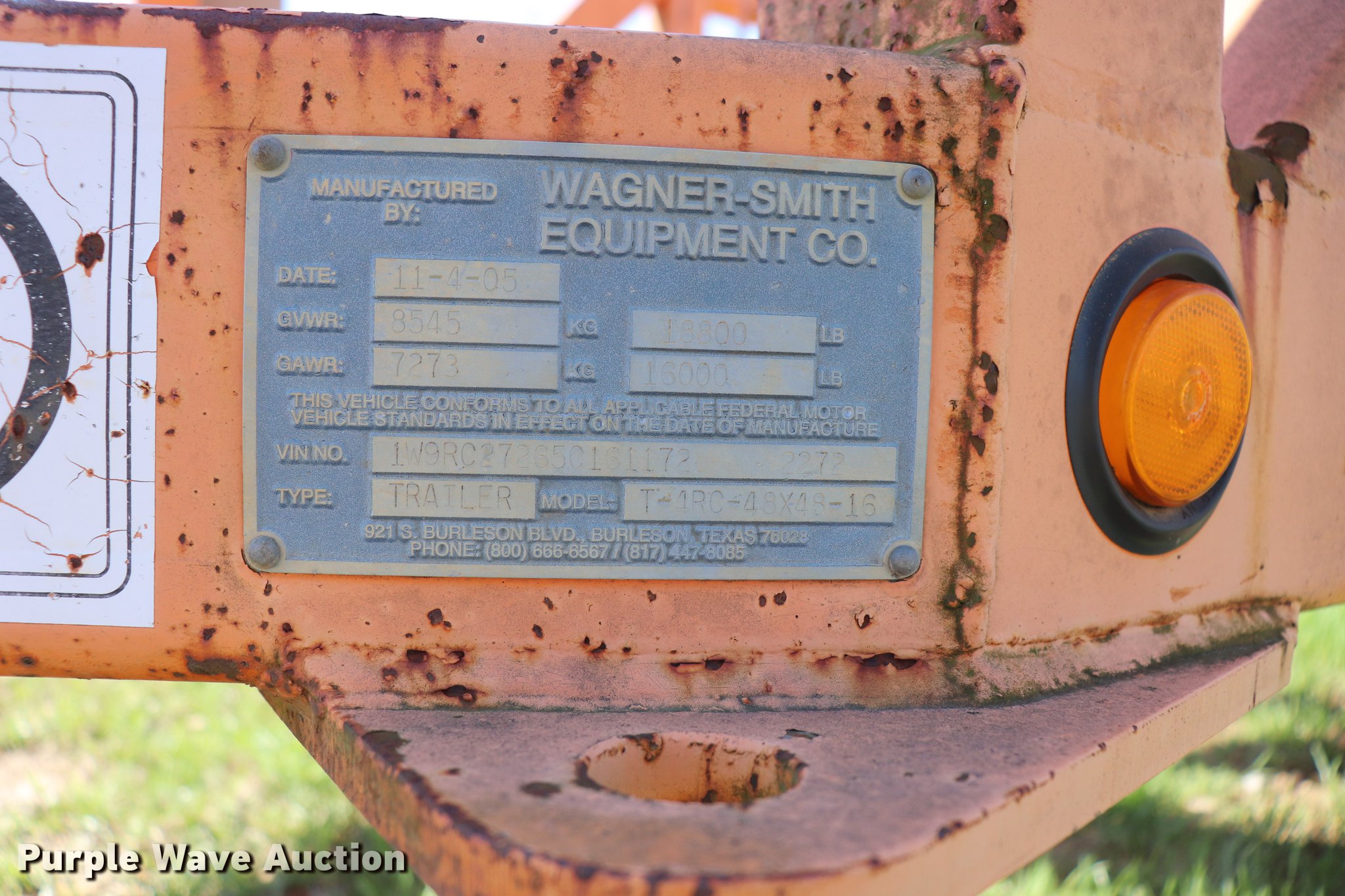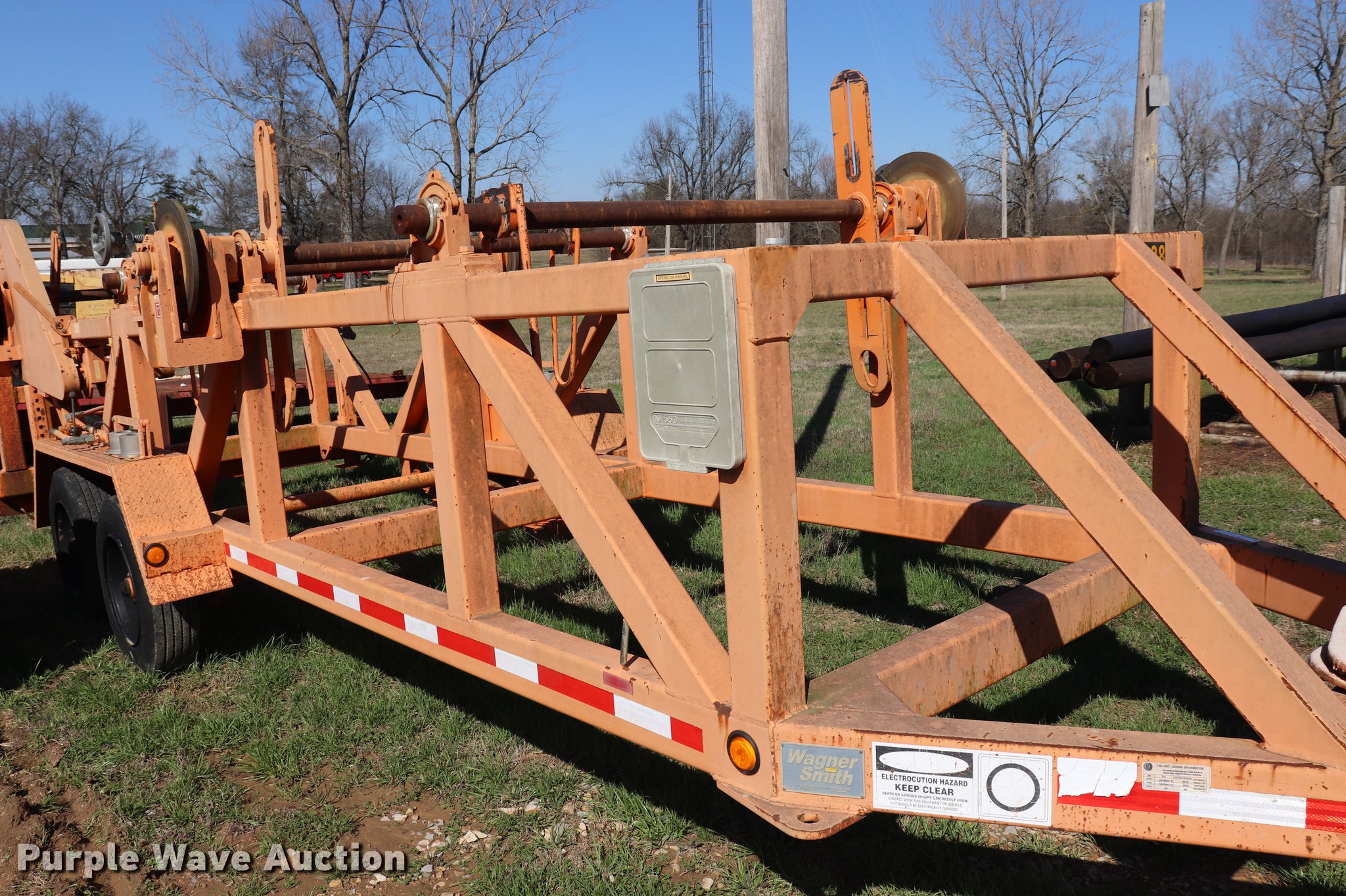 Purple Wave is selling a used Reel Trailer in Oklahoma. This item is a 2005 Wagner Smith reel trailer with the following: 26' overall length, Four reel capacity, Hydraulic control, Steel construction, (2) rear stabilizing jacks, Pintle hitch, Single leg landing gear, Tandem axle, 215/75R17.5 tires, GVWR 8,545 lbs