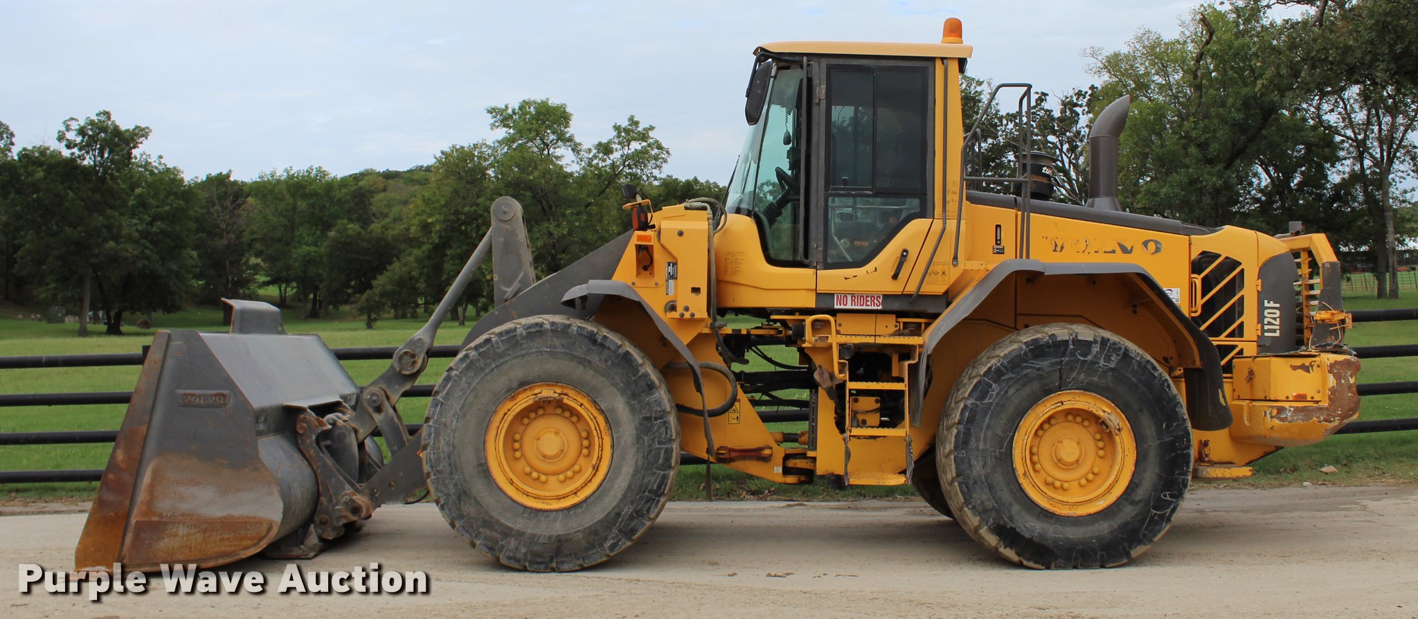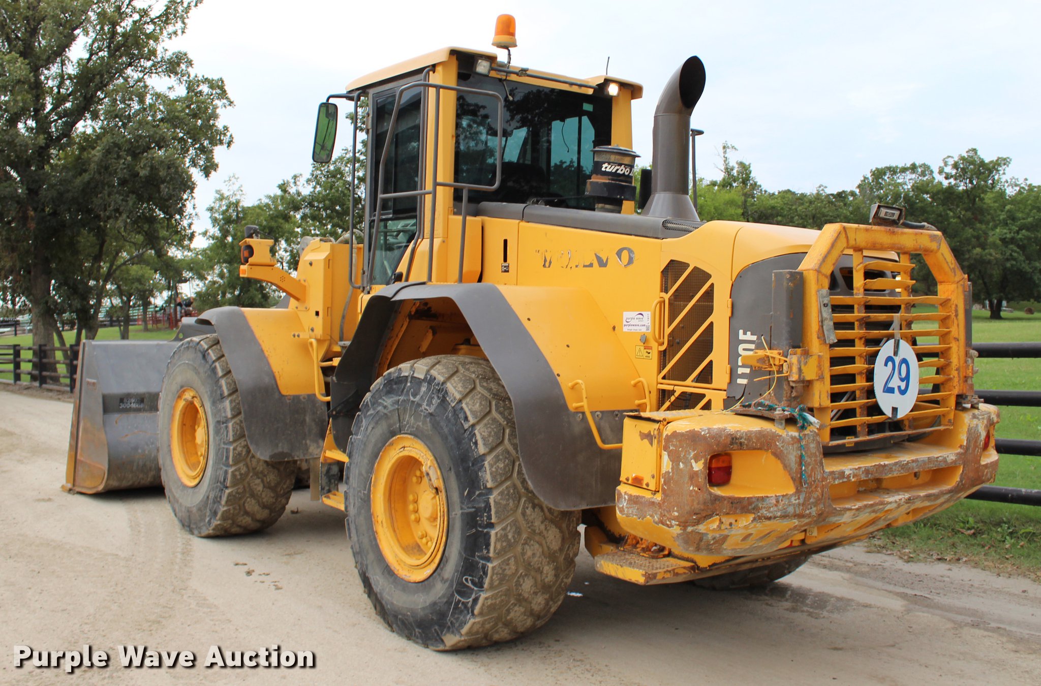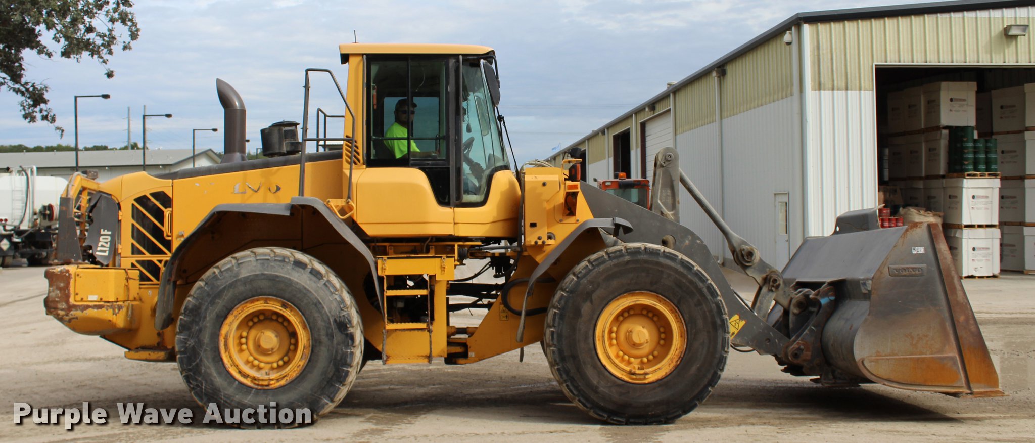 Purple Wave is selling a used Wheel Loader in Oklahoma. This item is a 2008 Volvo L120F wheel loader with the following: 29,597 hours on meter, Volvo D7ELAE3 7.14L six cylinder diesel engine, 217 HP, Powershift transmission, 4F-4R gears, Differential lock, EROPS, AC and heat, AM/FM/CD, Two-lever bucket controls, Suspension seat, Wipers, Backup camera, Forestry package, Volvo 115"W general purpose bucket, 4.58 cu. yd. capacity, Bolt-on cutting edge, Self-leveling, Counterweights, Wheel weights, 23.5R25 tires, Serial VCEL120FL0006566