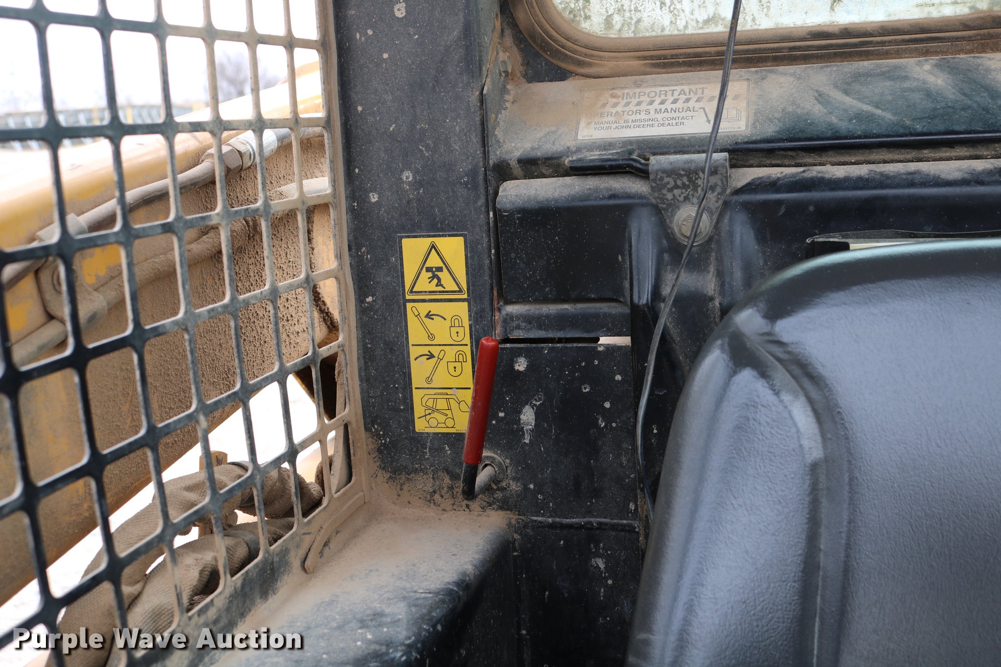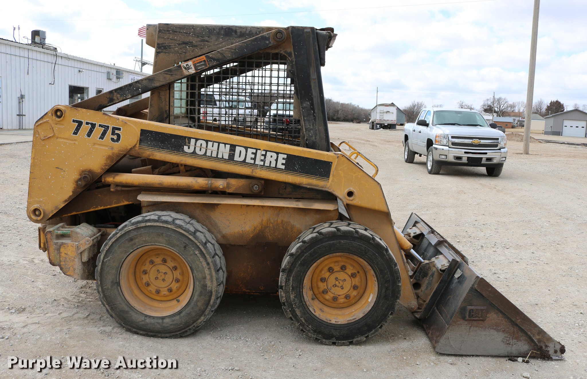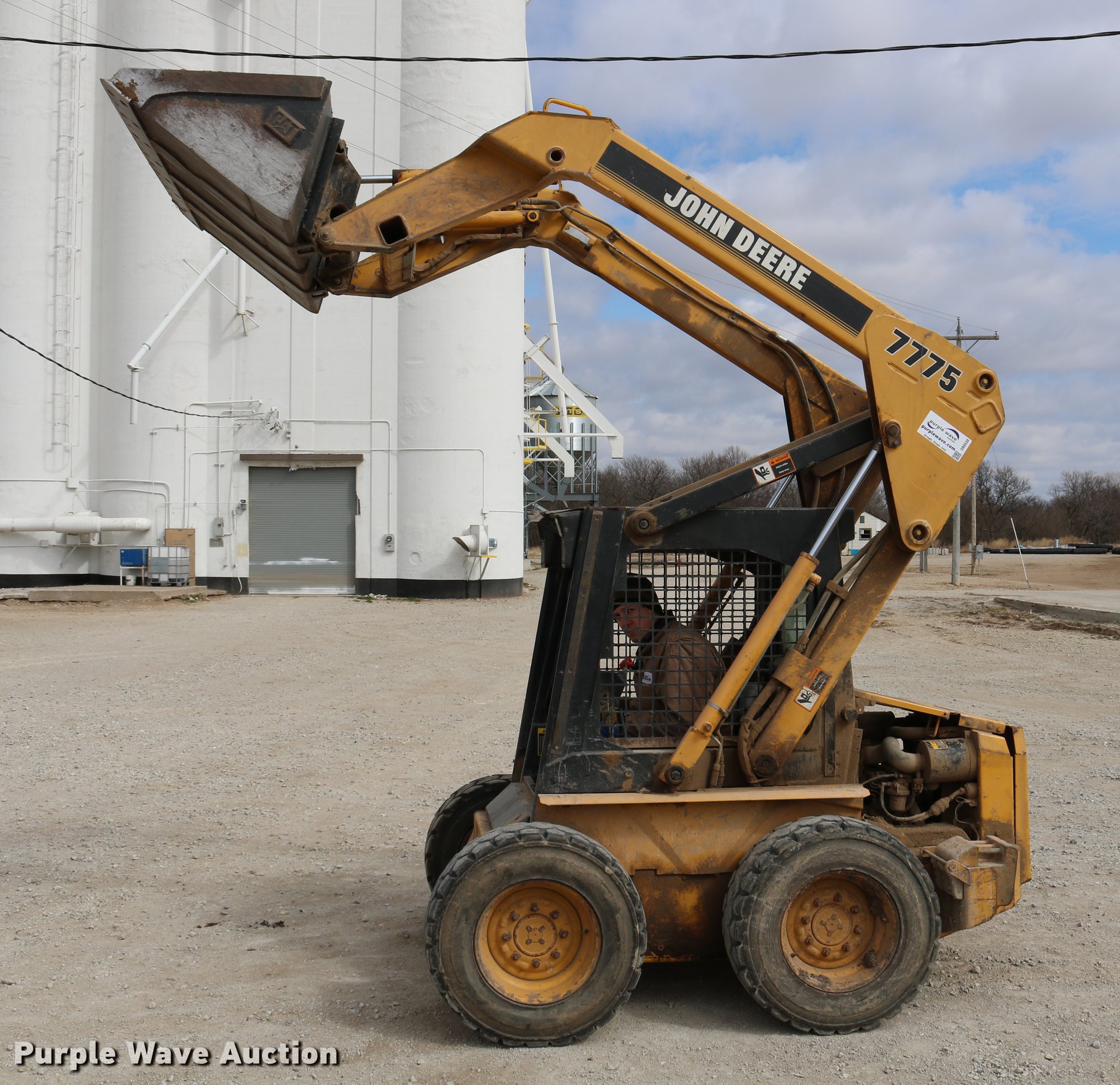 Purple Wave is selling a used Skid Steer Loader in Kansas. This item is a John Deere 7775 skid steer with the following: 485 hours on meter, John Deere four cylinder diesel engine, Hydrostatic transmission, Open station/canopy, Hand and foot controls, Front work lights, Caterpillar 72"W low profile bucket, Manual quick coupler, Auxiliary hydraulics, Counter weights, 10-16.5 tires, Work light broken, Serial MP7775X040182