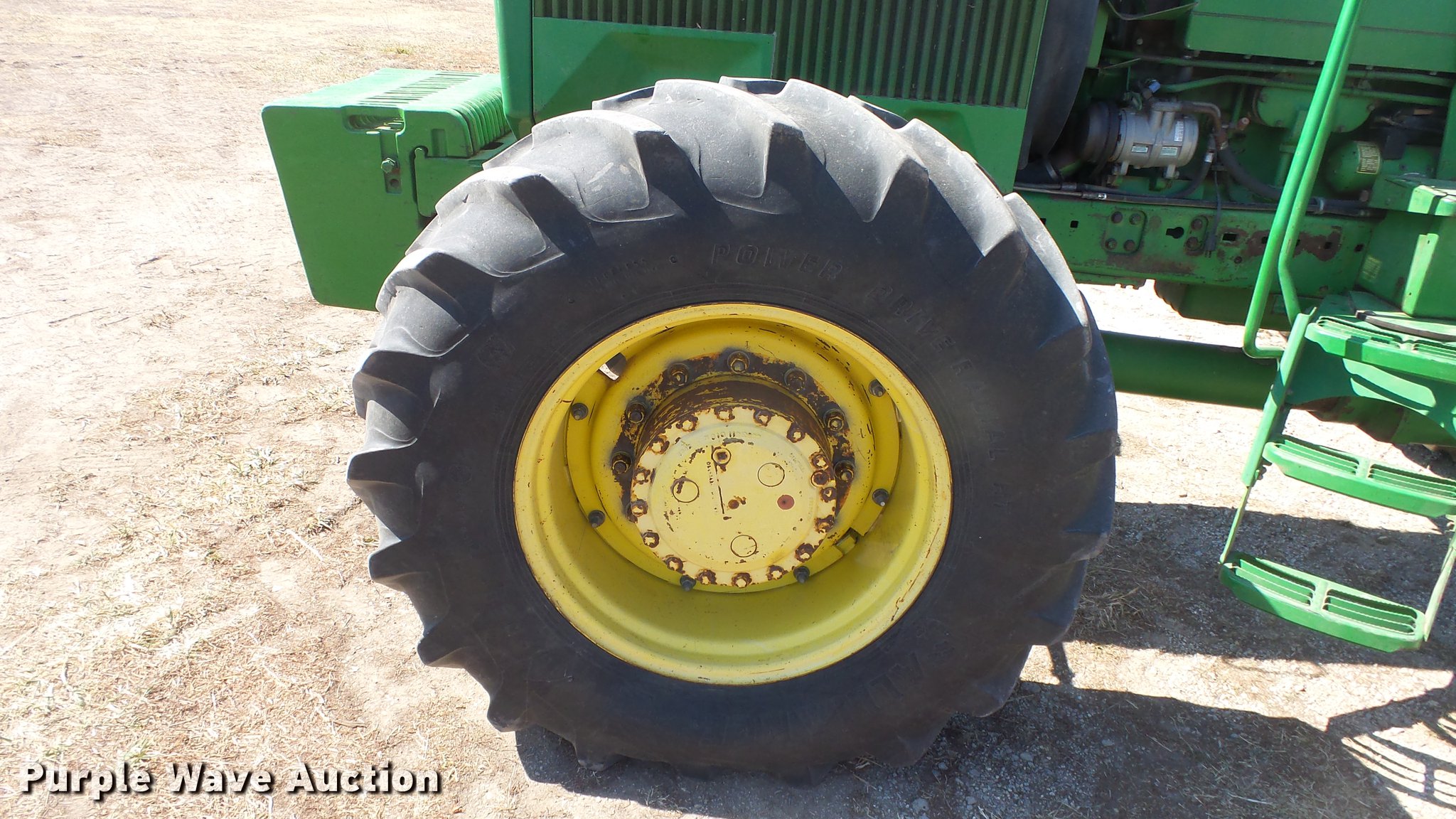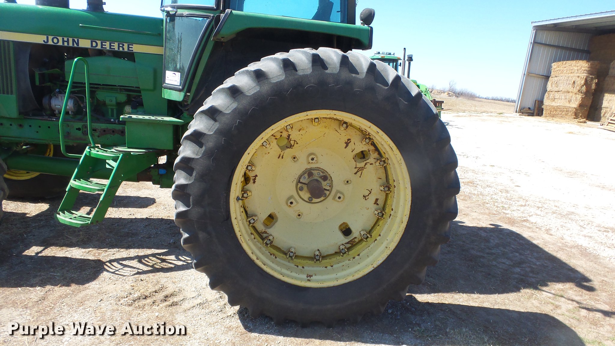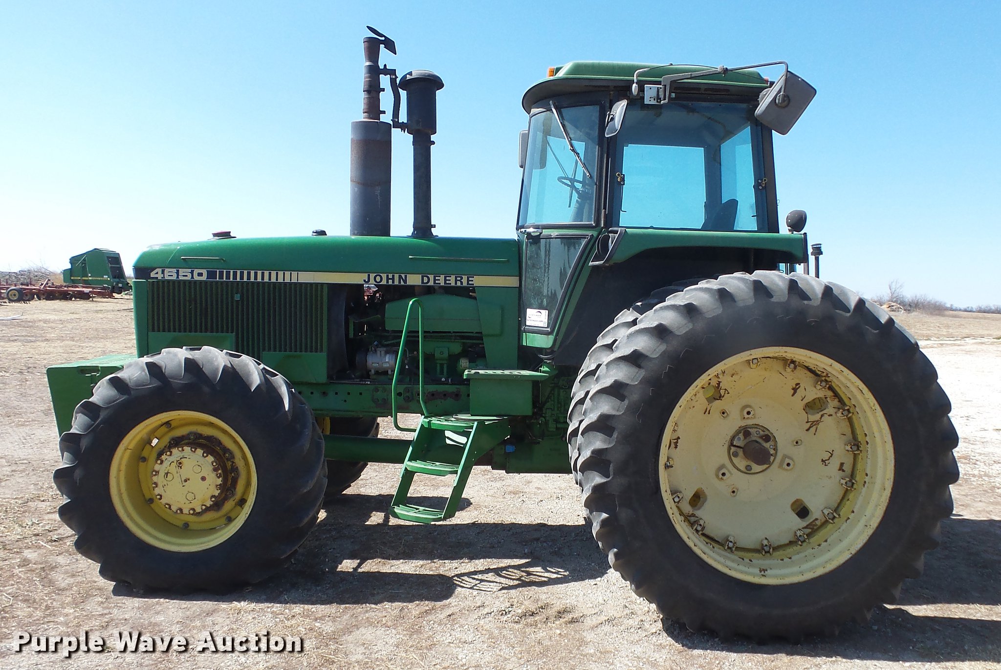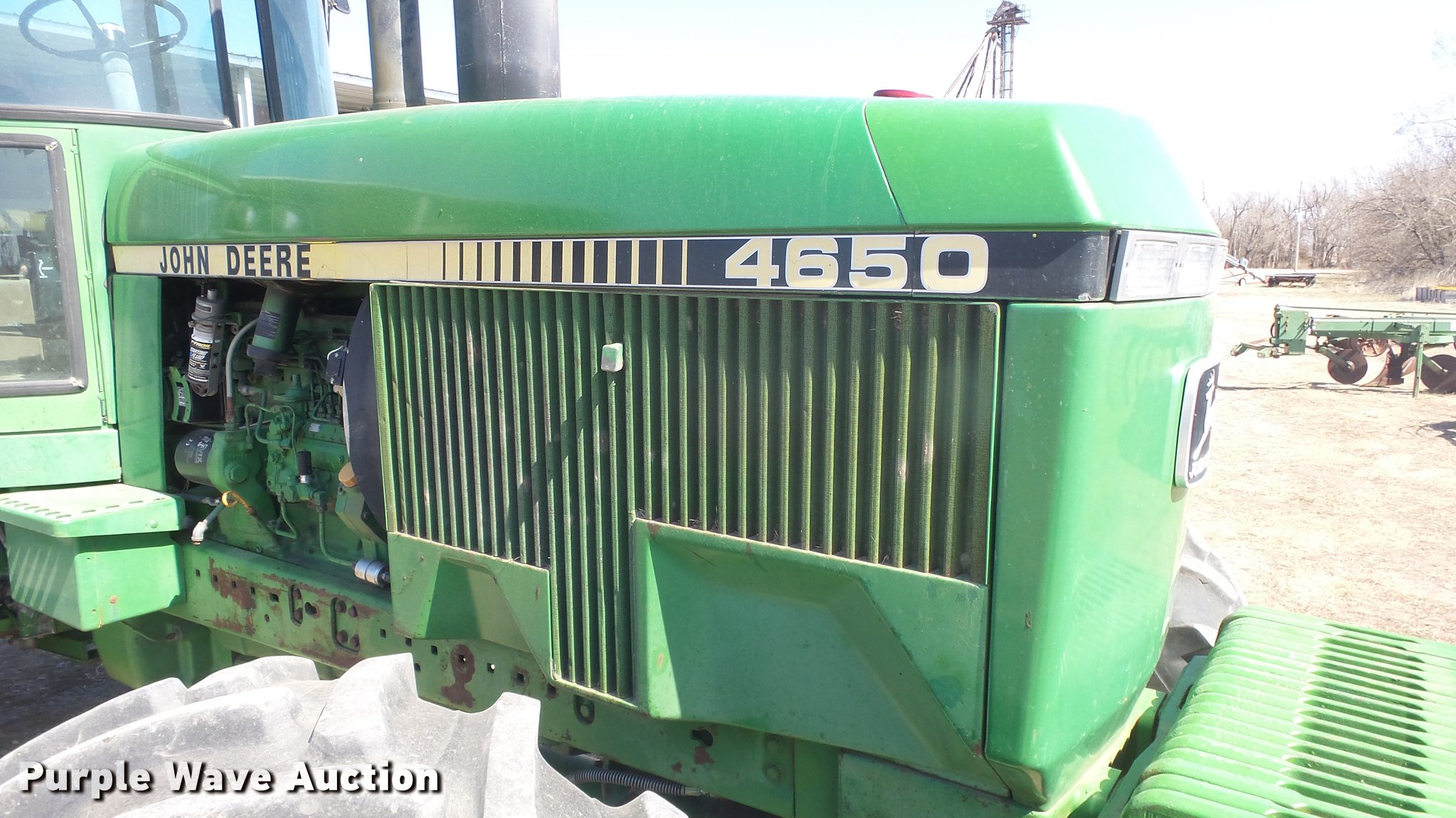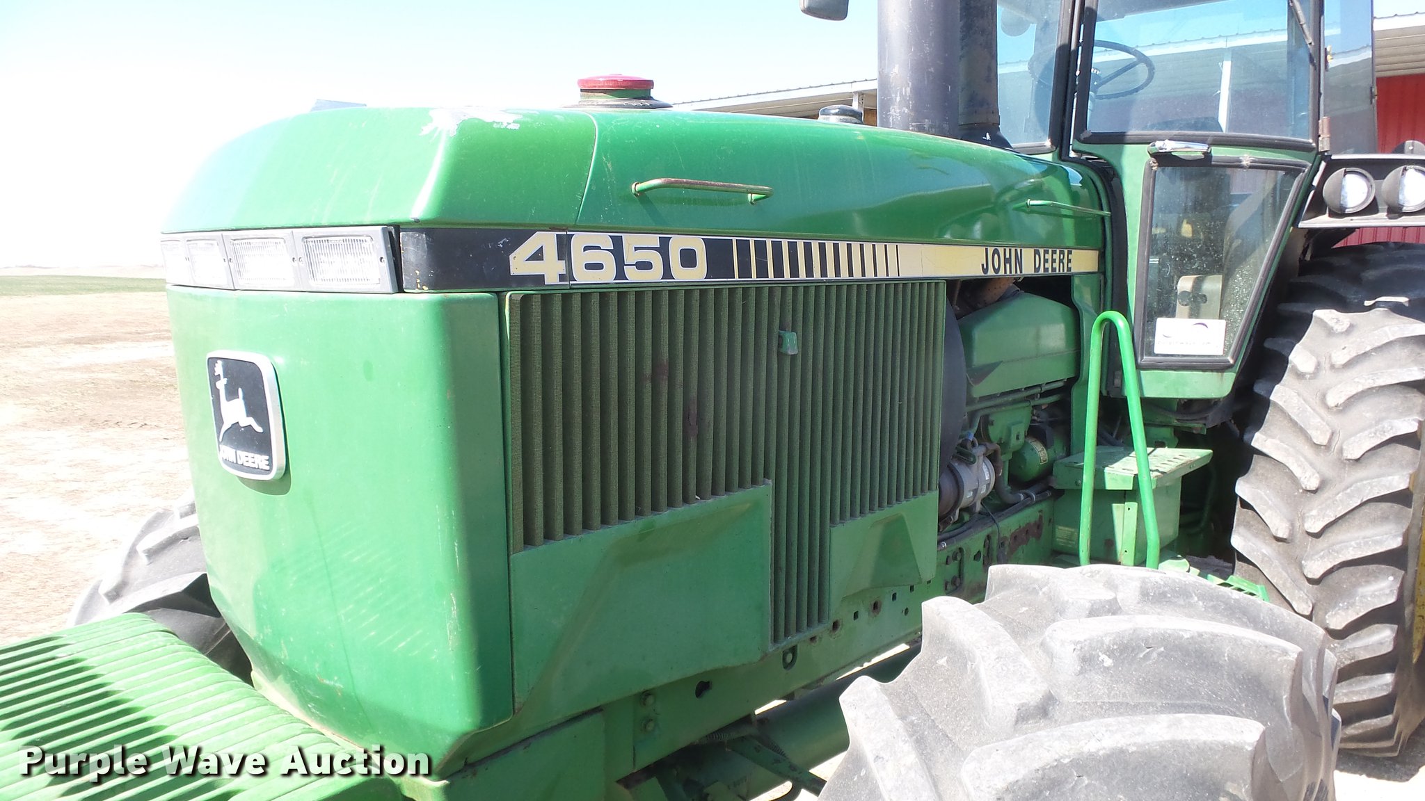 Purple Wave is selling a used Tractor in Kansas. This item is a 1983 John Deere 4650 MFWD tractor with the following: 7,435 hours on meter, John Deere 7.6L six cylinder diesel engine, John Deere Quad-Range partial powershift transmission, 16F-6R gears, AC and heat, AM/FM, Work lights, 1000 PTO, (4) rear hydraulic remote sets, Suitcase weights, 102 gallon fuel tank, 118" wheelbase, 16.9R28 front tires, 18.4R42 dual rear tires, Engine and clutch overhauled 10/2009, Serial RW4650P001037