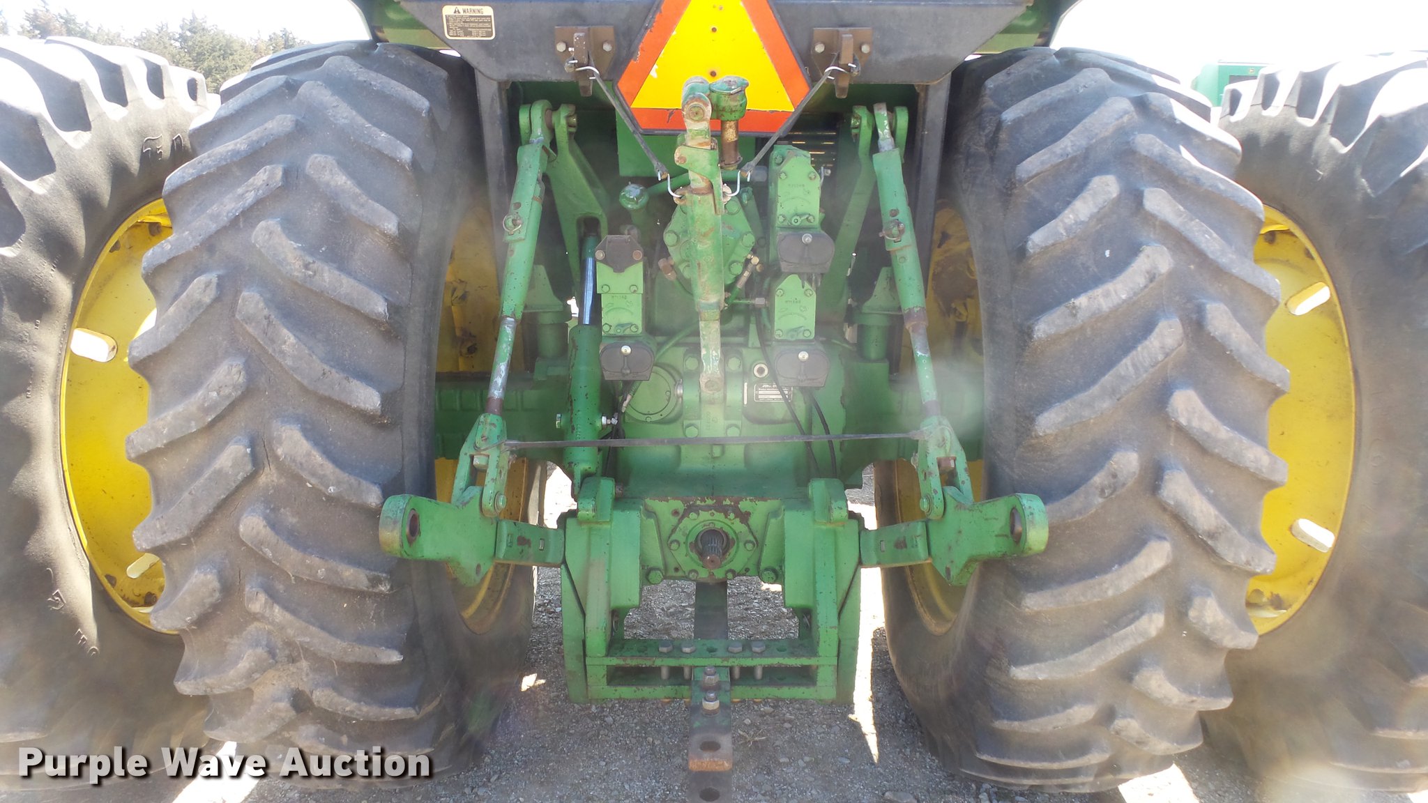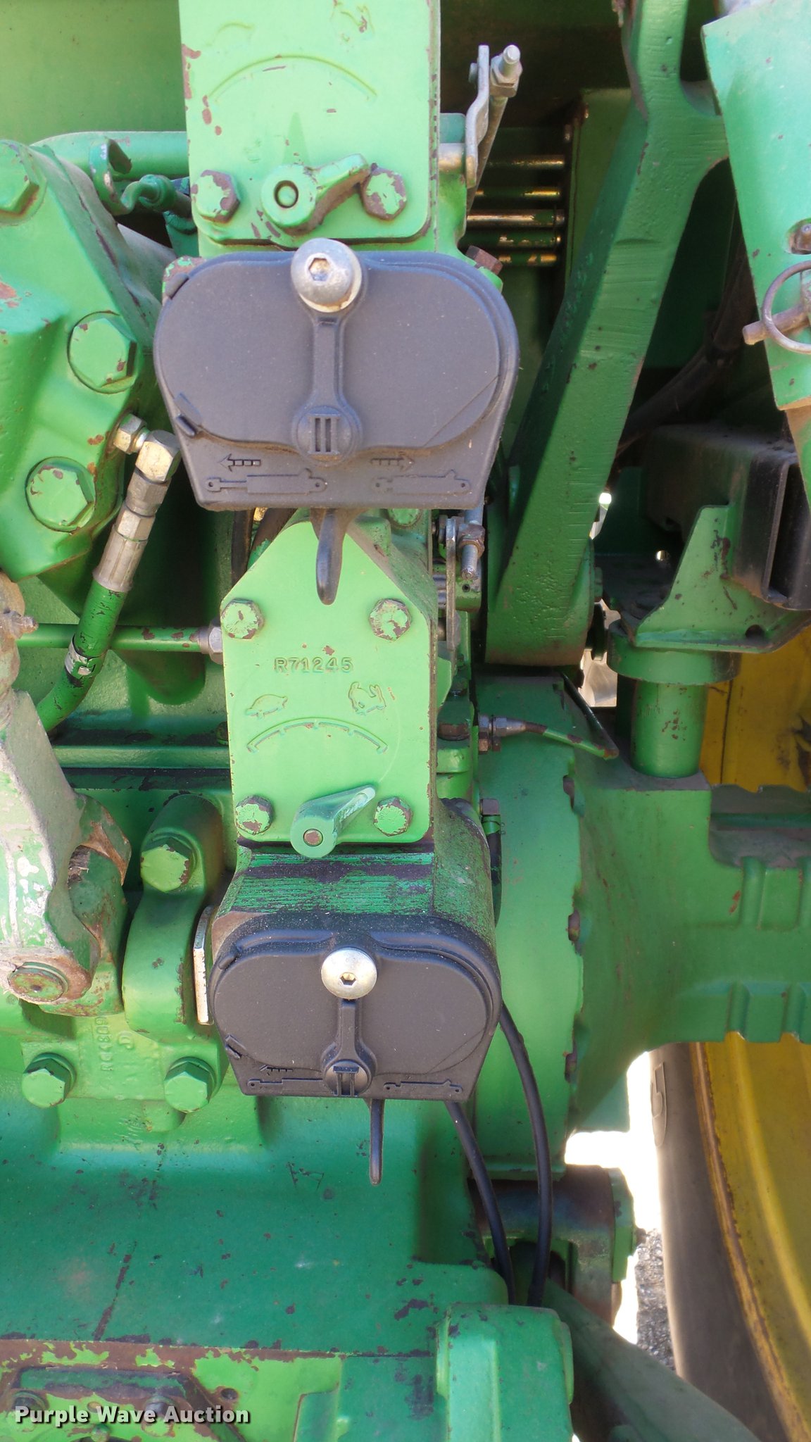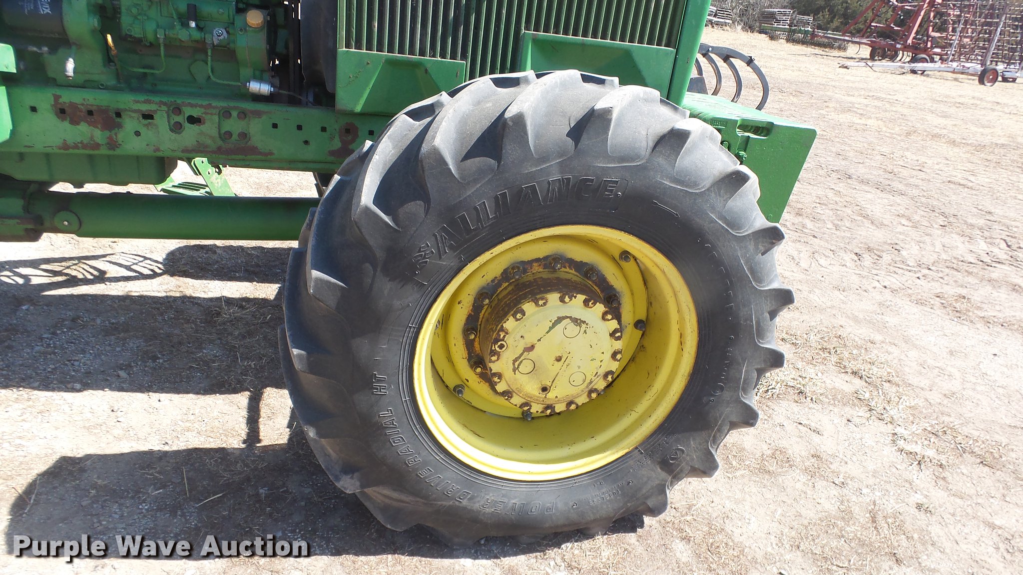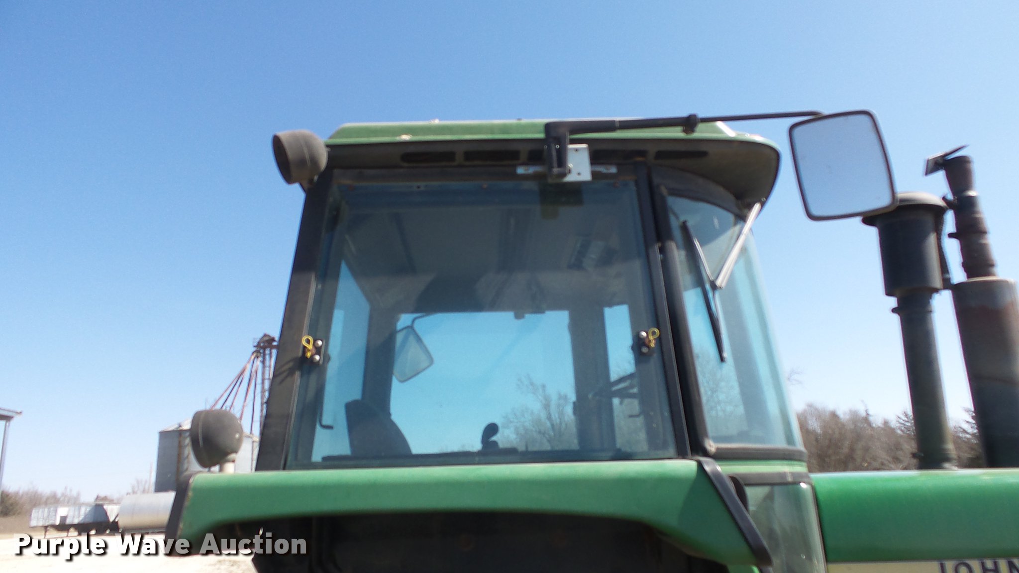 Purple Wave is selling a used Tractor in Kansas. This item is a 1983 John Deere 4650 MFWD tractor with the following: 7,435 hours on meter, John Deere 7.6L six cylinder diesel engine, John Deere Quad-Range partial powershift transmission, 16F-6R gears, AC and heat, AM/FM, Work lights, 1000 PTO, (4) rear hydraulic remote sets, Suitcase weights, 102 gallon fuel tank, 118" wheelbase, 16.9R28 front tires, 18.4R42 dual rear tires, Engine and clutch overhauled 10/2009, Serial RW4650P001037