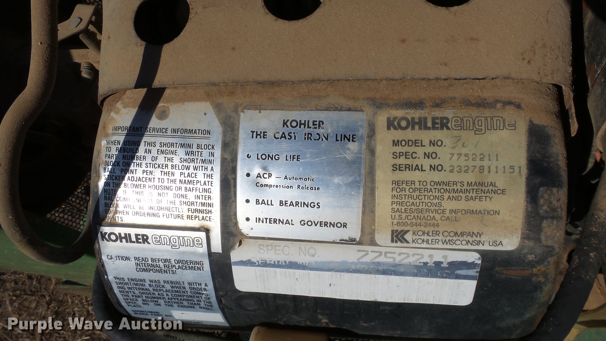 John Deere 112 lawn mower. 48" cut, Kohler 12 HP gas engine, Four speed transmission, Electric deck lift, 16x6.50-8 front tires, 12" rear tires, Tires leak, Non-operational unit, Serial 267032M. Halstead, KS 67056