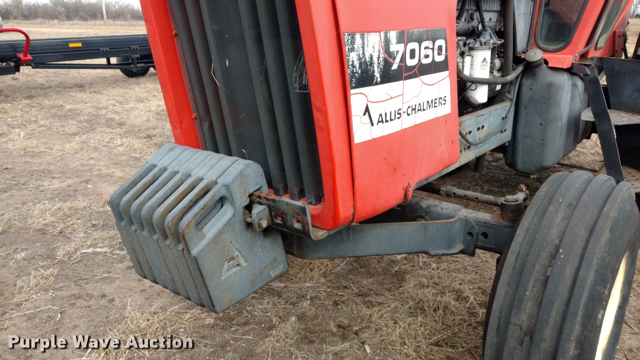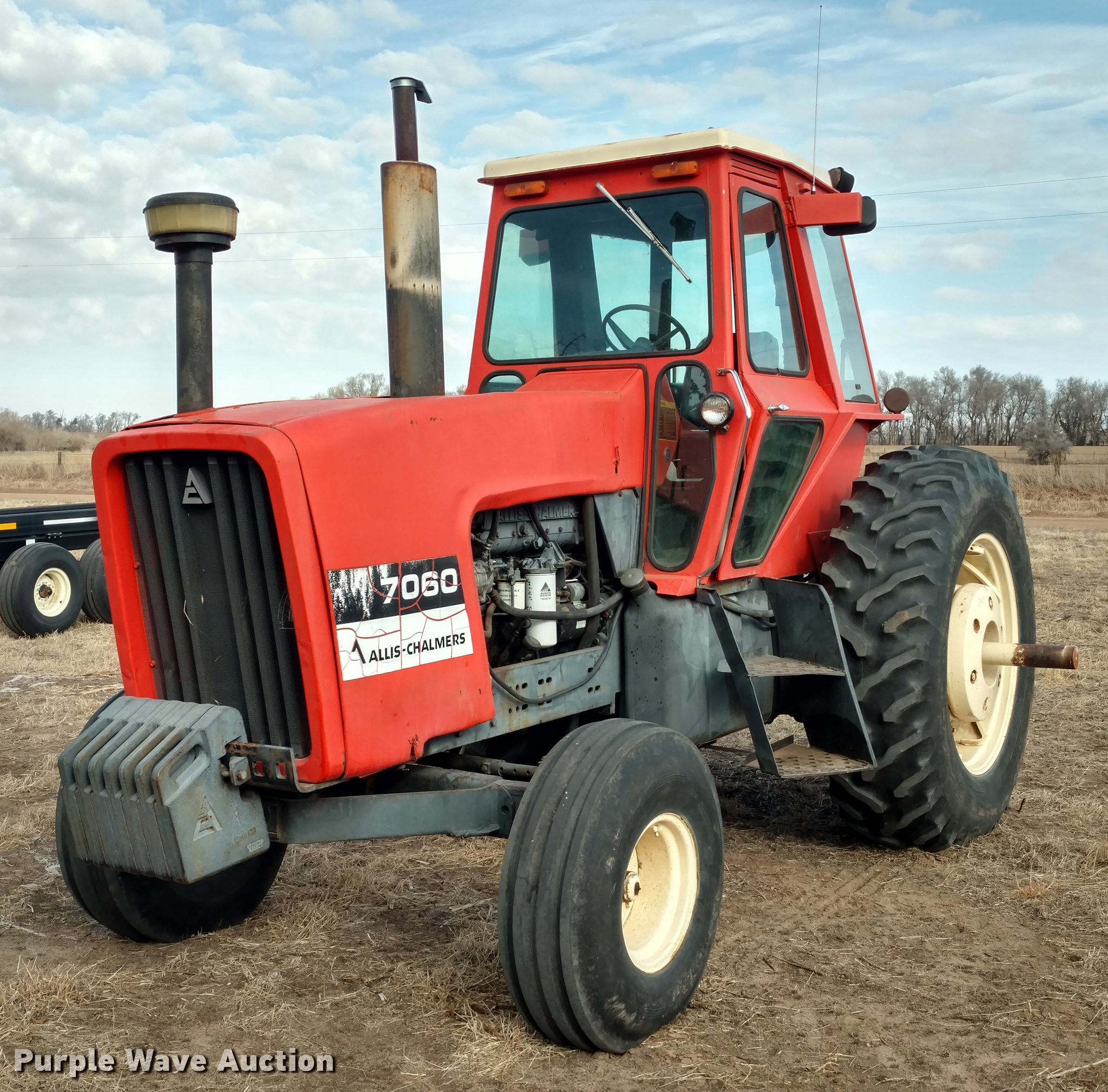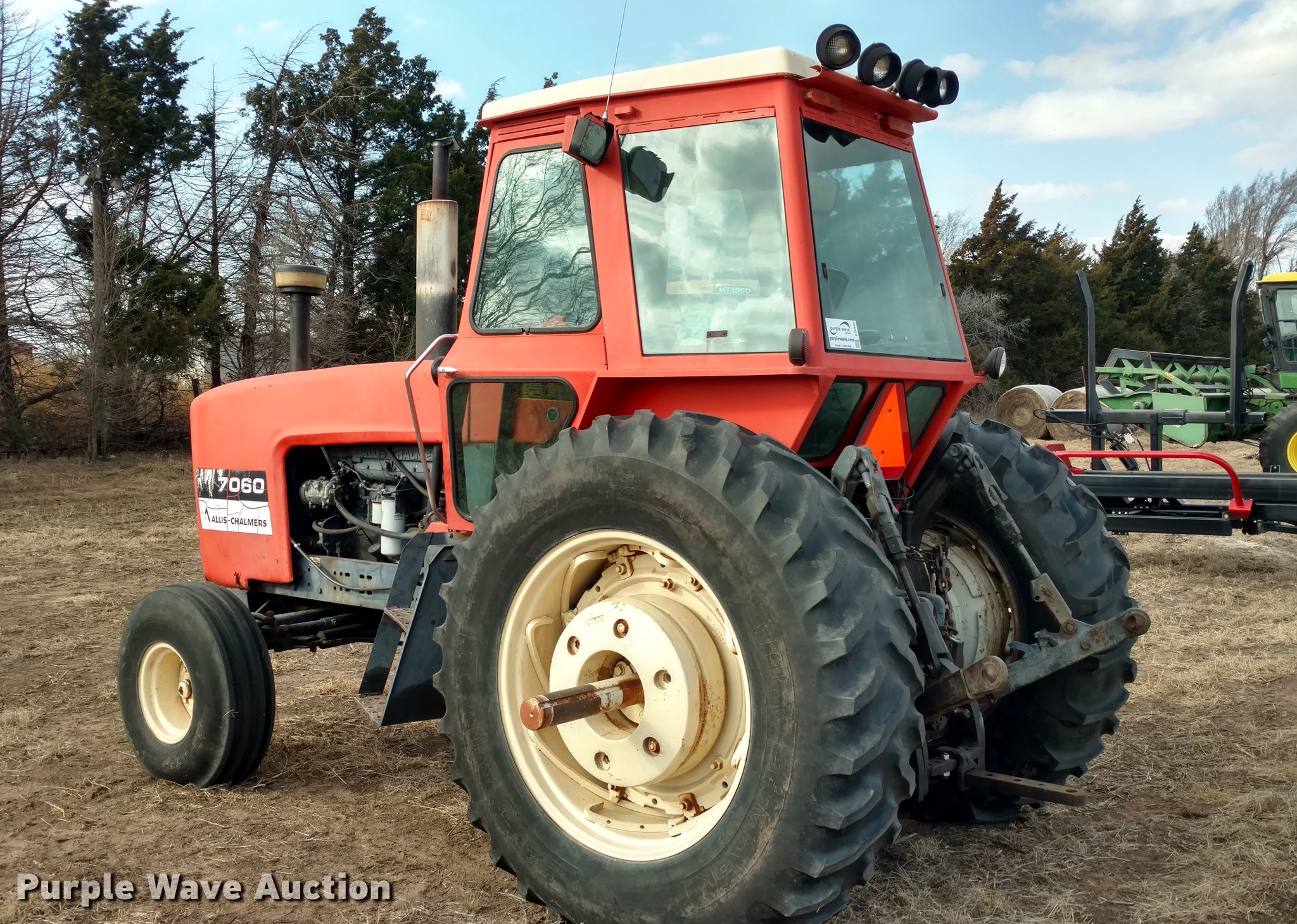 Purple Wave is selling a used Tractor in Kansas. This item is a Allis Chalmers 7060 tractor with the following: 4,786 hours on first meter, 448 hours on second meter, Allis Chalmers 7.0L six cylinder diesel engine, 5F-1R gears, Enclosed cab, Work lights, 540 PTO, (2) rear hydraulic remotes, Rear wheel weights, 11.00-16 front tires, 18.4-38 rear tires, Door handle inoperable