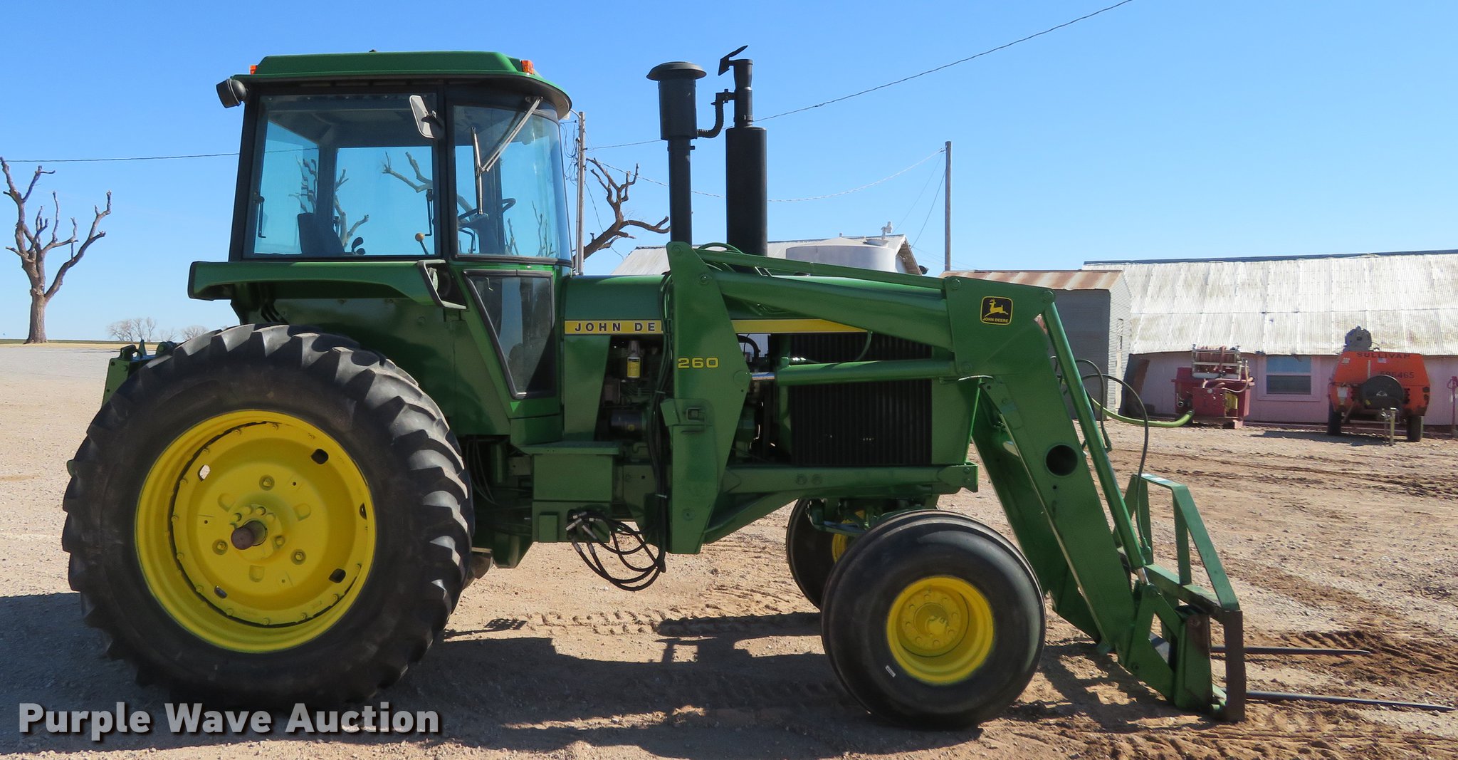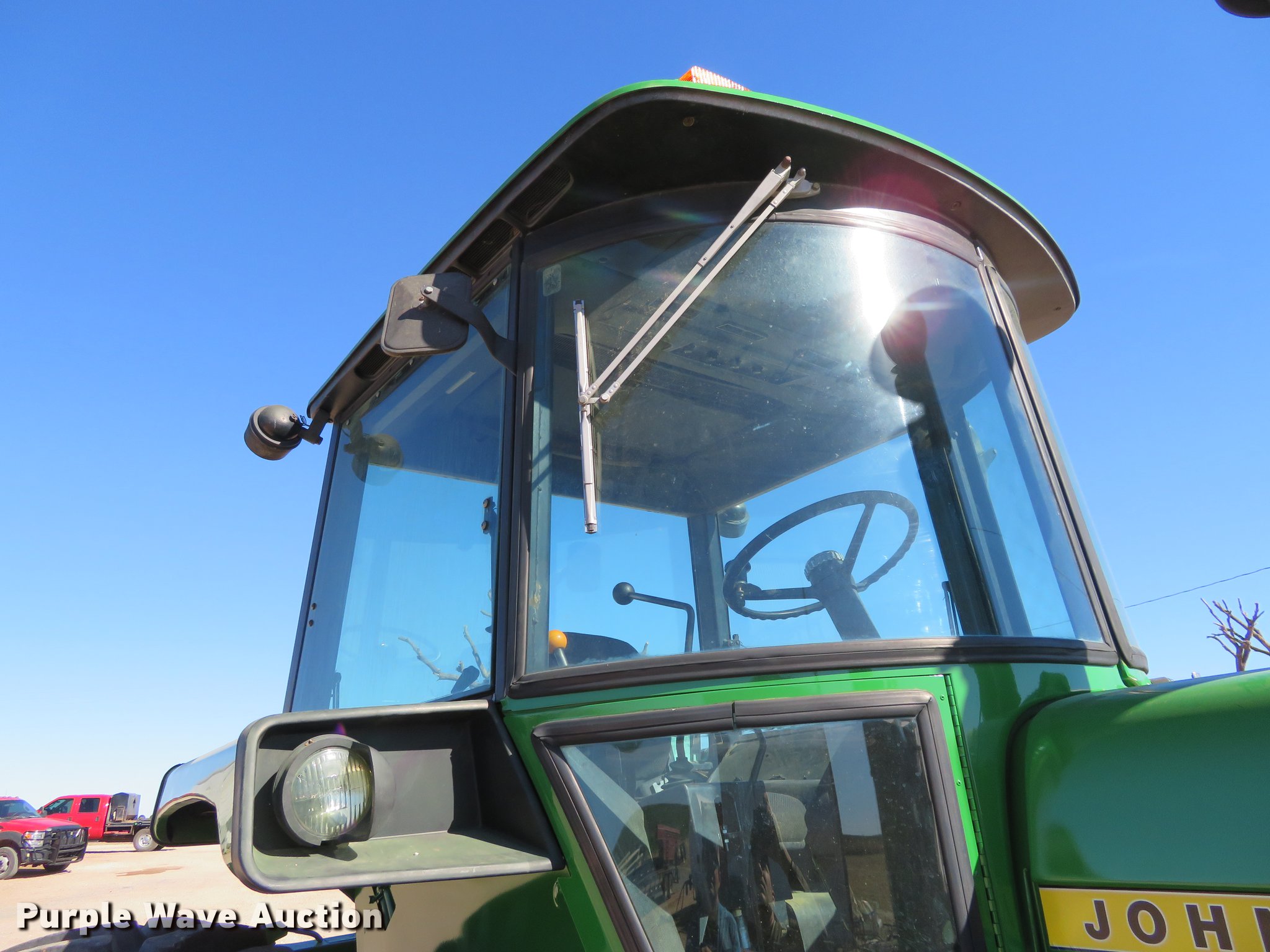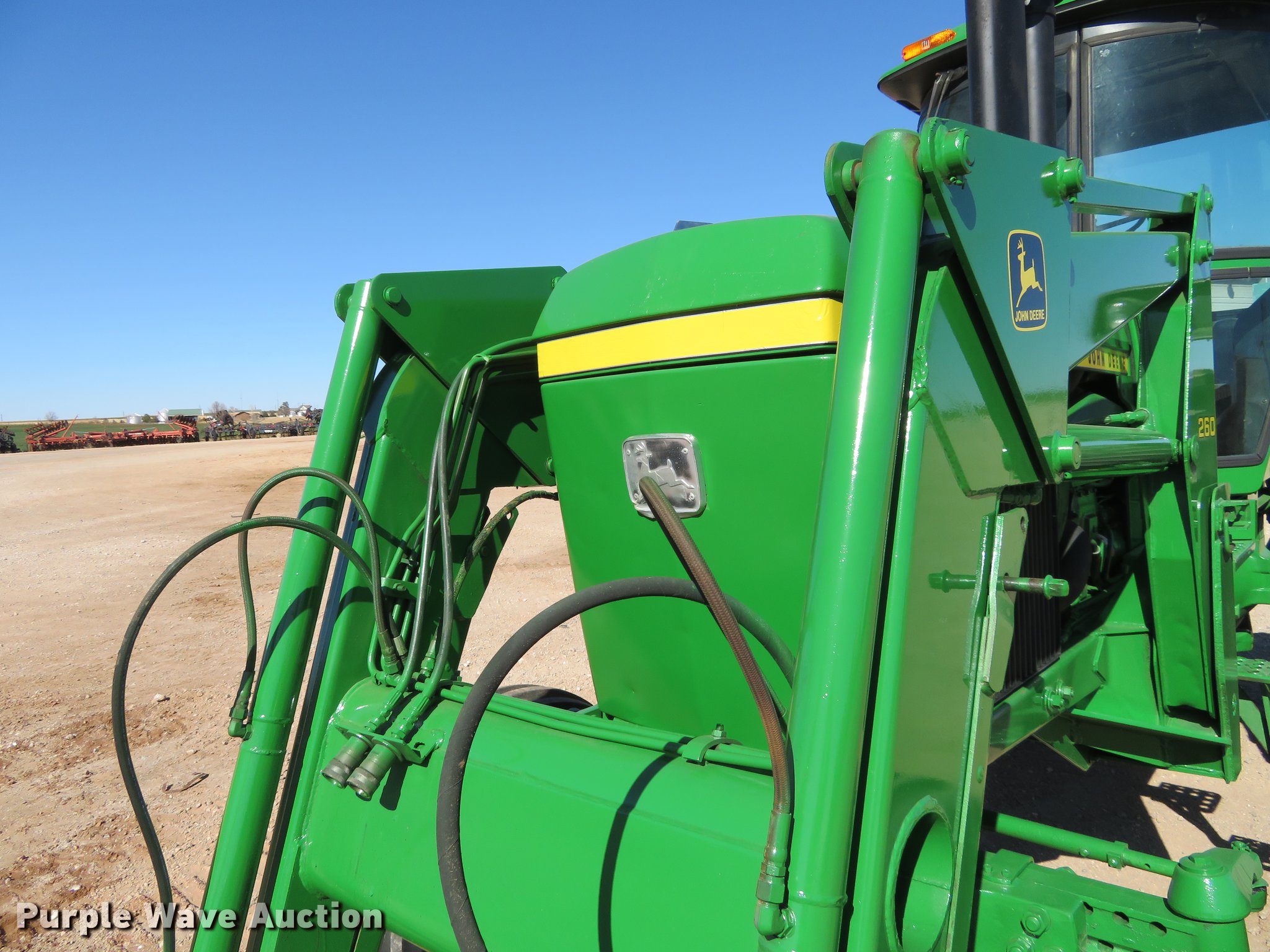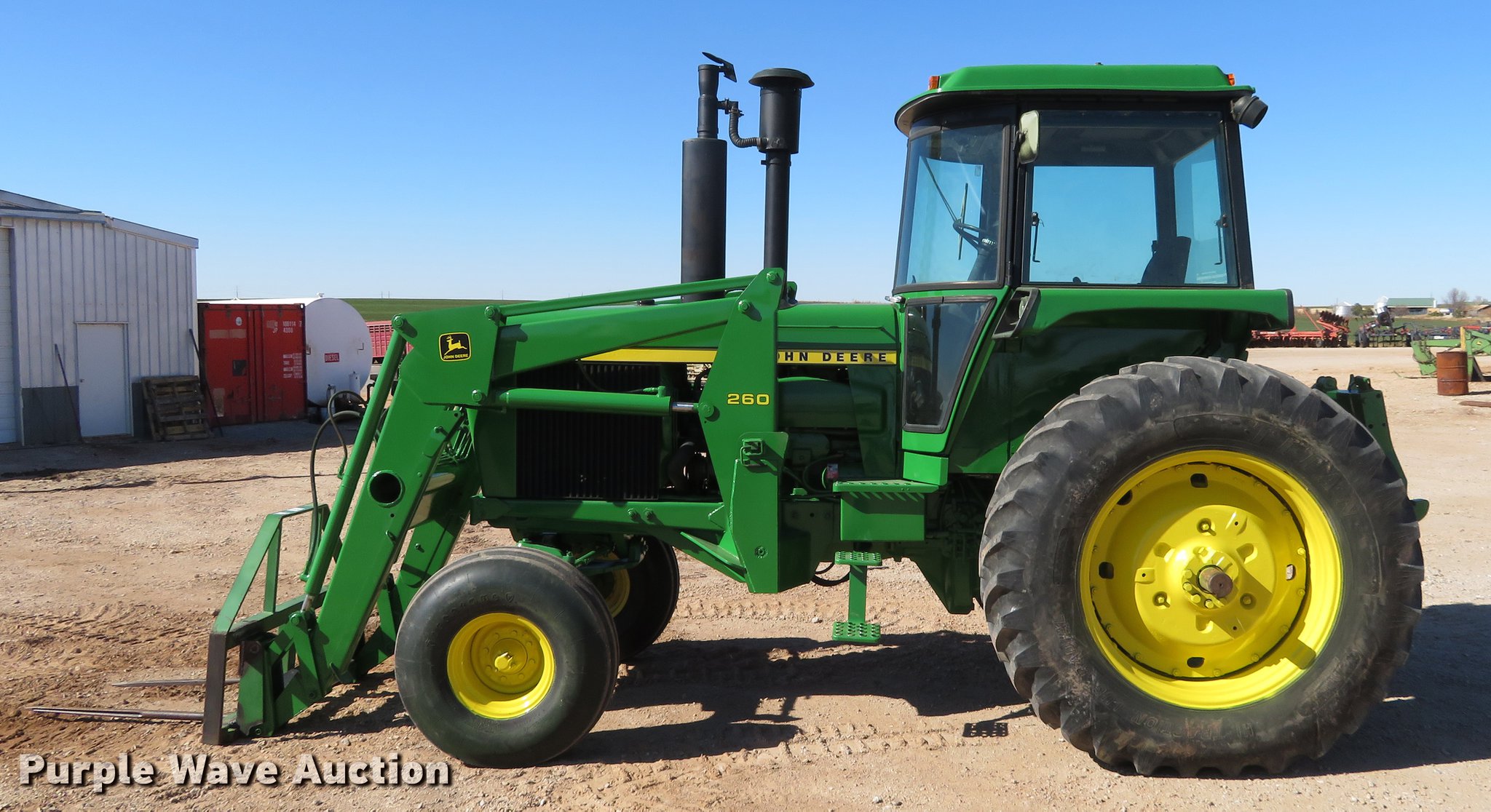 Purple Wave is selling a used Tractor in Oklahoma. This item is a 1976 John Deere 4630 tractor with the following: 7,774 hours on meter, Six cylinder diesel engine, Quad-Range transmission, 16F-6R gears, AC and heat, Tilt steering wheel, Suspension seat, John Deere 260 loader, Bucket, Bale forks, Quick attach, Self-leveling, Joystick loader controls, Three point, Quick attach, 1000 PTO, Draw bar, Front hydraulic remote, (3) rear hydraulic remotes, Rear wheel weights, 11.00R16 front tires, 18.4R38 rear tires, Serial 4630H019761R