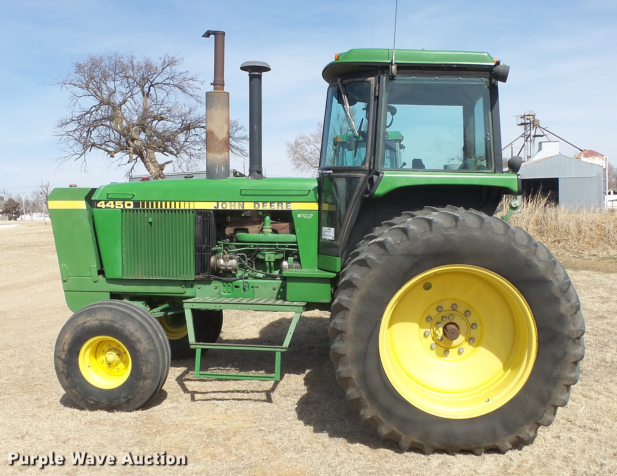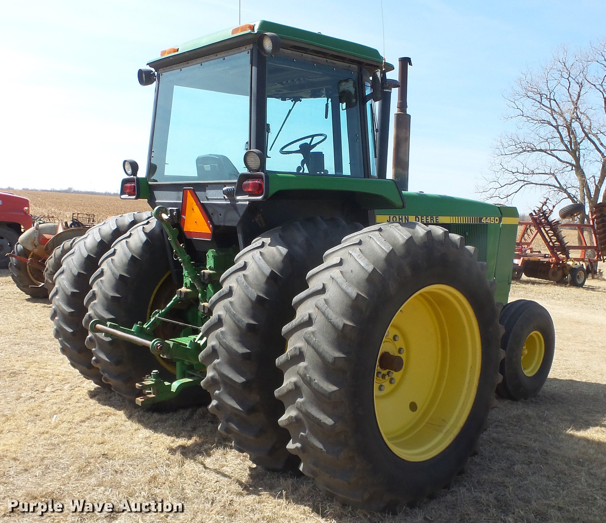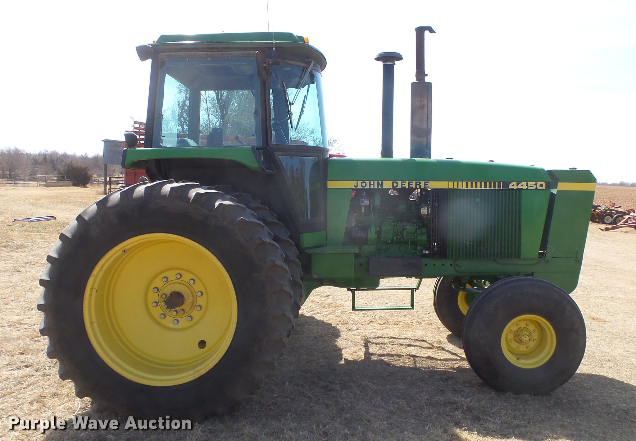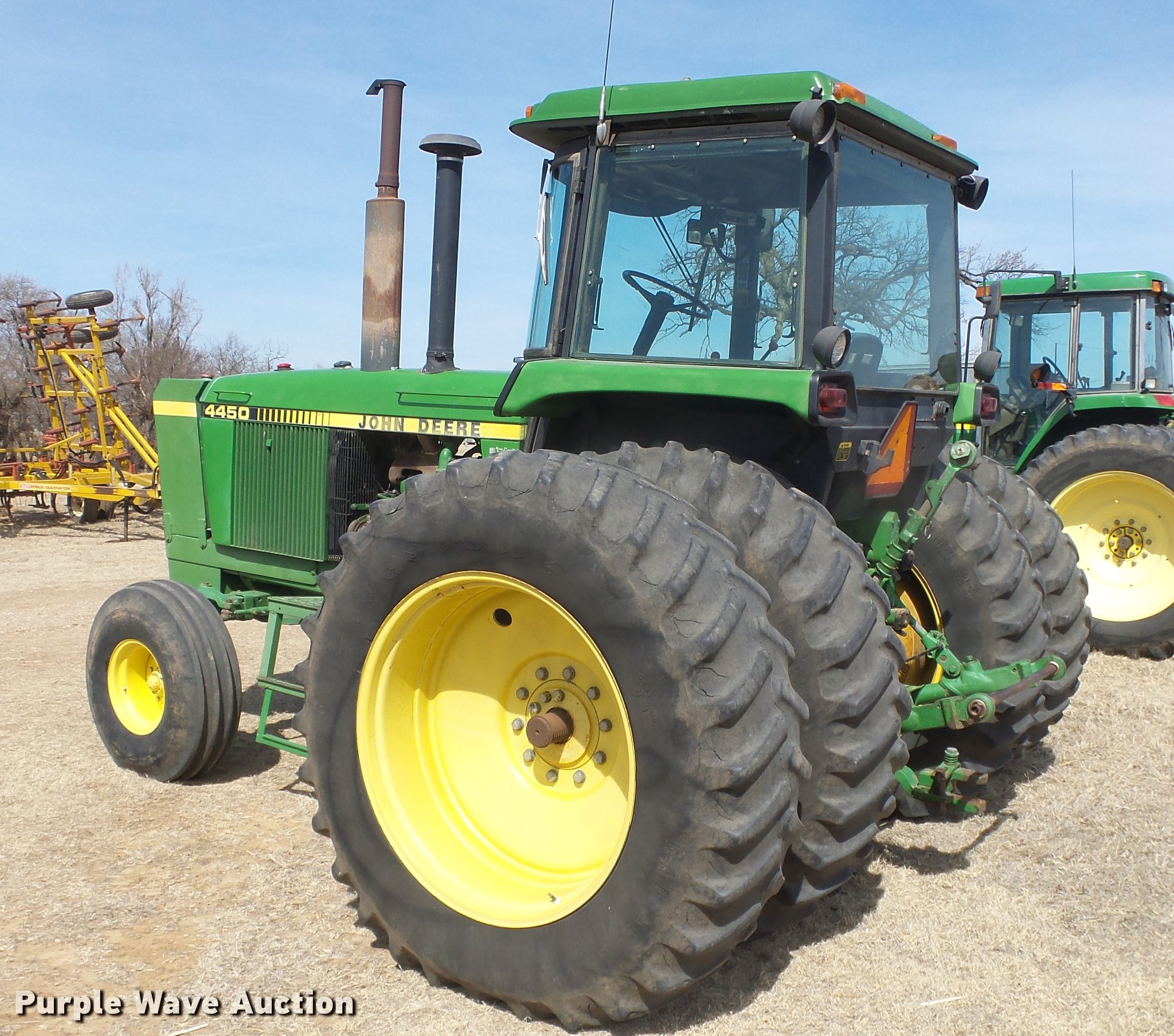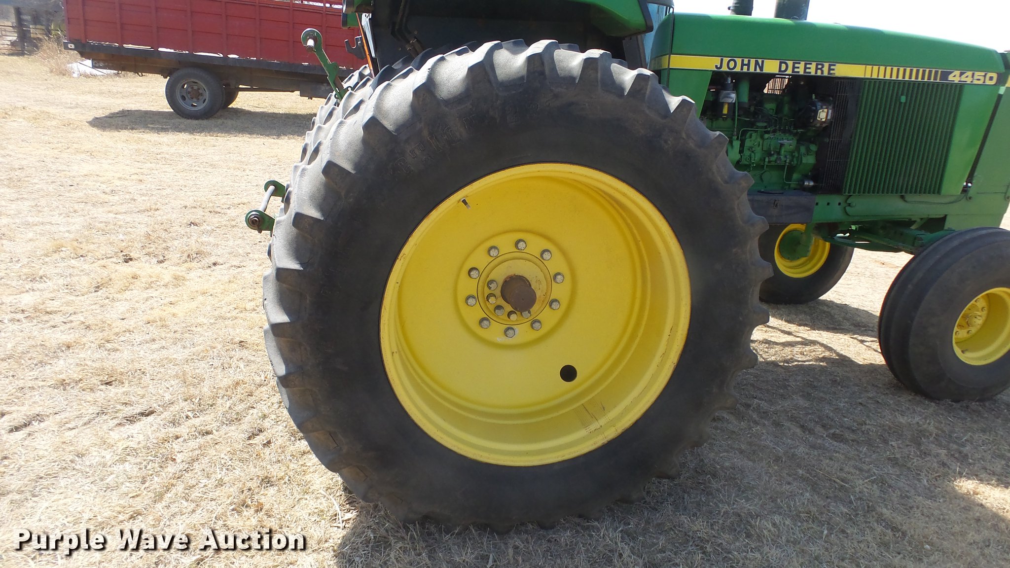 Purple Wave is selling a used Tractor in Kansas. This item is a 1988 John Deere 4450 tractor with the following: 6,600 hours on meter, John Deere 6466TR-16 six cylinder turbo diesel engine, Serial RG6466T339285, Partial powershift transmission, 16F-6R gears, AC and heat, Tilt steering wheel, AM/FM, Suspension seat, Block heater, CB radio, Three point, Top link, Seven pin outlet, 1000 PTO, (3) rear hydraulic remote sets, Inner rear wheel weight, 11.00-16SL front tires, 18.4R38 dual rear tires, Serial RW4450H028403
