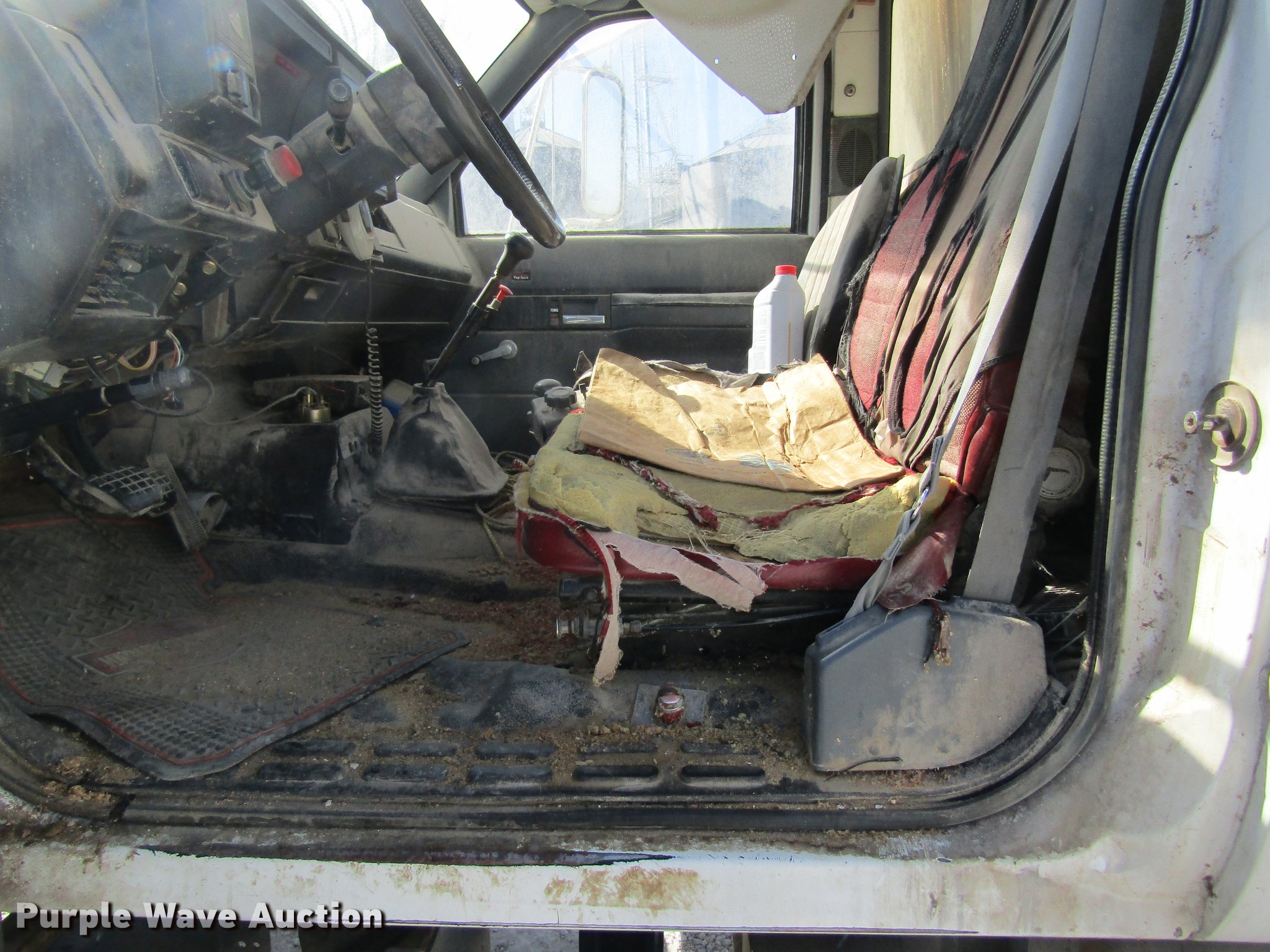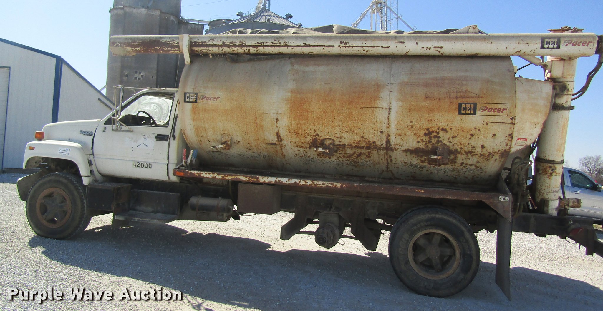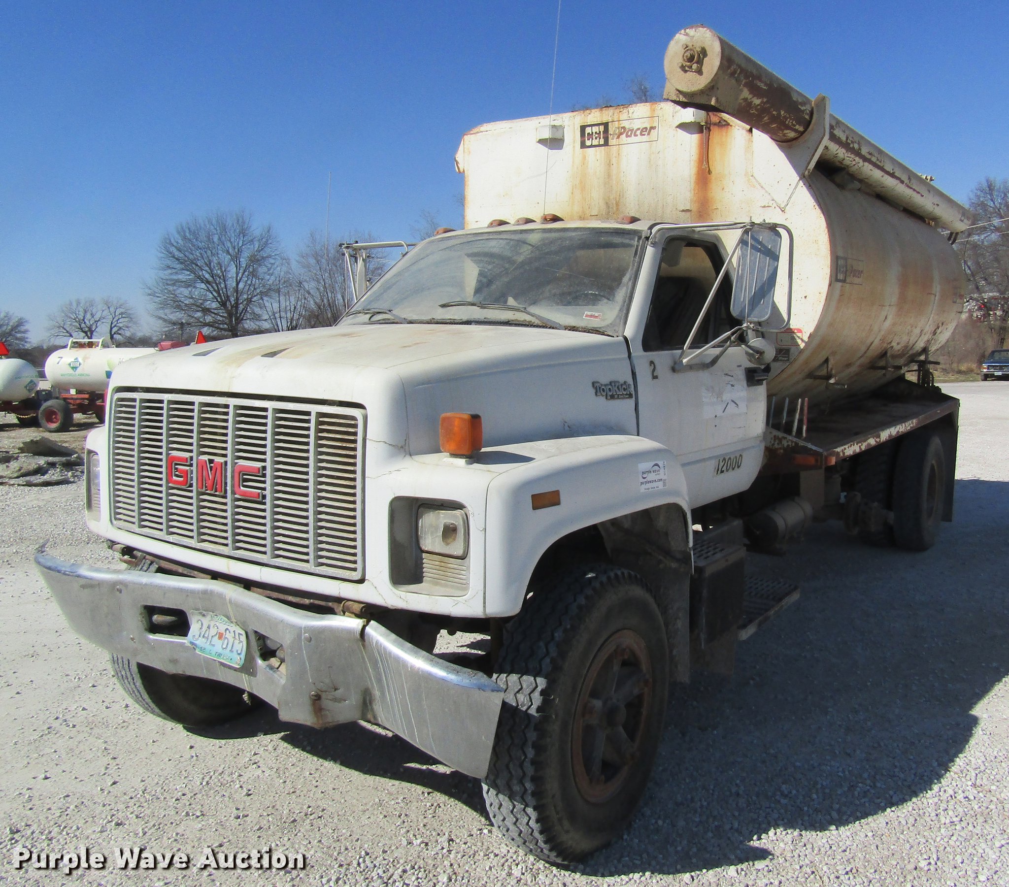 Purple Wave is selling a used Fertilizer or Feed Delivery Truck in Missouri. This item is a 1992 GMC TopKick tender truck with the following: 340,450 miles on odometer, Caterpillar 3116 6.6L L6 turbo diesel engine, Five speed manual transmission, Tandem axle, Heat, Suspension seat, Pacer tender bed, Discharge auger, Hydraulic swing, Hydraulic tilt, Roll tarp, Spring suspension, 10.00R20 tires, GVWR 30,000 lbs, Tarp damage, Some tires missing