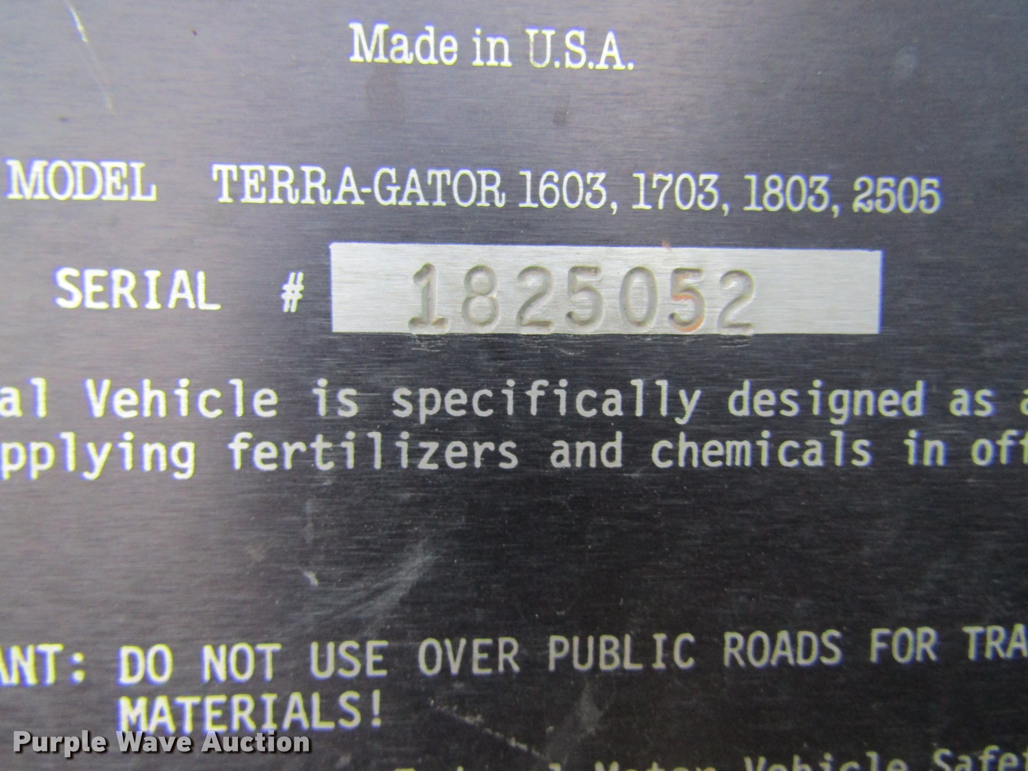 Purple Wave is selling a used Applicator Self Propelled in Missouri. This item is a 1992 Ag-Chem TerraGator 1803 applicator chassis with the following: 75,952 miles on odometer, 7,513 hours on meter, Six cylinder turbo diesel engine, Eaton Fuller eight speed manual transmission, AM/FM, Air suspension seat, Work lights, 66x43-25 flotation tires, Serial 1825052
