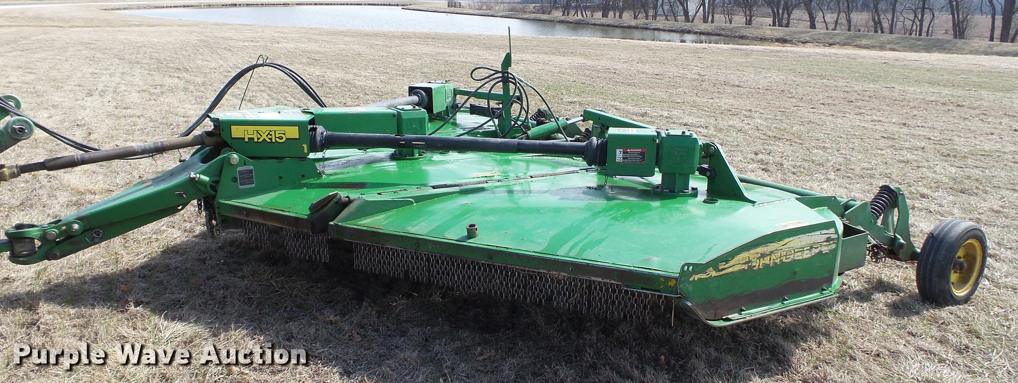 Purple Wave is selling a used Mower, Cutter, Shredder in Missouri. This item is a 2011 John Deere HX15 batwing rotary mower with the following: 15'W, Hydraulic lift and fold, 1000 PTO, Pin hitch, Jack stand, 21x7-12 tires, Serial P0HX15FEBT029764