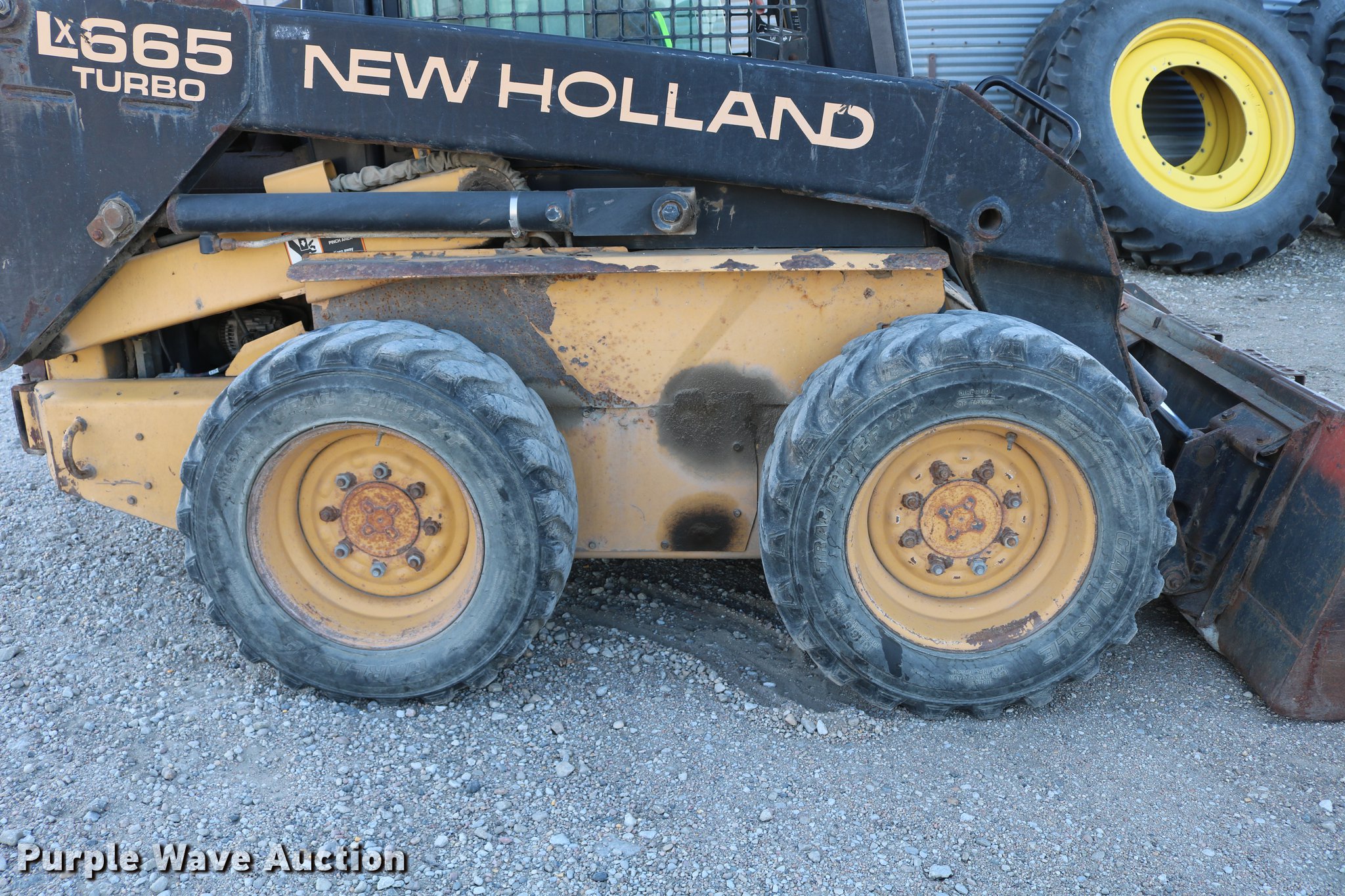 Purple Wave is selling a used Skid Steer Loader in Kansas. This item is a 1997 New Holland LX665 Turbo skid steer with the following: 327 hours on meter, Hour meter replaced, Unknown hours on unit, Four cylinder turbo diesel engine, Hydrostatic transmission, Enclosed cab, Heat, Hand and foot controls, Front work lights, 67"W low profile bucket, Manual quick coupler, Auxiliary hydraulics, Carlisle 10-16.5 tires, Serial 902595