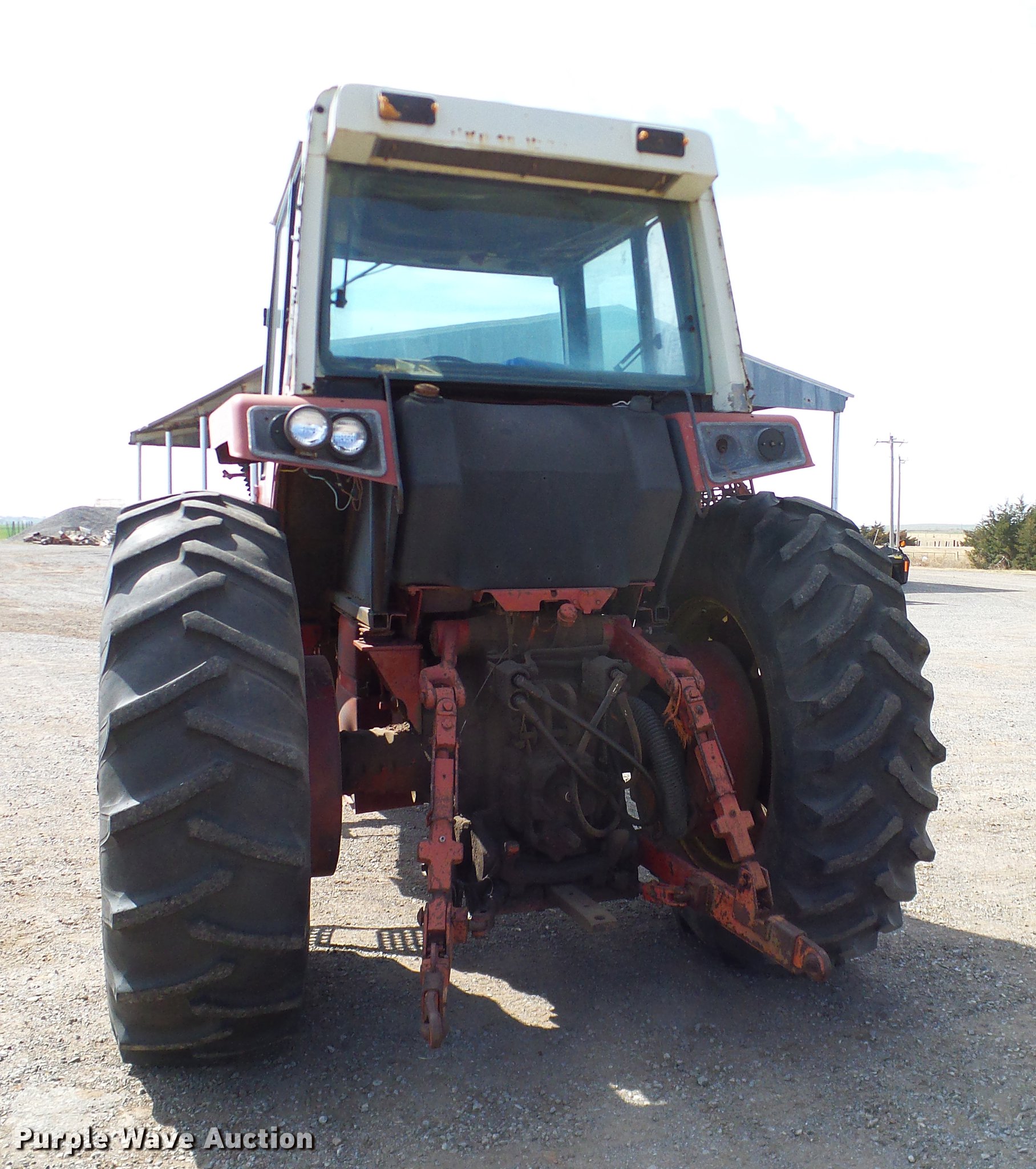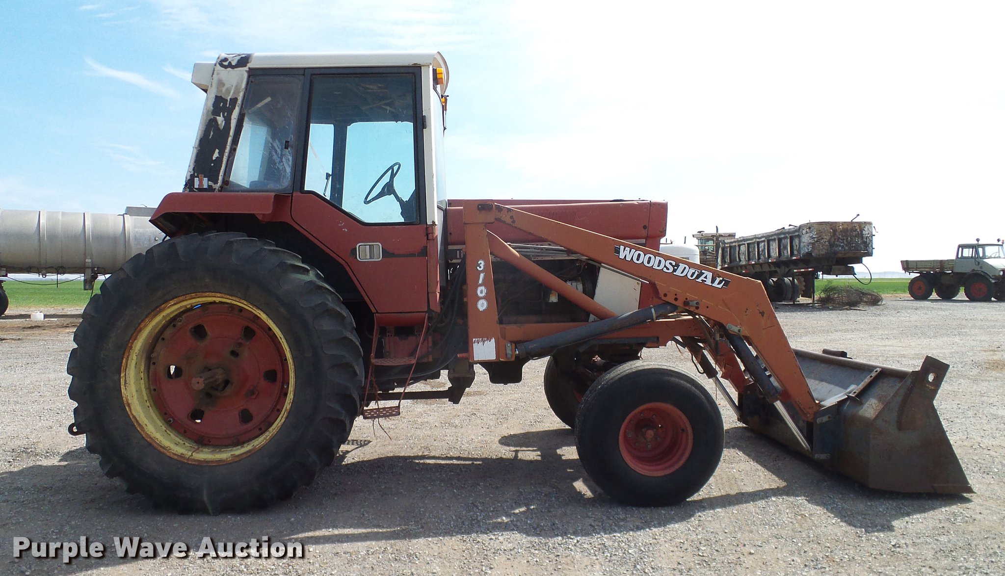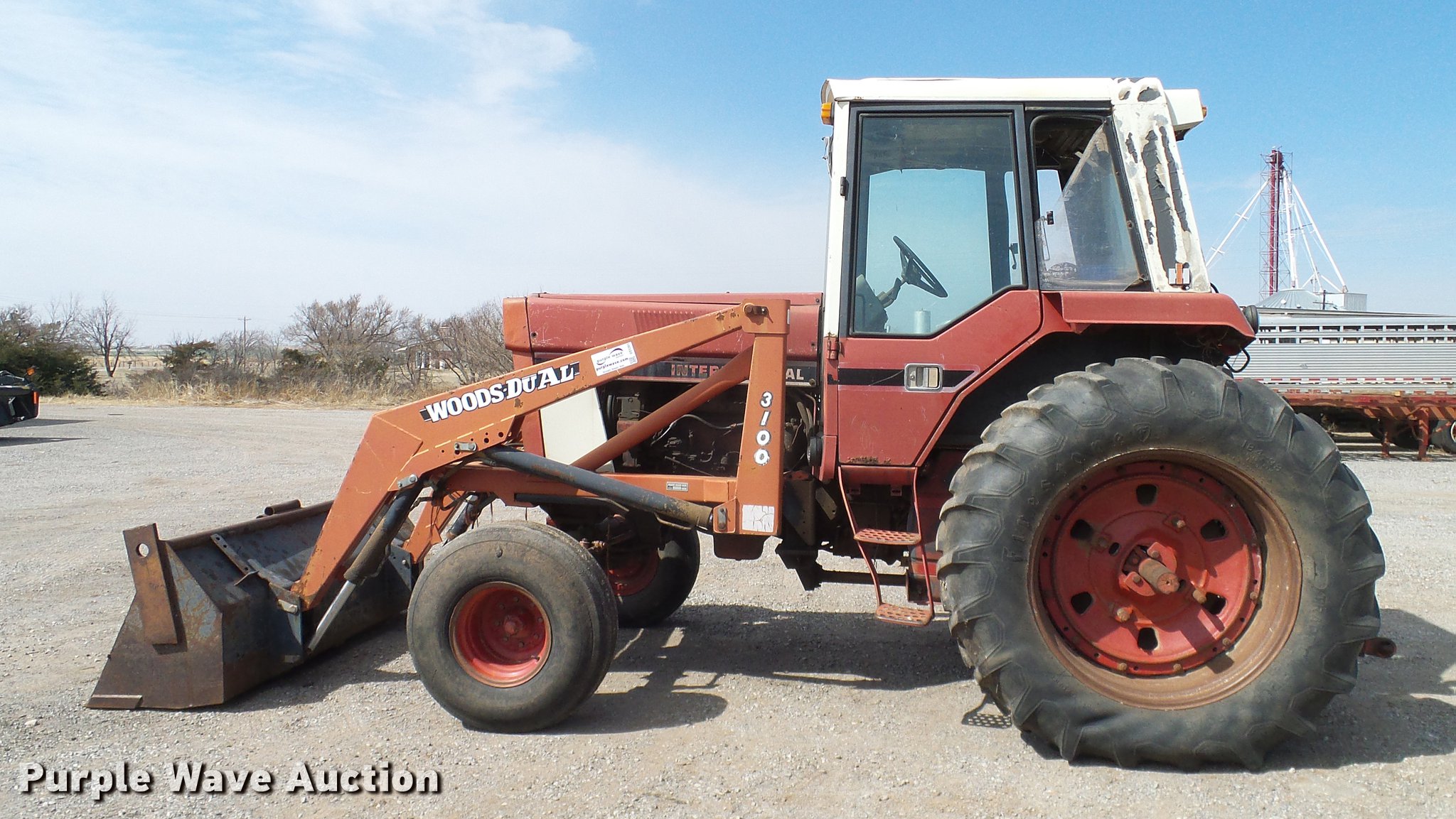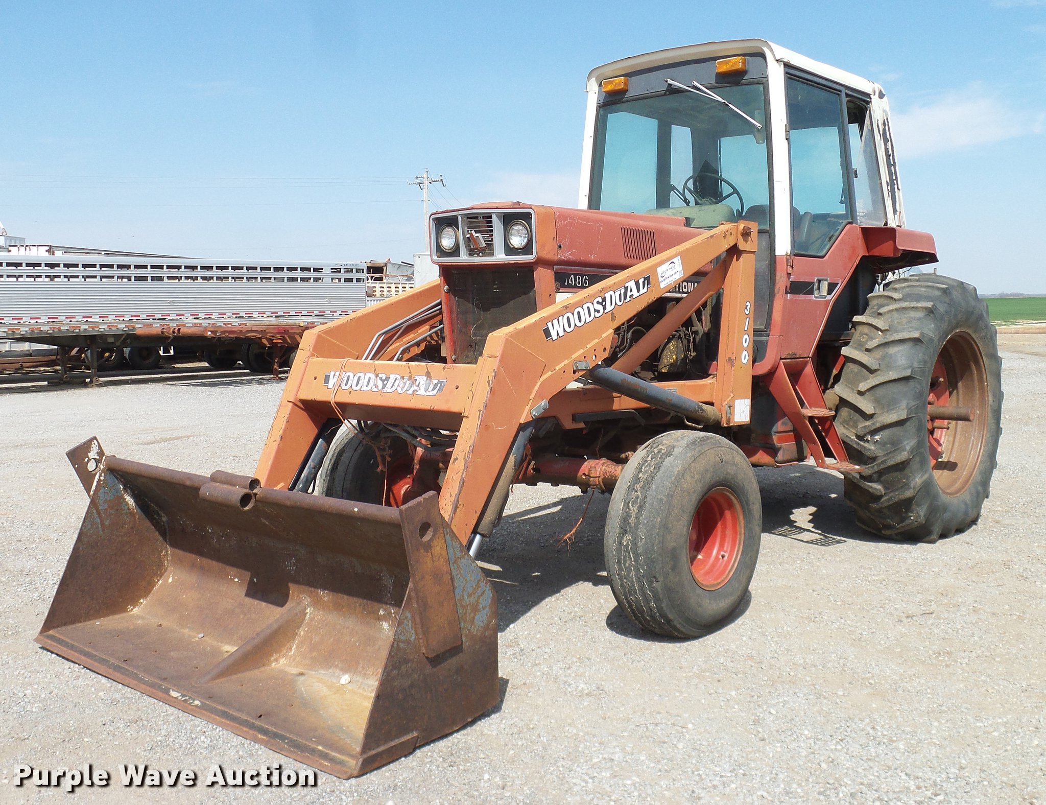 Purple Wave is selling a used Tractor in Oklahoma. This item is a 1981 International 1486 tractor with the following: 6,117 hours on meter, International six cylinder turbo diesel engine, Torque amplifier transmission, 16F-8R gears, AC, AM/FM, Suspension seat, Woods 3100 loader, 84"W bucket, Two-lever controls, Three point, 540/1000 PTO, (4) rear hydraulic remotes, (2) rear wheel weights, 39x15 front tires, 18.4-38 rear tires, Fuel lines will be replaced prior to auction, Unknown operating condition of AC, Cab glass missing, Serial 76940
