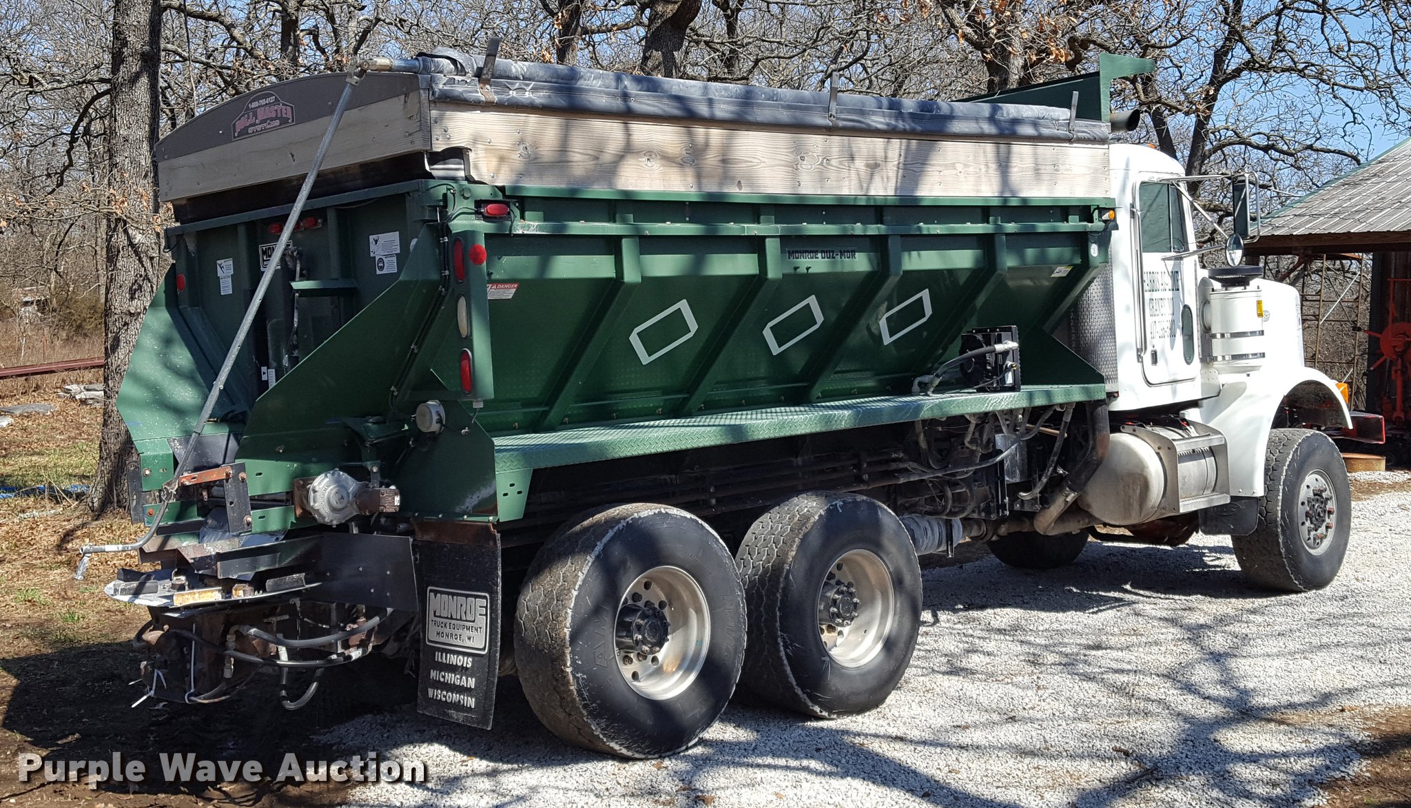 1996 Peterbilt 357 applicator truck. 325,291 miles on odometer Miles may vary, still in use, Caterpillar 3306 10.5L L6 turbo diesel engine, Eaton Fuller eight speed manual transmission, Tandem axle, Six wheel drive, Heat, Air suspension seat, PTO, Wet kit, Monroe dry spreader bed 16'L, 32"W walking floor, Dual spinners, Manual end gate, Roll tarp, Walking beam suspension, Air brakes, 445/65R22.5 tires, GVWR 68,000 lbs, FAWR 20,000 lbs, IAWR 20,000 lbs, RAWR 23,000 lbs, Contents not included. Missouri title. 1XPAMA0X4TN409328. 8021 E Hwy K. Stockton, MO 65785