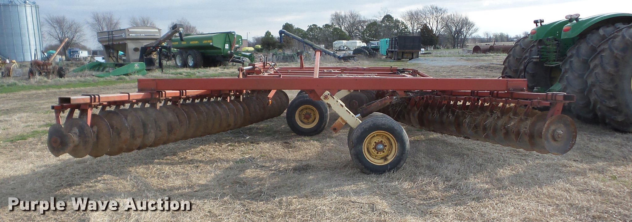 Purple Wave is selling a used Disk in Oklahoma. This item is a Krause 3990 double offset disk with the following: 34'W, 19" diameter front blades, 20.5" diameter rear blades, 9" spacing, Disk scrapers, Manual leveler, Hydraulic fold, Pin/clevis hitch, 11L-15 tires, Serial 1035