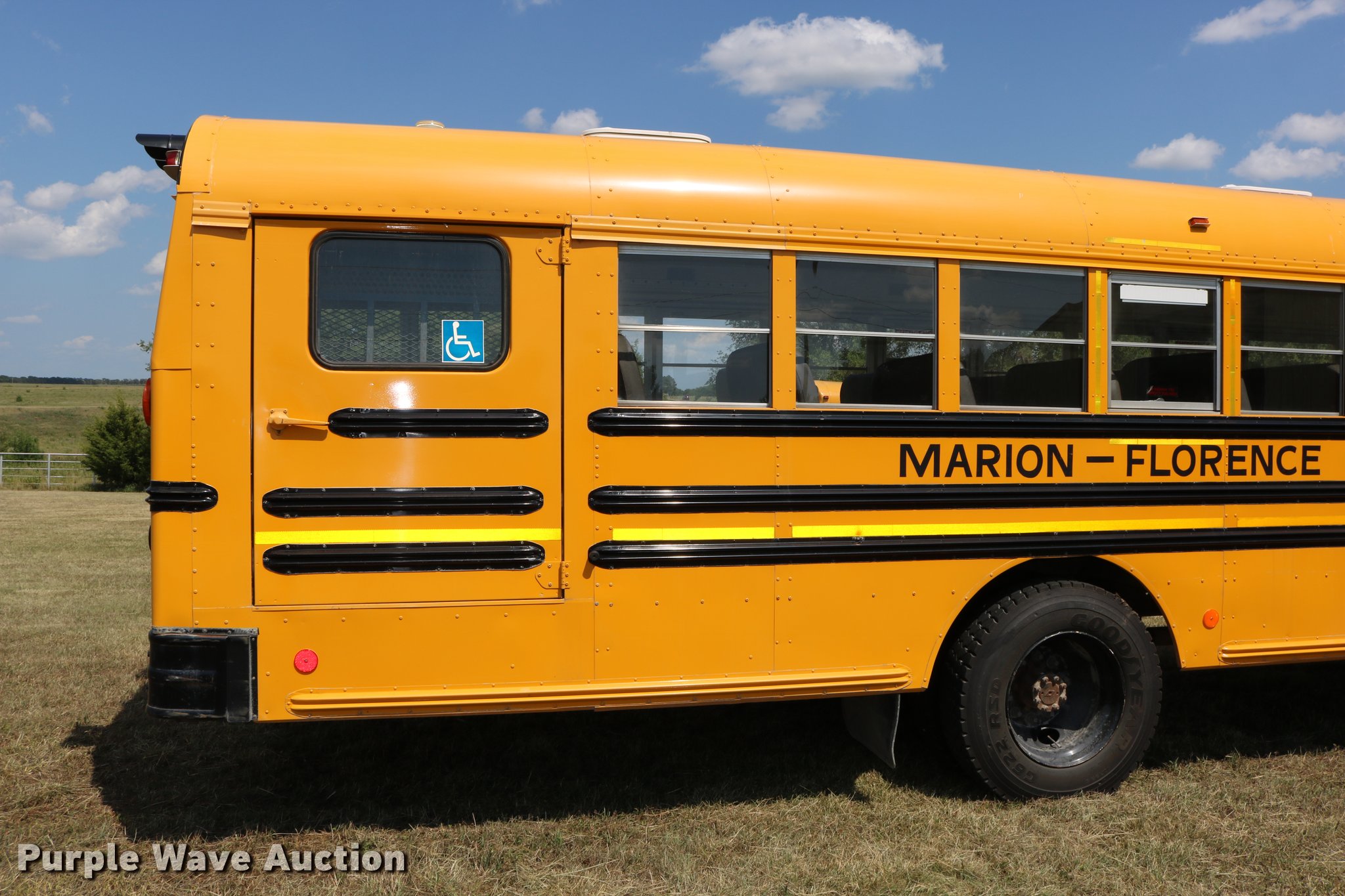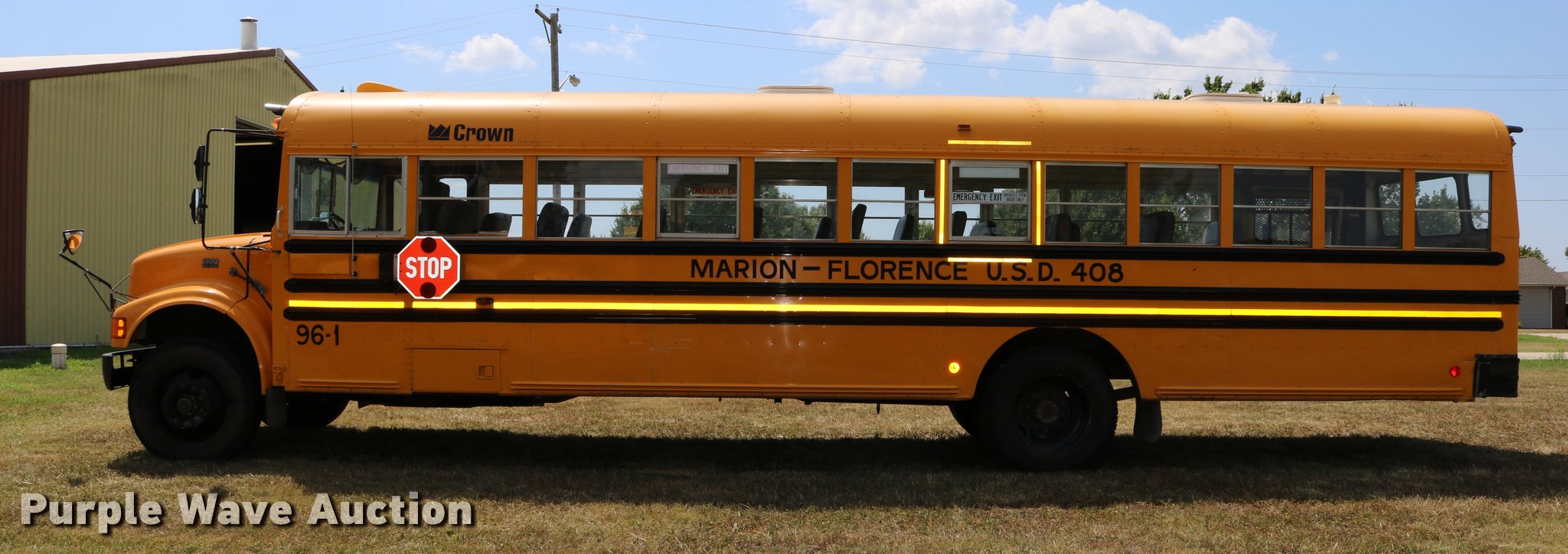 1997 International 3800 bus. 33,081 miles on odometer, International DT466 7.6L L6 turbo diesel engine, Automatic transmission, Single axle, Heat, AM/FM, Heated mirrors, 48 passenger capacity, Braul L208U64AR5 Series 5 wheel chair lift Serial 2211, (2) wheel chair tie downs, Ceiling, rear, and side emergency exits, Emergency door alarms, Lighted stop sign, Beacon light, Block heater, Backup alarm, Front and rear tow hooks, Approximately 254" wheelbase, Spring suspension, Hydraulic brakes, 10R22.5 tires, GVWR 29,000 lbs, Odometer replaced at 80,287 miles, Two way radio is not included, Engine issues Engine knock, Possible down draft tube, Unit# 96-1. Kansas title. 1HVBBAAP3TH379998. USD 408. 1500 E Main St. Marion, KS 66861
