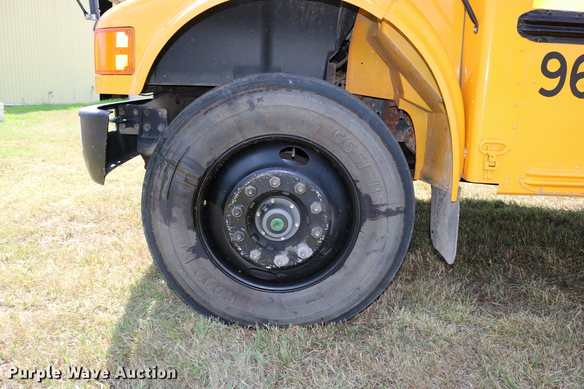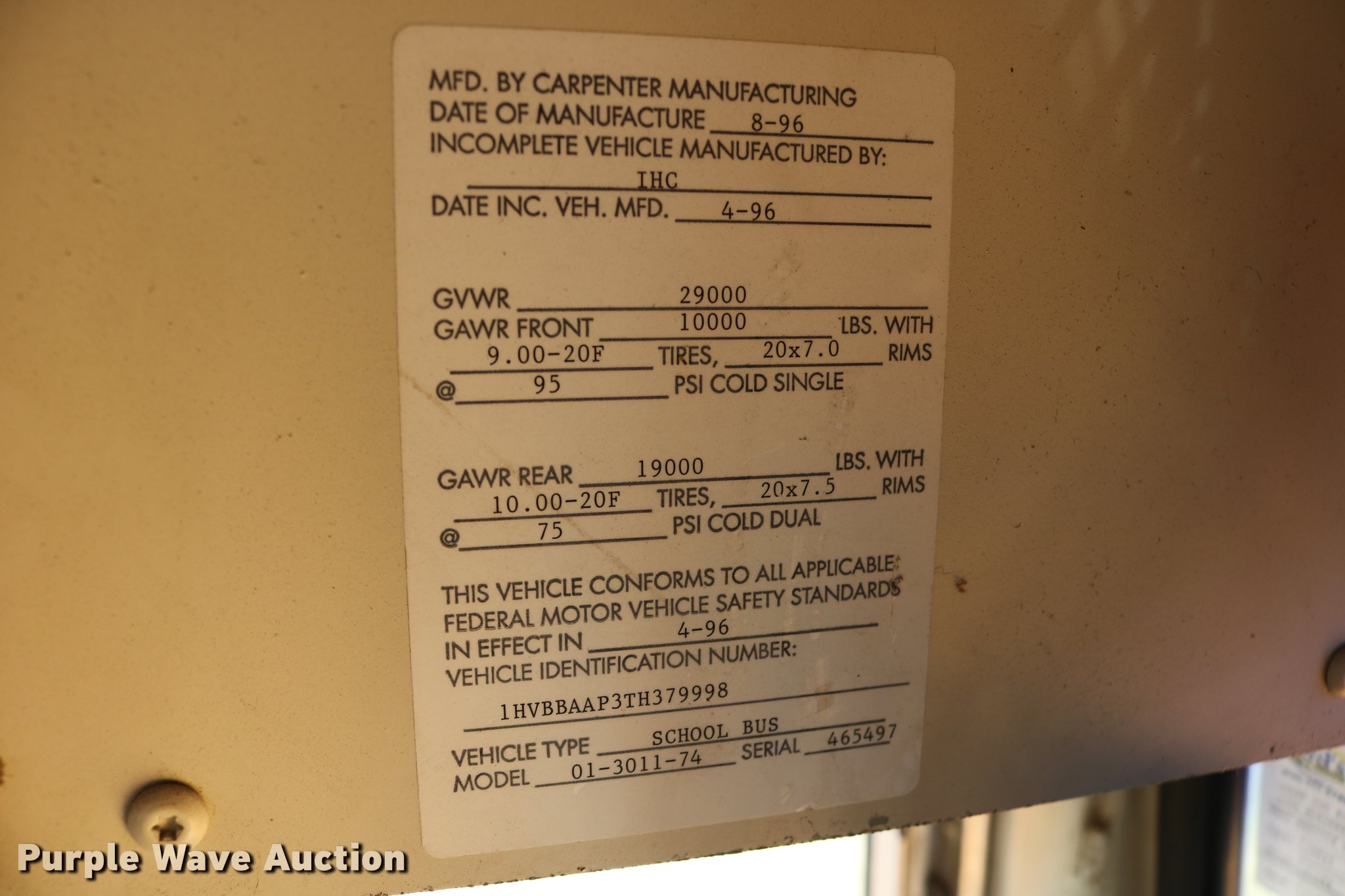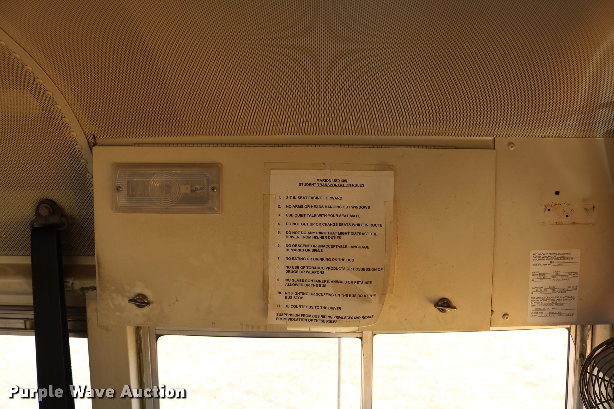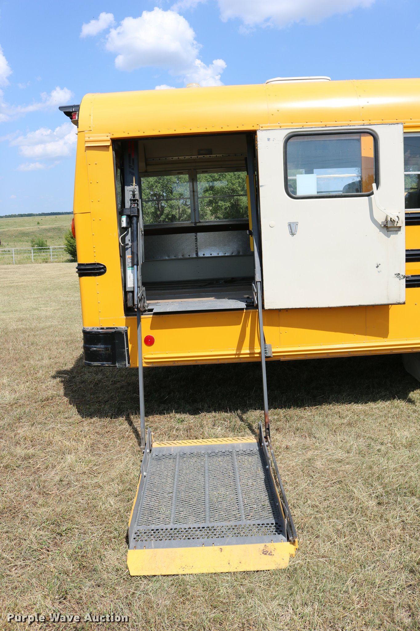 Purple Wave is selling a used Bus in Kansas. This item is a 1997 International 3800 bus with the following: 33,081 miles on odometer, International DT466 7.6L L6 turbo diesel engine, Automatic transmission, Single axle, Heat, AM/FM, Heated mirrors, 48 passenger capacity, Braul L208U64AR5 Series 5 wheel chair lift, Serial 2211, (2) wheel chair tie downs, Ceiling, rear, and side emergency exits, Emergency door alarms, Lighted stop sign, Beacon light, Block heater, Backup alarm, Front and rear tow hooks, Approximately 254" wheelbase, Spring suspension, Hydraulic brakes, 10R22.5 tires, GVWR 29,000 lbs, Odometer replaced at 80,287 miles, Two way radio is not included, Engine issues, Engine knock, Possible down draft tube, Unit# 96-1